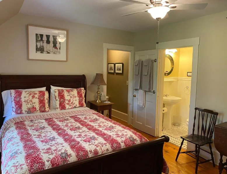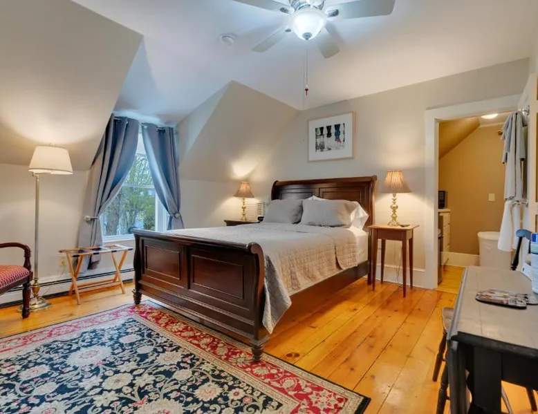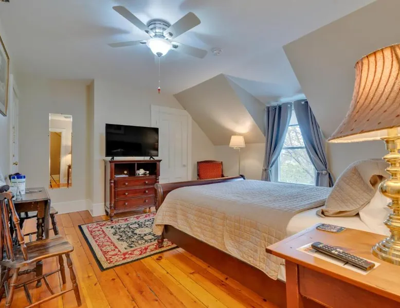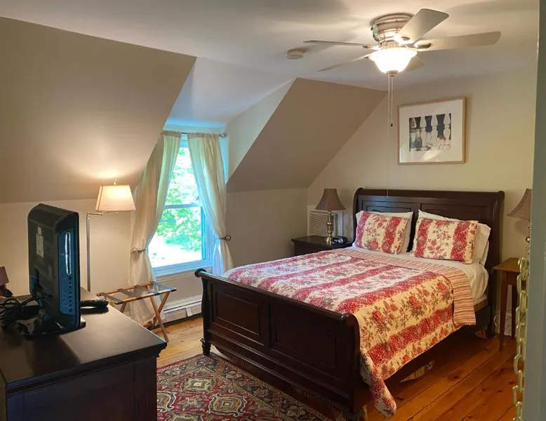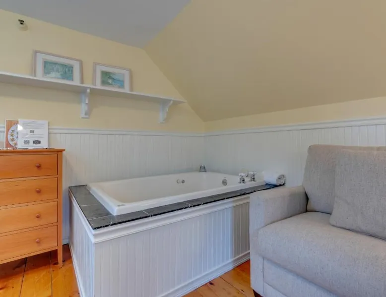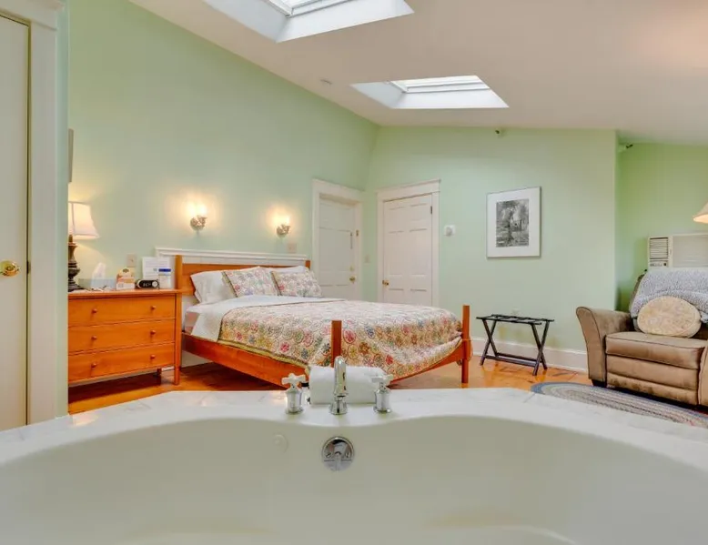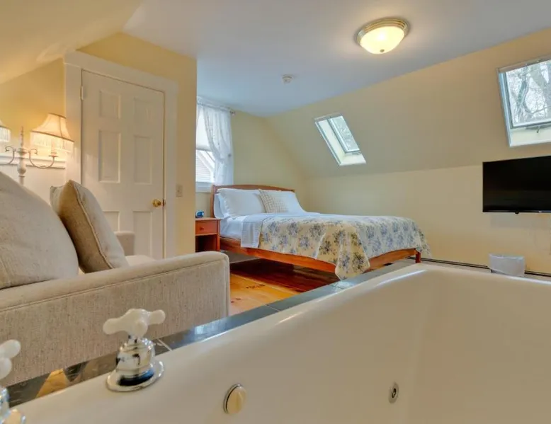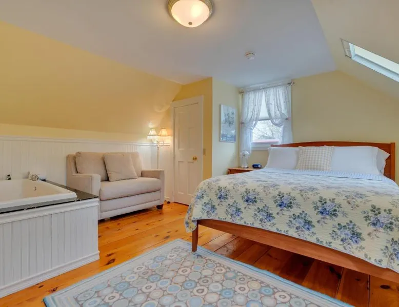 Historic Setting: James Place Inn Bed and Breakfast in Freeport offers a 5-star experience within a historic building. Guests enjoy a sun terrace, lush garden, and free WiFi throughout the property. Comfortable Accommodations: Rooms feature air-conditioning, private bathrooms with walk-in showers, and parquet floors. Additional amenities include balconies, kitchenettes, and spa baths, ensuring a relaxing stay. Exceptional Services: The property provides a paid airport shuttle service, lounge, wellness packages, and yoga classes. Free on-site private parking, an indoor play area, and family rooms cater to all guests. Prime Location: Located 21 mi from Portland International Jetport, the inn is near attractions such as Bowdoin College (11 mi) and Portland Museum of Art (17 mi). Guests appreciate the convenient location and excellent service. Located on the first floor, this room features skylights, a flat-screen TV with DVD player and a private bathroom with a spa bath.