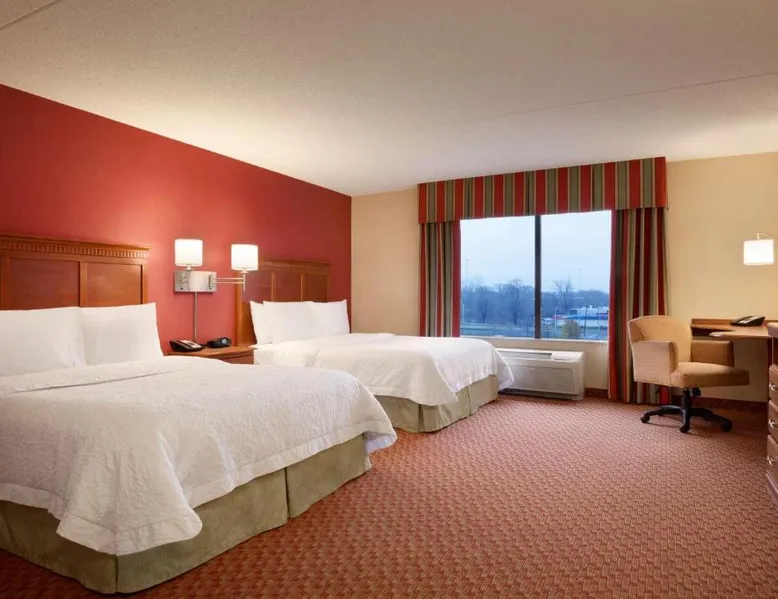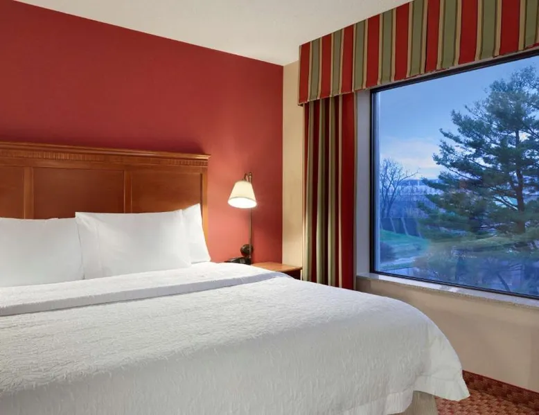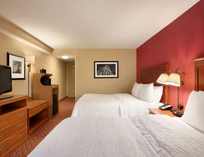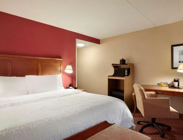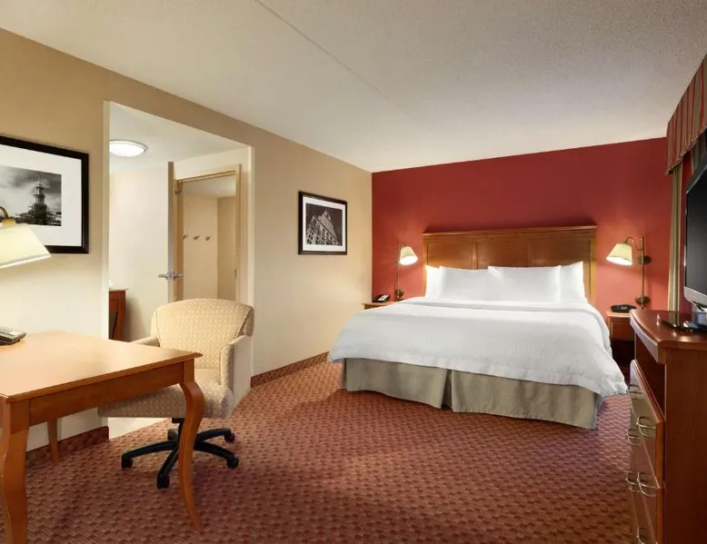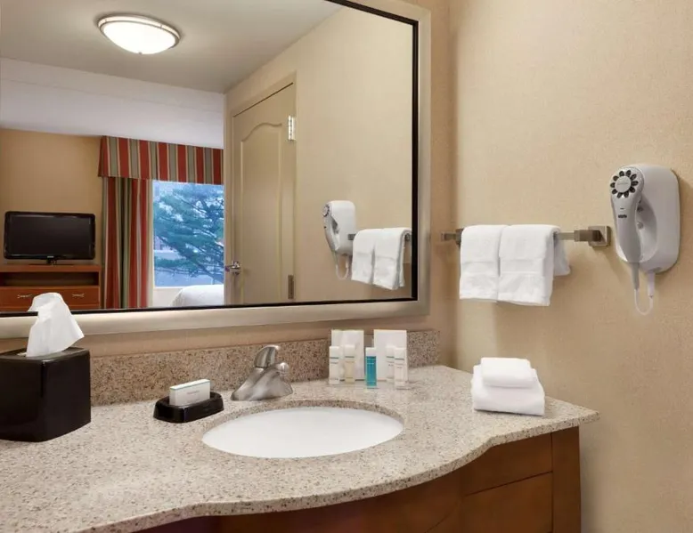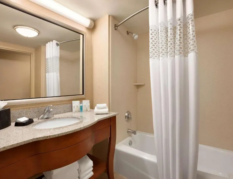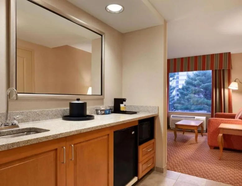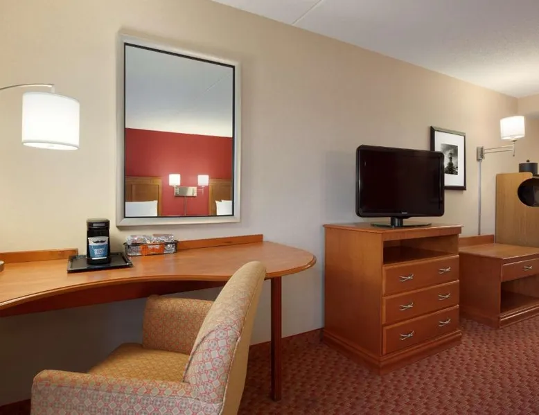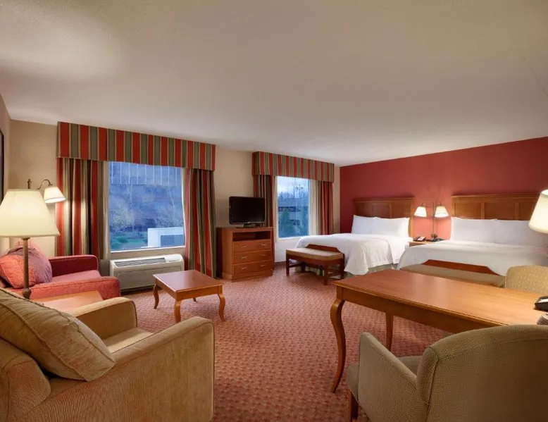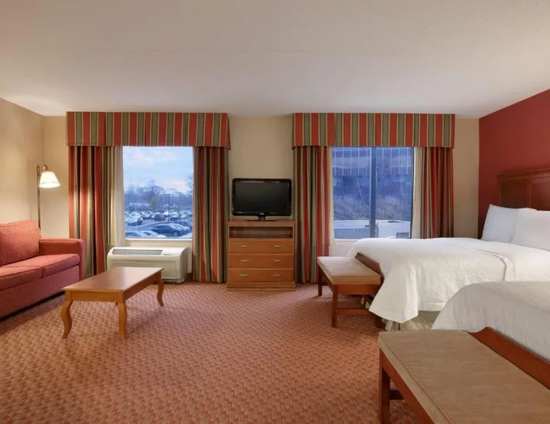 Hampton Inn and Suites East Hartford offers spacious rooms with flat screen TV’s, free Wi-Fi, and plush bedding. Downtown Hartford is a 5-minute drive from the hotel. Cable TV with HBO channels is available in every room along with a work desk and a coffee maker. Rooms offer a sitting area with sofa beds available in select rooms. This Hampton Inn also features a hot breakfast and a 24-hour fitness and business center. Guests can also lounge on the outdoor terrace. Mark Twain House and Museum is 3 miles away and the Hartford Stage is a 5-minute drive from the property. This room features a flat-screen TV, microwave, refrigerator, and a separate sitting area with a sofa bed.
