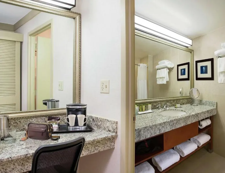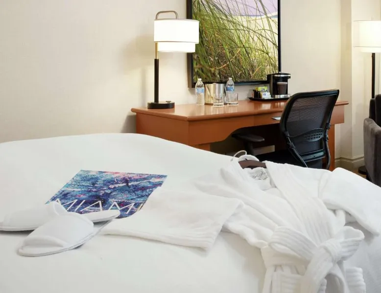 Located off the Dolphin Expressway (Highway 836), just 8 minutes' drive from Miami International Airport, this hotel offers a free airport transfer service and on-site dining options. A flat-screen cable TV is provided in each room and offers Pay-Per-View movie channels and video games. A coffee machine, desk, and private bathroom are also included. Impressions is a casual restaurant at Miami Airport Doubletree which serves American fare for breakfast and lunch. Rioja specializes in steaks for dinner or enjoy an evening meal at DoubleShot Tapas and Burger Bar. Doubletree Miami Airport Convention Center is adjacent to the Blue Lagoon Business District. The Miami International Merchandise Mart, which offers 300 stores and show rooms as well as meeting and exhibit space, is 4 minutes' walk away. The Port of Miami, South Beach and historic Coconut Grove are just minutes away. This spacious suite includes a seating area and 37-inch LCD TV. Additional facilities include an alarm clock radio with MP3 connection, a coffee maker and a 2-line speaker-phone.