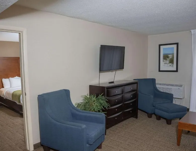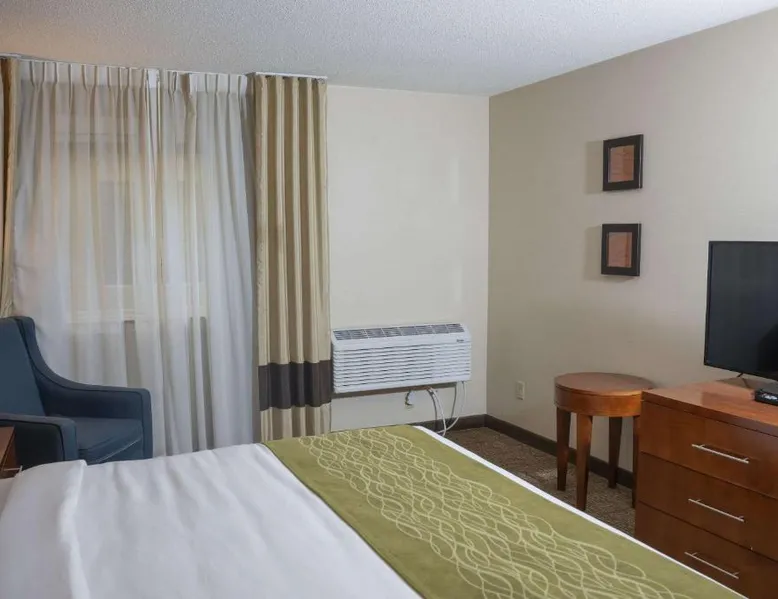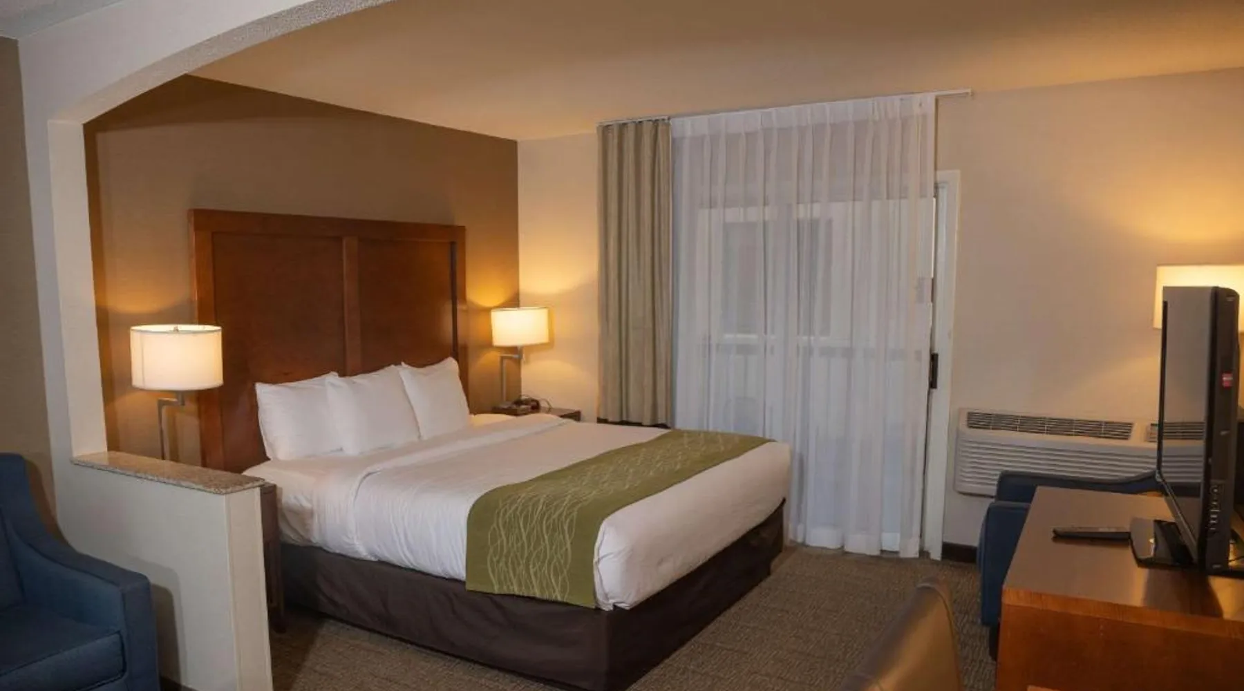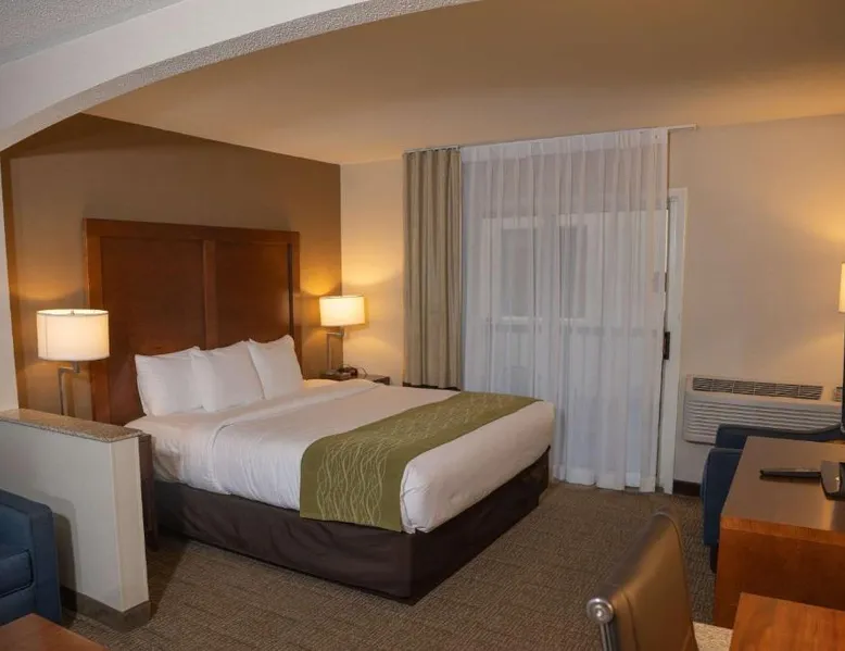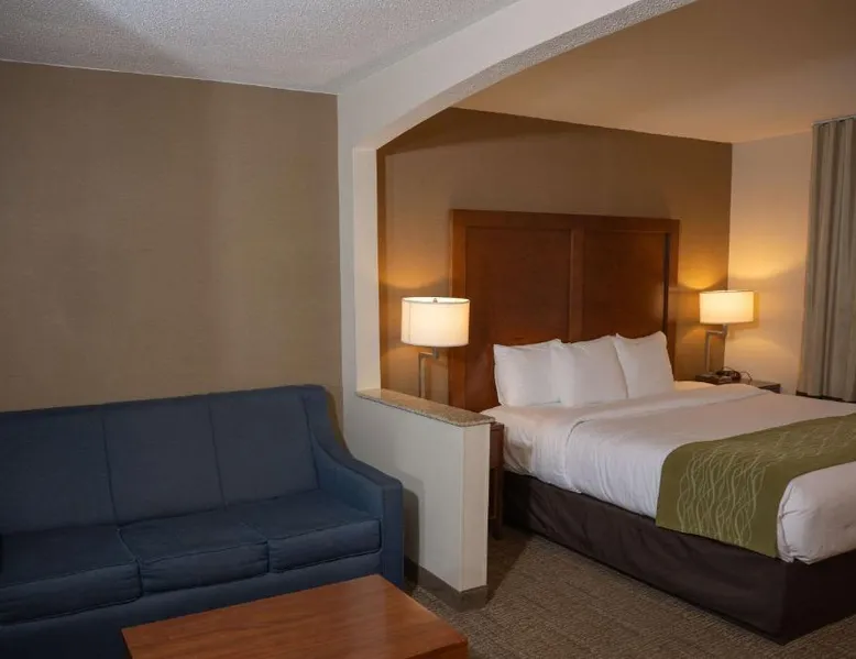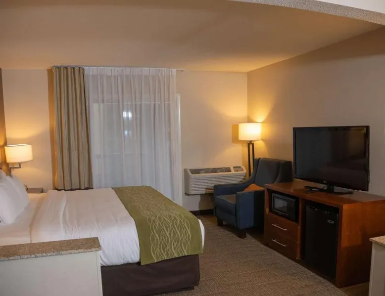 Located directly off Interstate 90, the Comfort Inn & Suites Erie - Splash Lagoon Indoor Waterpark Erie is connected to Pennsylvania's largest indoor water park resort, Splash Lagoon. It is on the Peach Street, which is central to most shopping, dining and entertainment opportunities in the Erie area. The Erie Zoo, Erie Insurance Arena and Erie International Airport are all in close proximity to the hotel. Hotel amenities and features include, free wireless high-speed Internet access in all guest rooms and public areas, free shuttle service to the airport, free newspaper, and fresh coffee available 24 hours a day. The 24-hour fitness center and indoor heated pool may be areas where our guests can enjoy themselves. All guest rooms have coffee makers, hair dryers, irons, ironing boards and cable television with HBO. Laptop size in-room safes are also provided with an optional fee. A 42-inch flat-screen TV with premium channels, a spa bath, and a desk are featured in this room.
