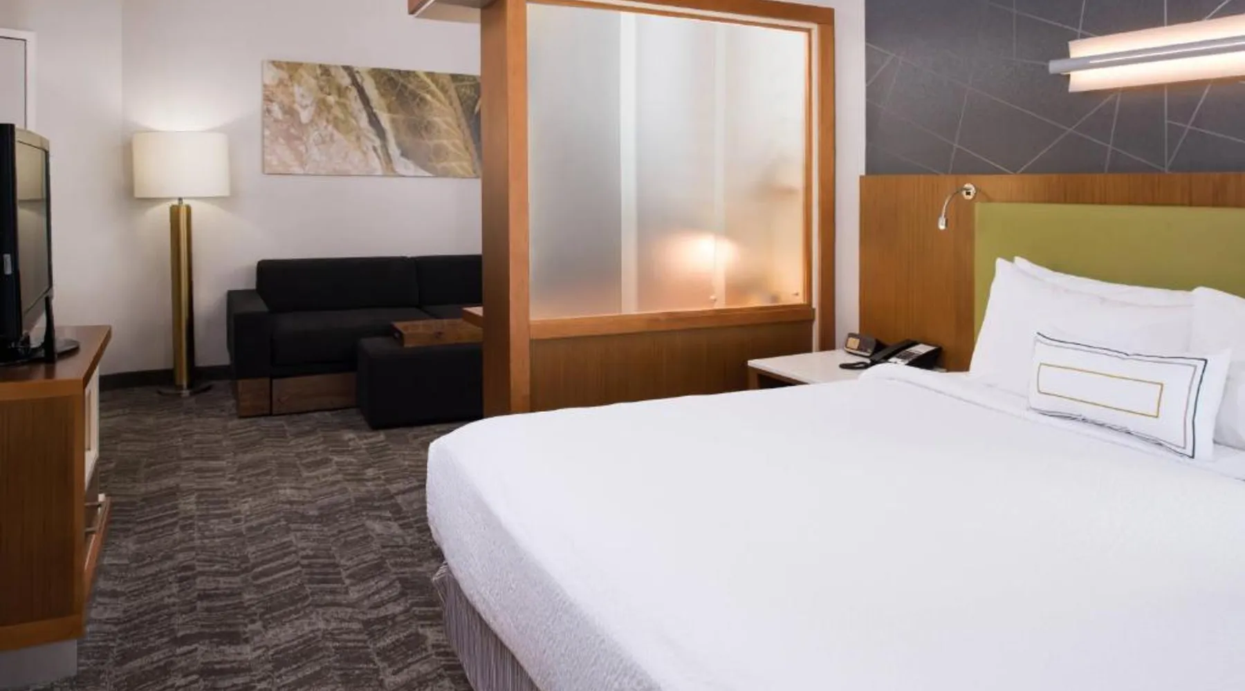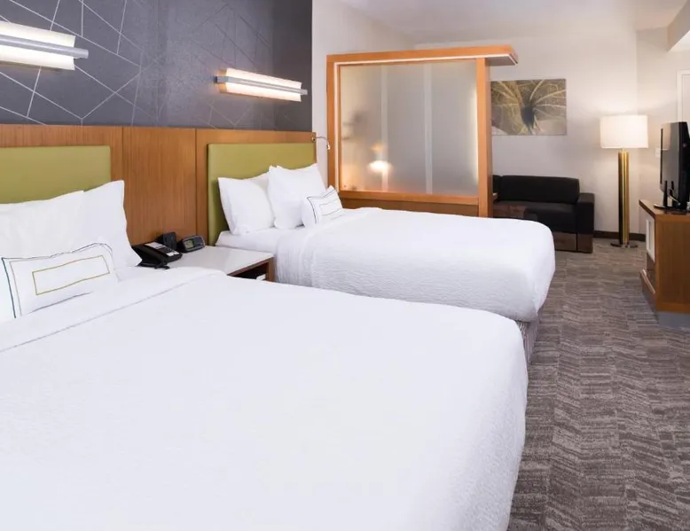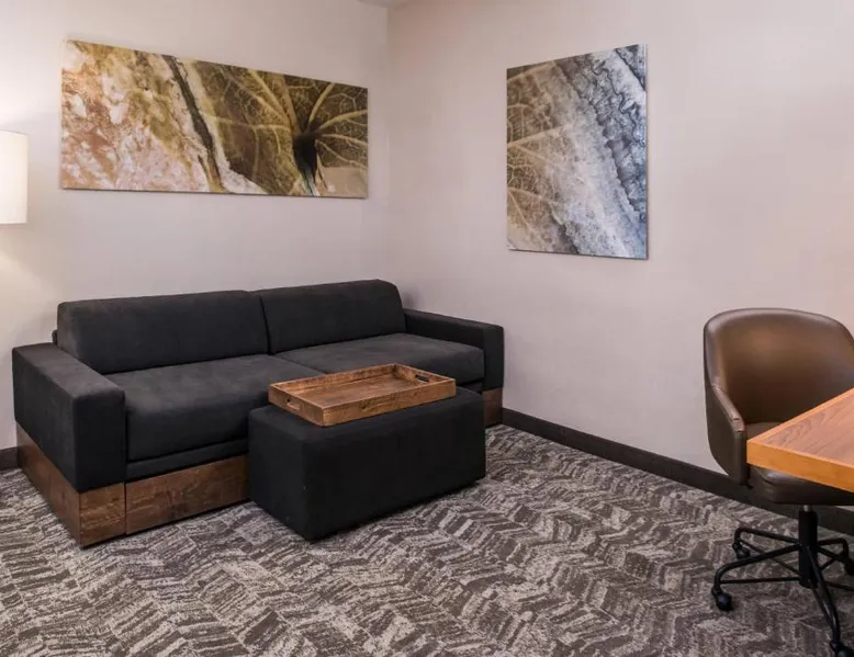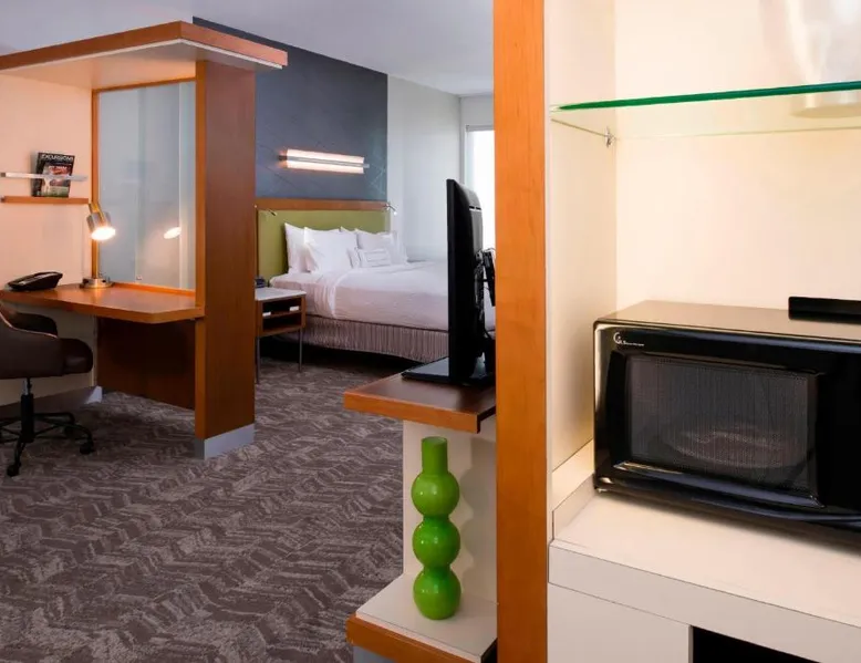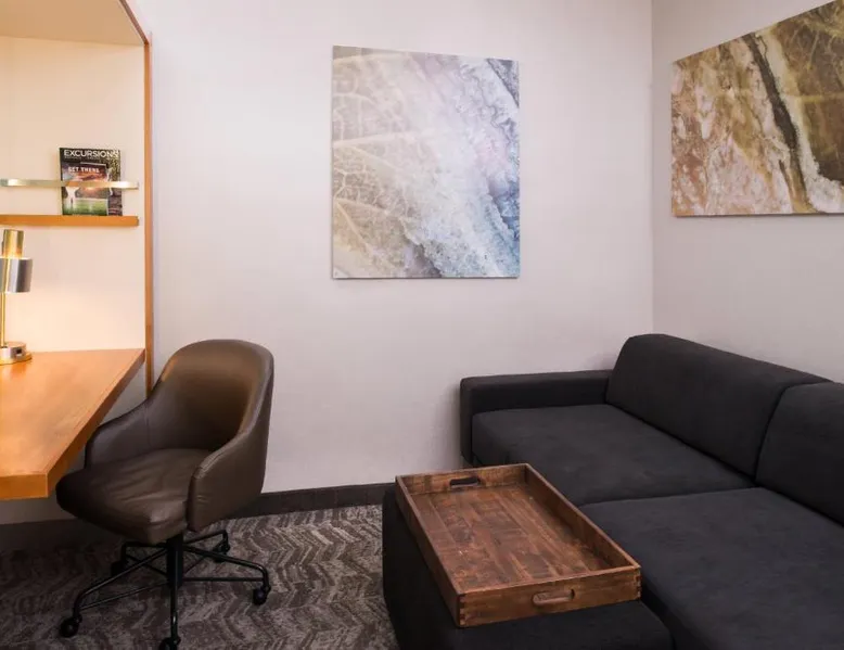 Comfortable Accommodations: SpringHill Suites by Marriott Huntsville Downtown in Huntsville offers family rooms with air-conditioning, private bathrooms, and free WiFi. Each room includes a bath or shower, hairdryer, coffee machine, refrigerator, work desk, seating area, free toiletries, microwave, TV, and sofa. Leisure Facilities: Guests can enjoy a fitness center, seasonal outdoor swimming pool, and free on-site parking. Additional amenities include a 24-hour front desk, free toiletries, and a seating area. Prime Location: Located less than 0.6 mi from Von Braun Center and 12 mi from Huntsville International Airport, the hotel is near attractions such as Alabama A&M University (5 mi) and Big Spring Park (25 mi). An ice-skating rink is also in the surroundings. Guest Satisfaction: Highly rated for its attentive staff, excellent breakfast, and immaculate rooms. This suite features a seating area with microwave, refrigerator and sofa bed. A flat-screen TV, iPod dock and tea/coffee maker are also included.