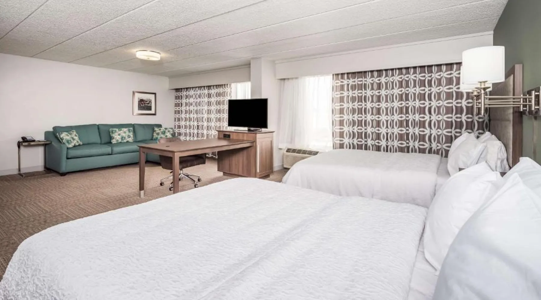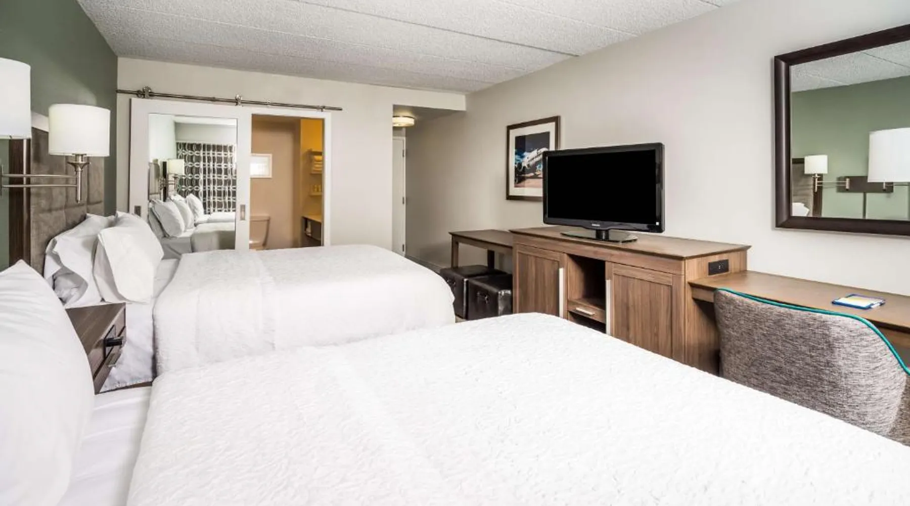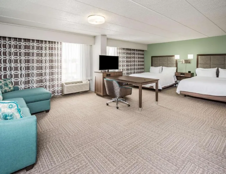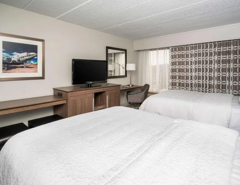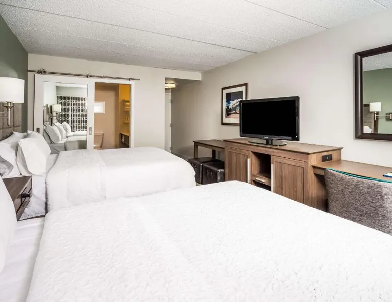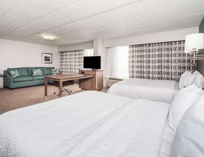 Comfortable Accommodations: Hampton Inn Dover in Dover offers comfortable rooms with free WiFi, air-conditioning, and modern amenities. Each room includes a tea and coffee maker, hairdryer, refrigerator, and TV. Leisure Facilities: Guests can enjoy a fitness center, seasonal outdoor swimming pool, and outdoor seating areas. Additional facilities include a lounge, fitness room, elevator, 24-hour front desk, concierge service, minimarket, child-friendly buffet, business area, picnic area, and barbecue facilities. Dining Options: A continental buffet breakfast is served daily, featuring fresh pastries, cheese, fruits, and juice. The property also offers a barbecue area for outdoor dining. Location and Attractions: Located 39 mi from New Castle Airport, the hotel is less than 0.6 mi from the Delaware State Police Museum and Education Center. Nearby attractions include Dover International Speedway (2.4 mi) and Delaware Agricultural Museum and Village (1.6 mi). Highly rated for breakfast, staff, and room cleanliness. This quadruple room features a tea and coffee maker and a flat-screen TV. The unit has 2 beds.