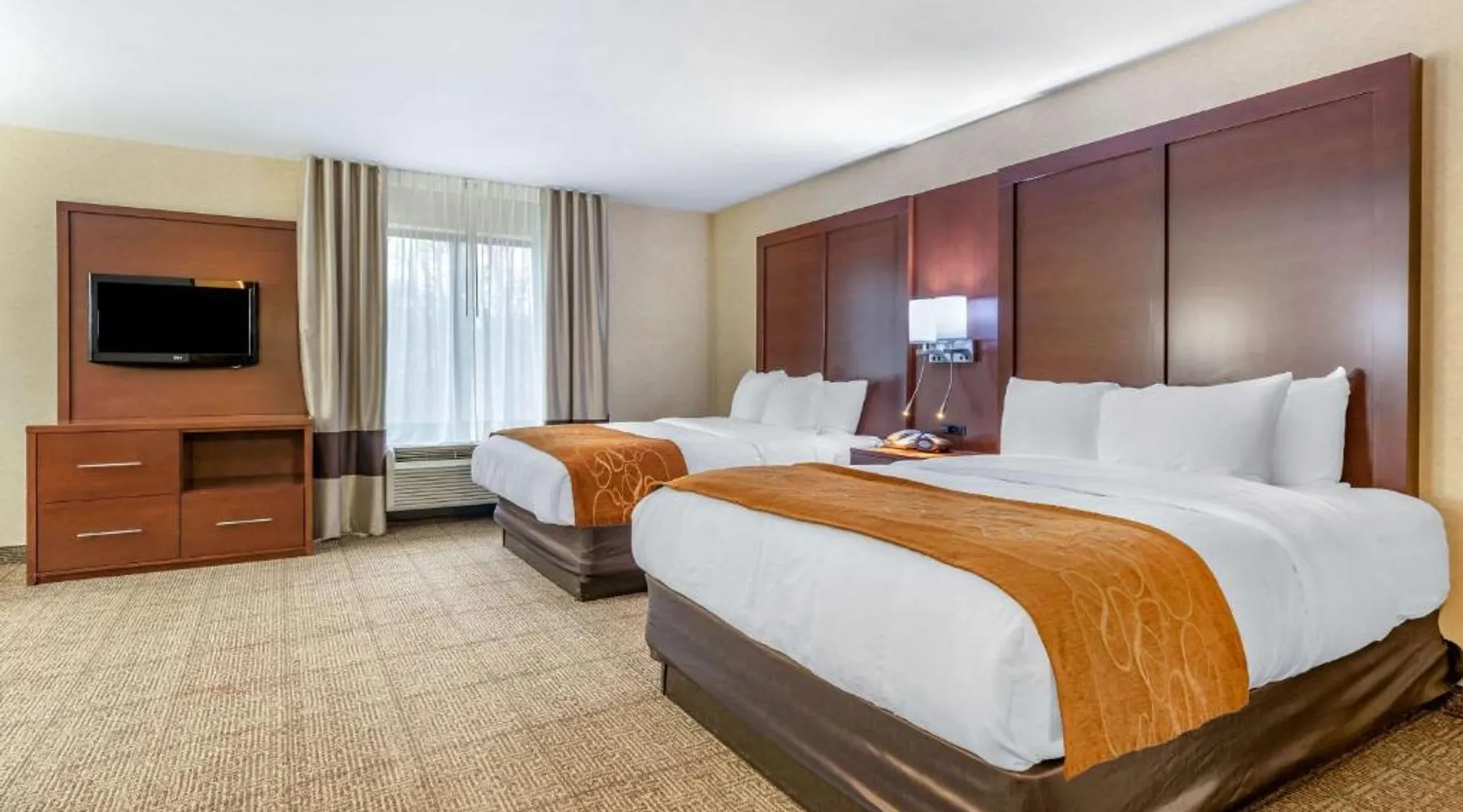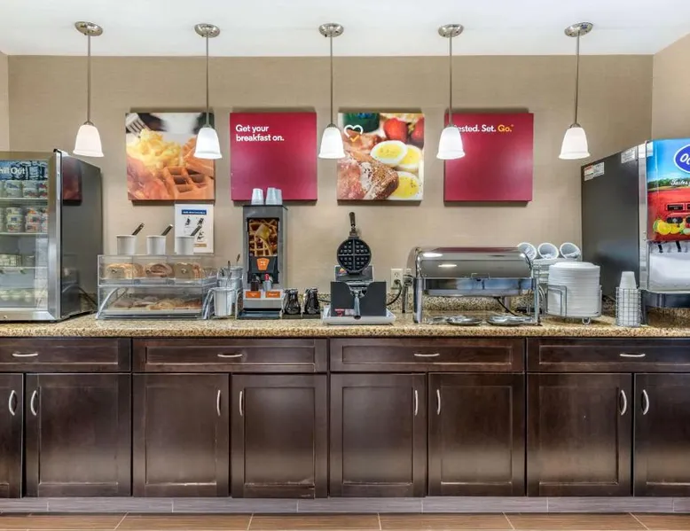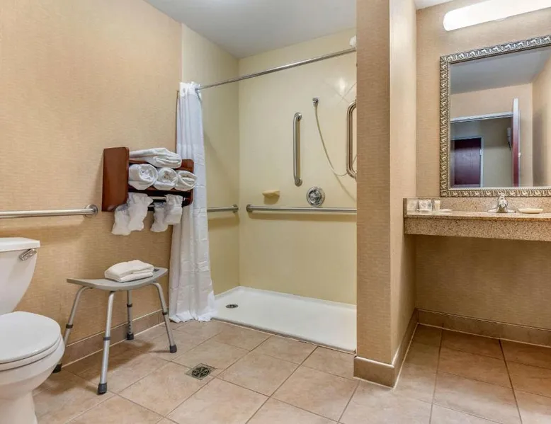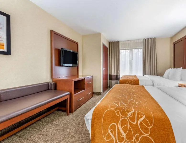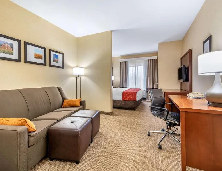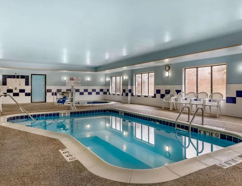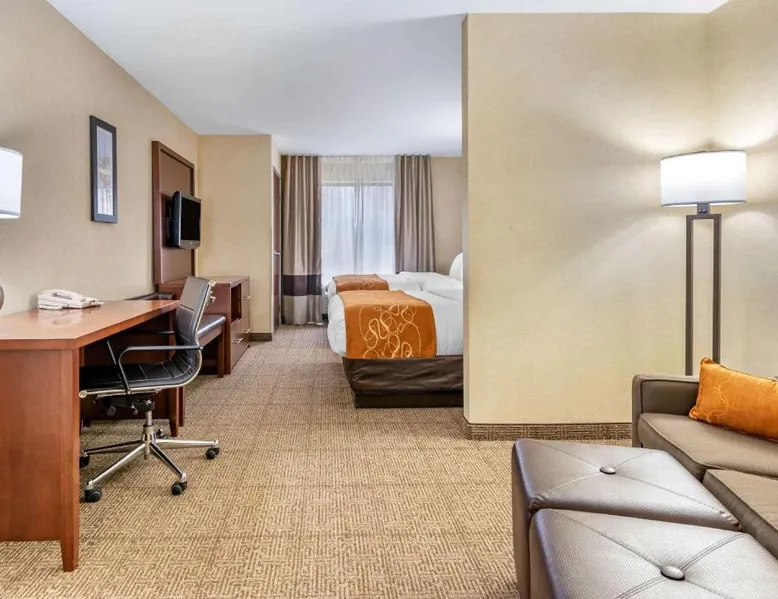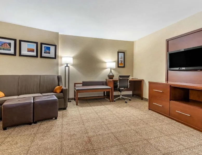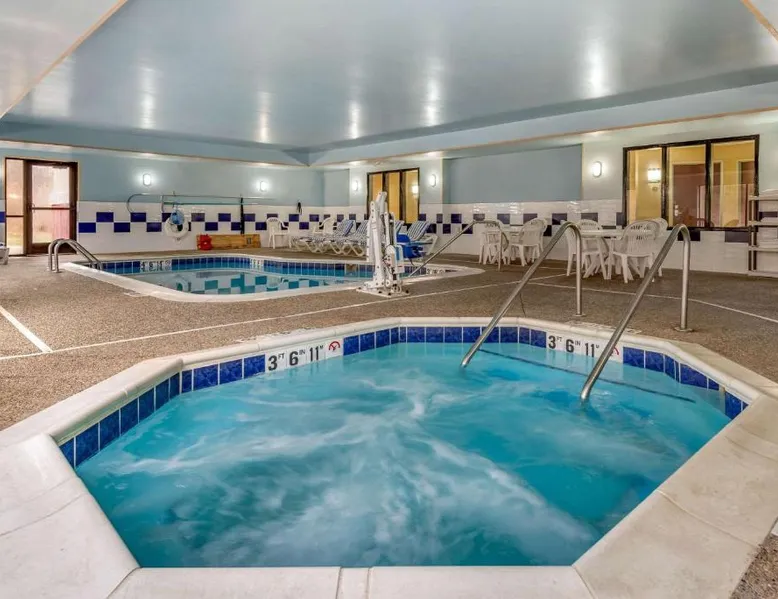 The Comfort Suites Elkhart South hotel is located off the Indiana East-West Toll Road, right in the heart of the Northern Indiana Amish Country. This hotel is close to the Midwest Museum of American Art, the National New York Central Railroad Museum, the RV / MH Hall of Fame museum, and the Elkhart County Historical Museum, which is housed in the historic Rush Memorial Center. The city of Elkhart is filled with RV manufacturers, dealers, service centers and various RV-related product retailers. Several recreational activities are nearby, and the city hosts a number of annual events and festivals throughout the year. Shopping opportunities are close to the hotel. A variety of restaurants, cocktail lounges and entertainment options are located in the surrounding area. Guests of this Elkhart, IN hotel will enjoy amenities and features like free high-speed Internet access, free coffee and free local calls. Your Morning Breakfast is full of options. Enjoy the free hot breakfast featuring eggs, meat, yogurt, fresh fruit, cereal and more, including your choice of hot waffle flavors! If you're leaving early, a Your Suite Success Grab & Go bag is available for the two hours prior to breakfast. After a busy day of meetings or an exciting day sightseeing, you'll be happy to relax in the indoor heated pool and hot tub. Be sure to take advantage of the on-site exercise room. Corporate travelers will appreciate conveniences like a public computer with Internet access and access to copy and fax services. Banquet and meeting facilities are located on the property. All guest rooms come equipped with refrigerators, microwaves, coffee makers, curved shower rods, desks, down pillows, sofa sleepers, flat-screen televisions, hair dryers, irons, ironing boards, pillow-top mattresses and cable television. Keep your electronic devices charged with the recharge device including AC and USB outlets provided in all guest rooms. In addition, some rooms feature whirlpool bathtubs. Laundry facilities are located on the premises for your added convenience. Offering free Wi-Fi and a 32-inch flat-screen cable TV, this room is equipped with tea and coffee-making facilities, a refrigerator and a microwave.