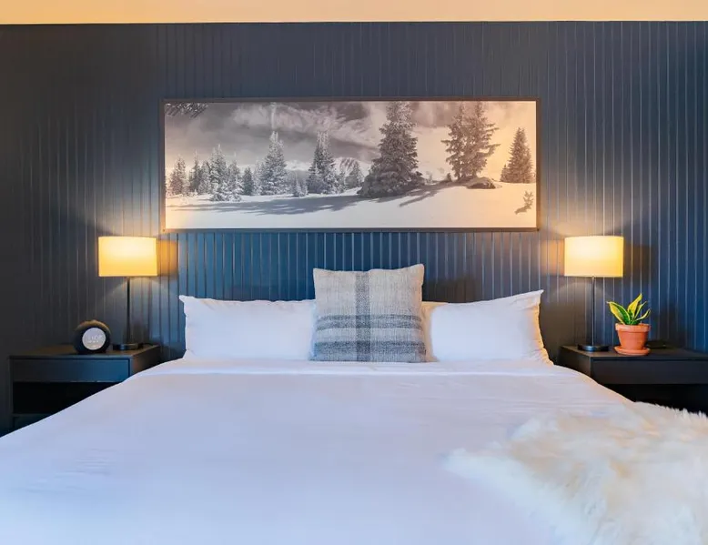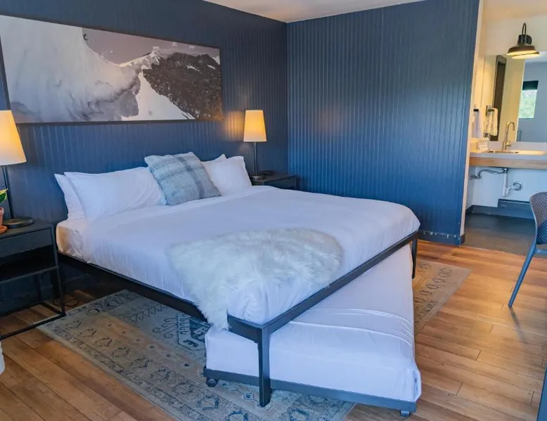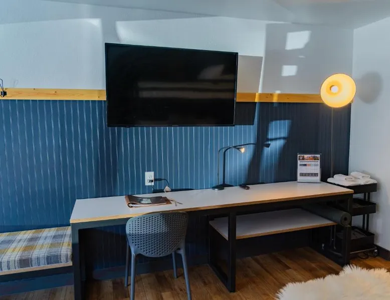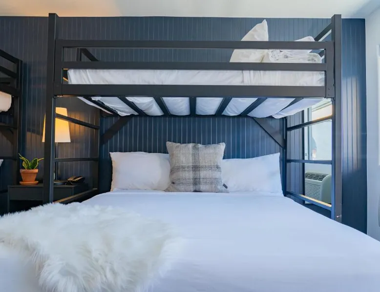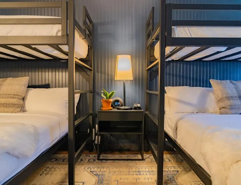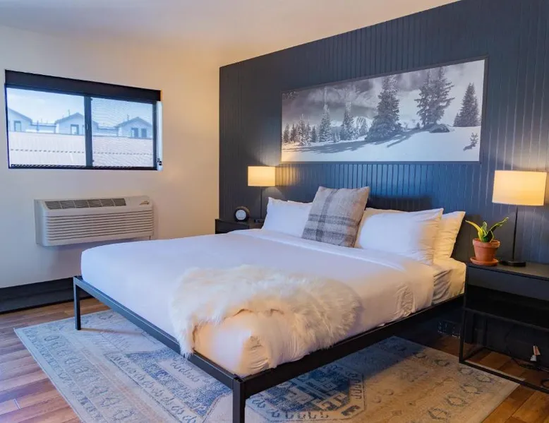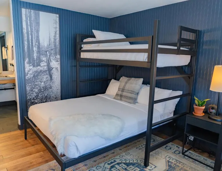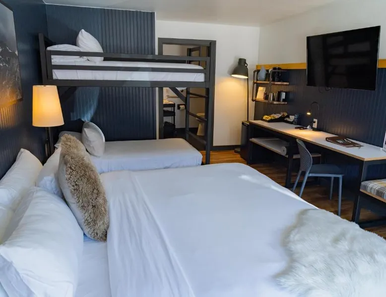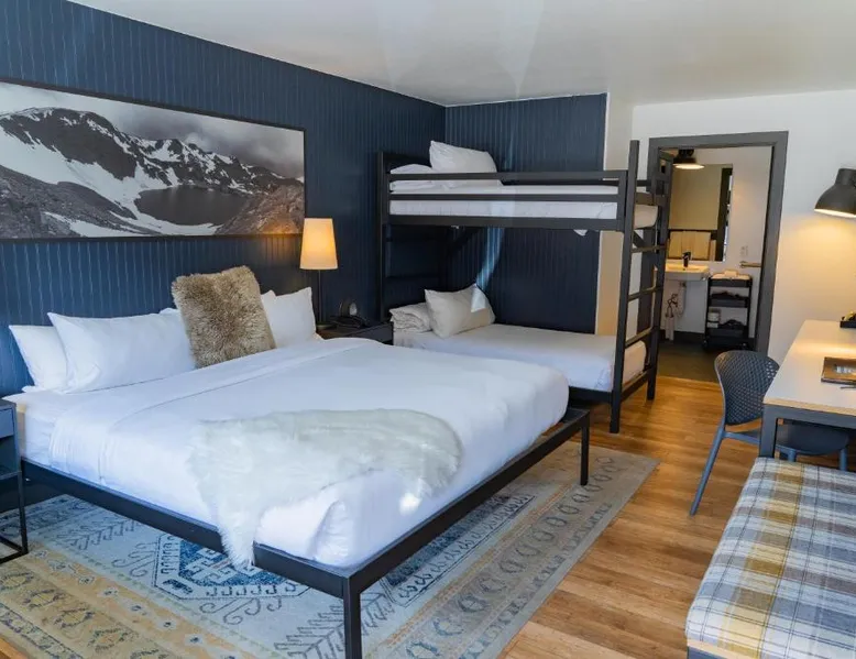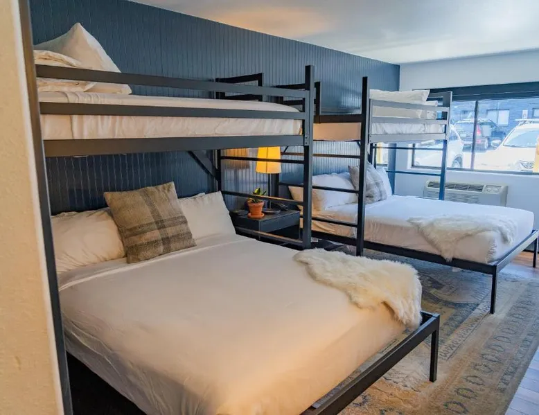 Comfortable Accommodations: Gravity Haus Winter Park in Winter Park offers family rooms with air-conditioning, bathrobes, refrigerators, work desks, mini-bars, TVs, and electric kettles. Each room includes a bath. Exceptional Facilities: Guests enjoy a fitness center, terrace, restaurant, bar, and free WiFi. Additional amenities include an outdoor fireplace, hot tub, coffee shop, outdoor seating area, picnic area, bicycle parking, and express check-in and check-out services. Dining Experience: The family-friendly restaurant serves American cuisine with gluten-free and dairy-free options. Lunch and dinner are available, along with cocktails. Convenient Location: Located 88 mi from Denver International Airport, the hotel is praised for its convenient location, comfortable beds, and attentive staff. The spacious quadruple room features air conditioning, a mini-bar, an electric kettle and a flat-screen TV. The unit has 2 beds.