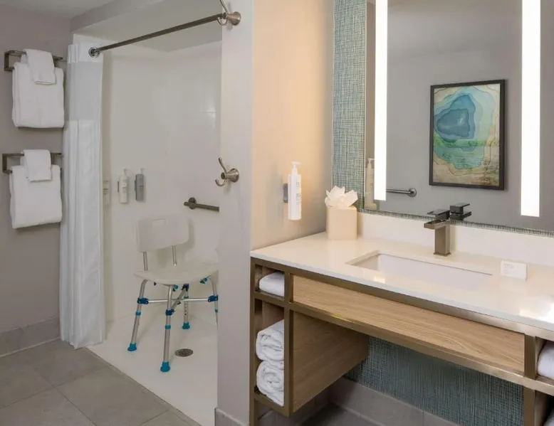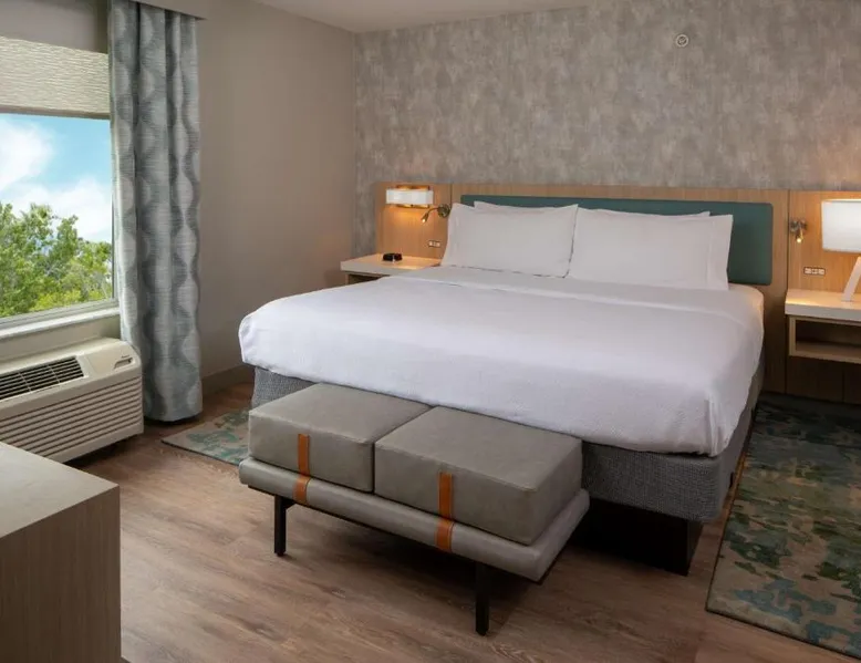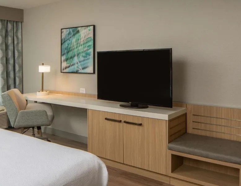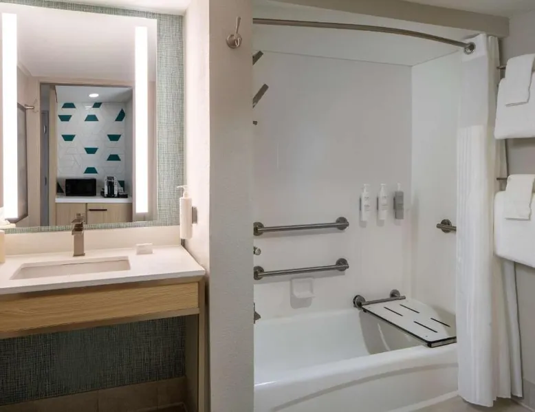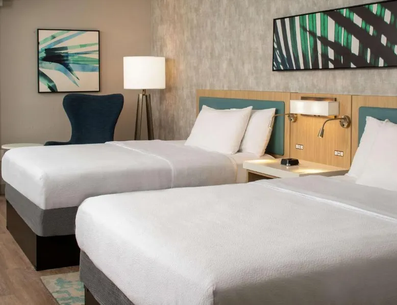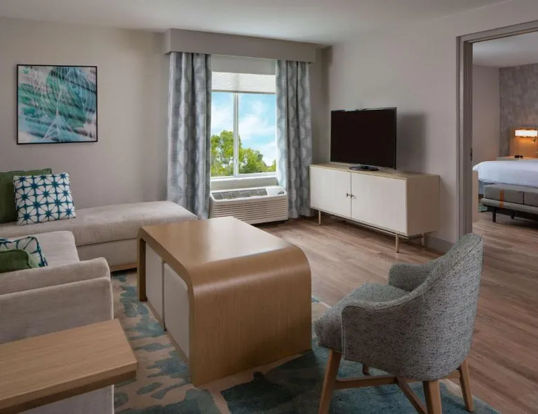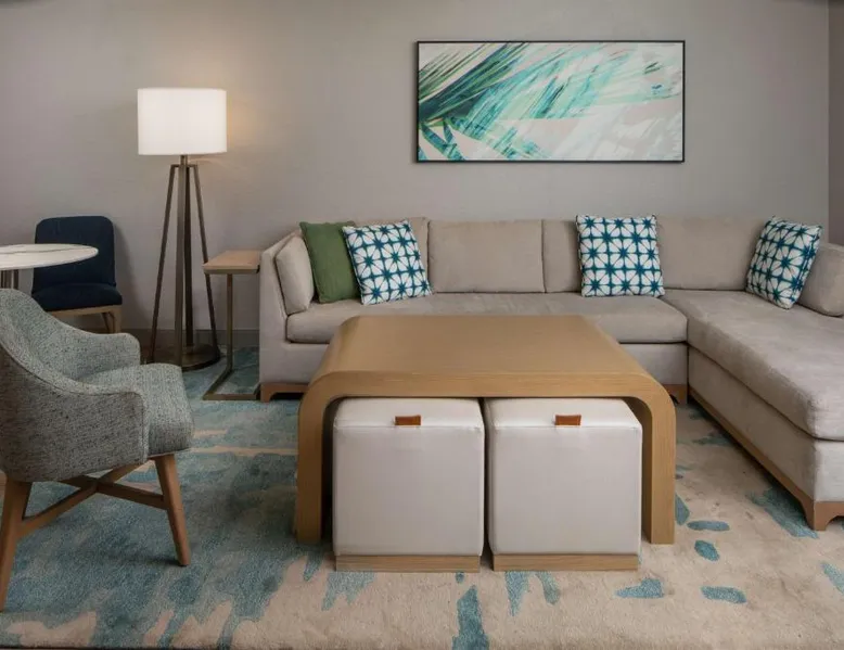 Comfortable Accommodations: Hilton Garden Inn Orlando Airport in Orlando offers family rooms with air-conditioning, free WiFi, and amenities such as a work desk, refrigerator, and TV. Each room includes a tea and coffee maker, hairdryer, and free toiletries. Dining and Leisure: Guests can enjoy an American buffet breakfast, a year-round outdoor swimming pool, and a bar. The hotel features a garden, restaurant, and a 24-hour front desk. Additional facilities include a elevator and paid on-site parking. Convenient Location: Located 3.1 mi from Orlando International Airport, the hotel is near attractions like Florida Mall (6.8 mi) and Universal Studios Orlando (12 mi). Guests appreciate the airport shuttle, connectivity, and the hotel's convenient location. This suite has a sofa, air conditioning and microwave. A TV with cable channels is also included.