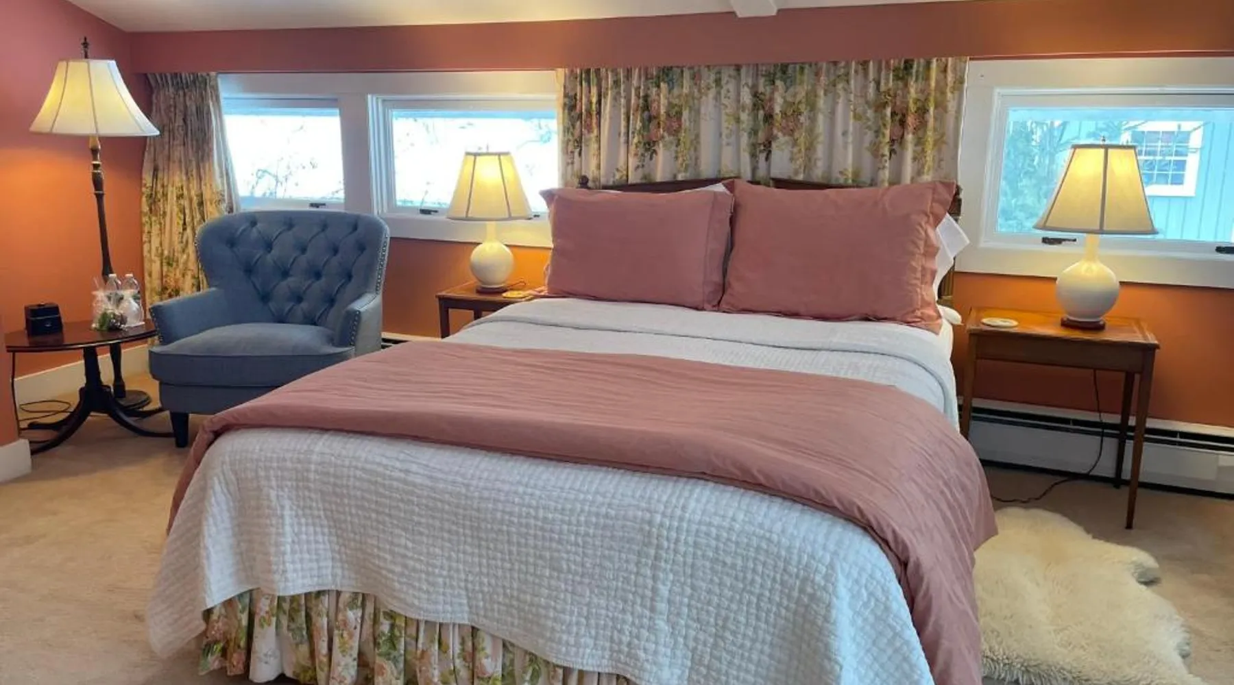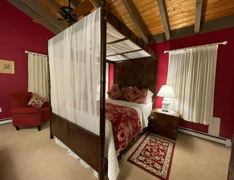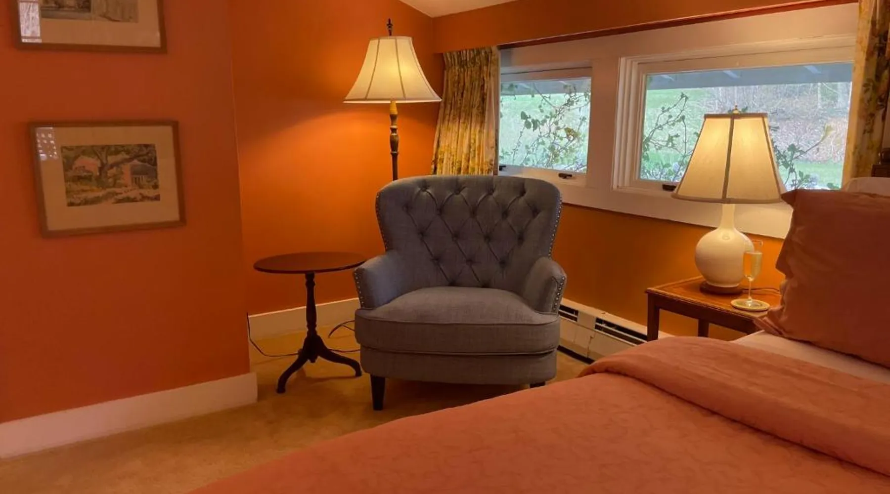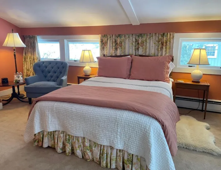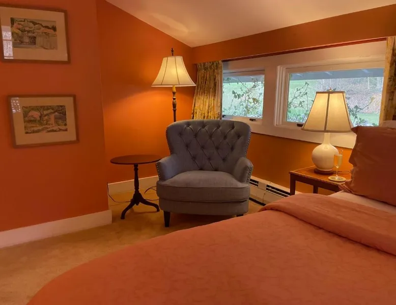 Elegant Accommodations: Deerhill Inn in West Dover offers a 5-star adults-only inn experience. Guests enjoy a swimming pool with stunning views, a sun terrace, and a lush garden. Free WiFi is available throughout the property. Comfortable Amenities: The inn features a bar, lounge, and outdoor seating area. Additional facilities include a fitness center, yoga classes, and ski pass sales point. Free private parking and electric vehicle charging are provided. Delicious Breakfast: A variety of breakfast options are available, including American, à la carte, vegetarian, and gluten-free. Guests can savor local specialties, fresh pastries, and a selection of fruits and juices. Prime Location: Located 58 mi from Rutland State Airport, the inn is near attractions such as Mount Snow Resort (1.9 mi) and Bennington Battle Monument (28 mi). Guests appreciate the friendly staff and comfortable rooms. This room features a spa bath, mountain views, and a balcony.