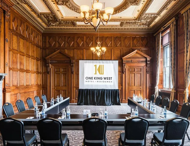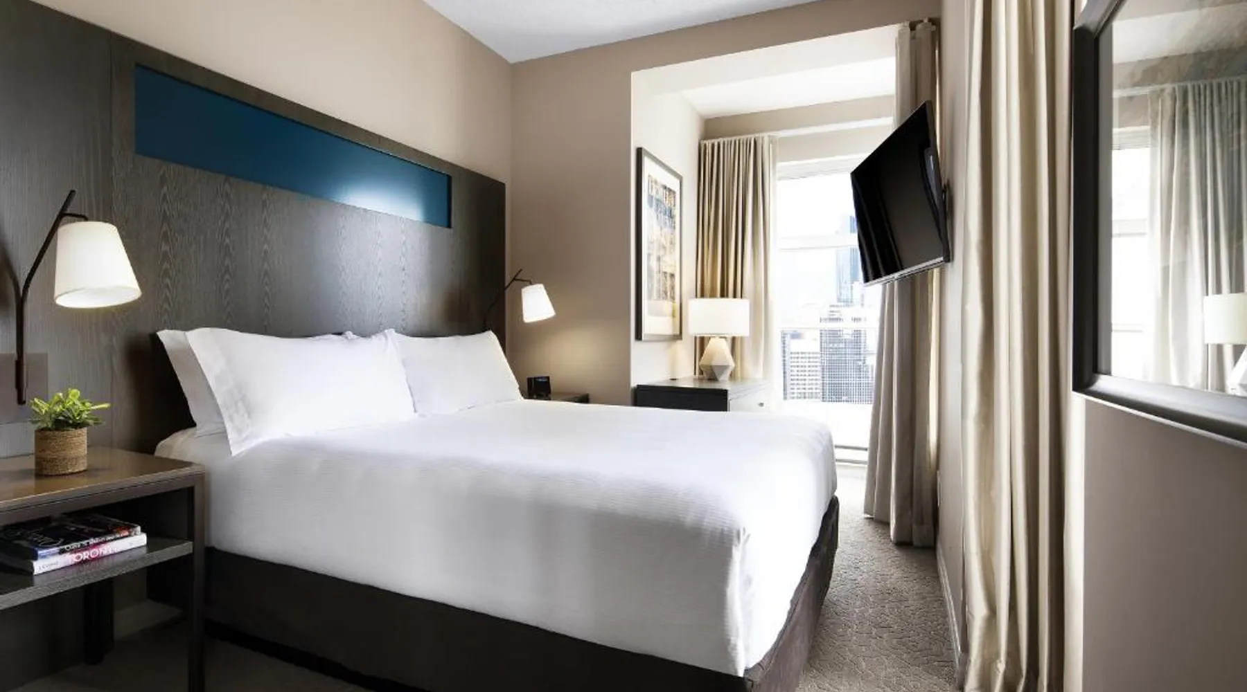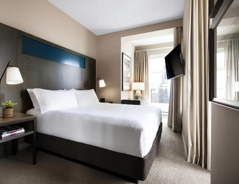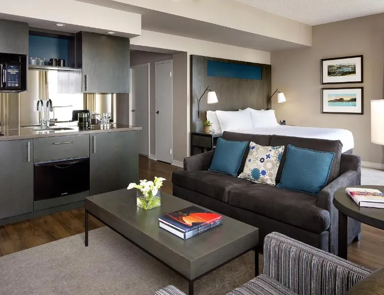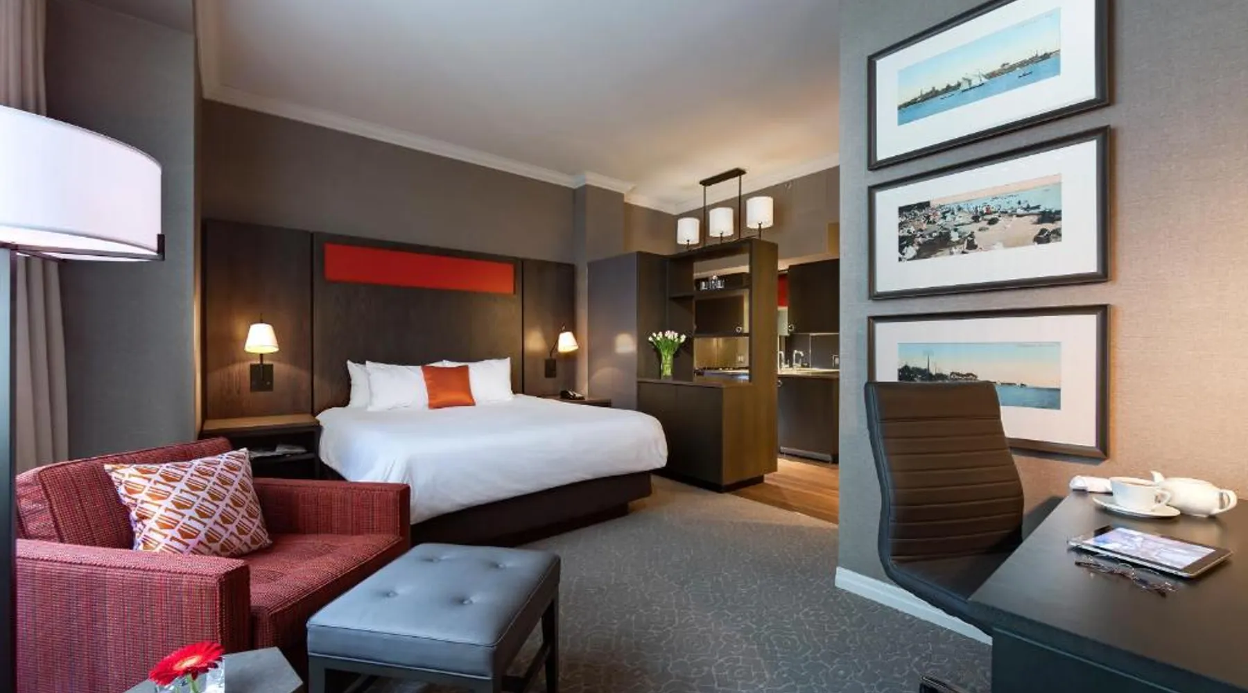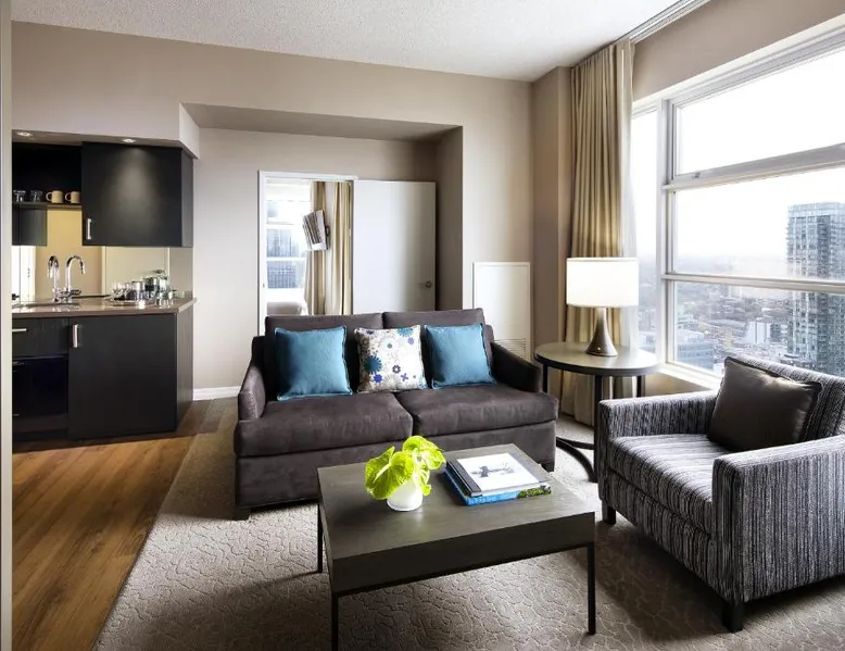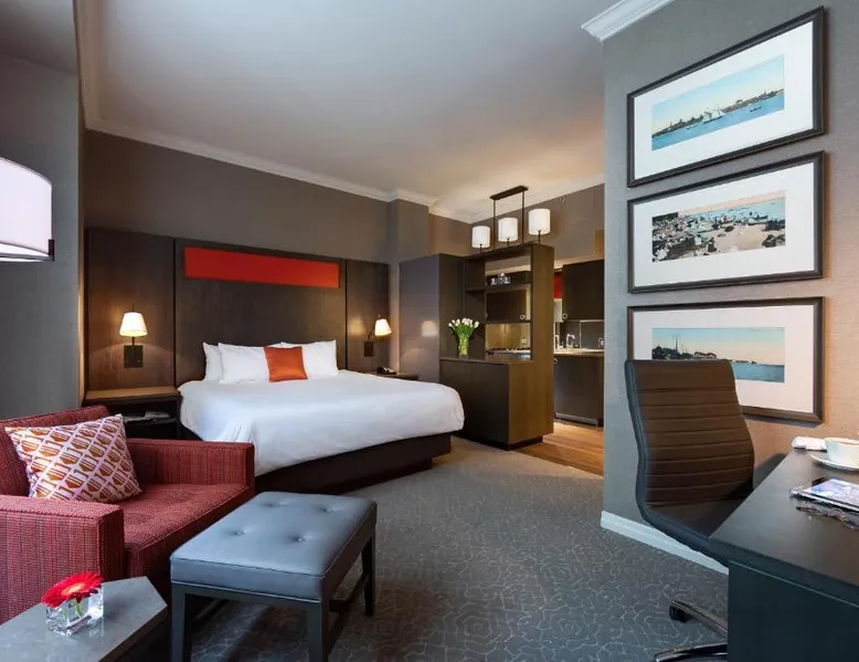 Built in 1914, this downtown Toronto hotel blends historic charm and elegance with modern conveniences. St. Lawrence Market and the Hockey Hall of Fame are less than 10 minutes' walk away. Accommodations at this all-suite hotel are furnished with a variety of thoughtful amenities, including microwaves, refrigerators and coffeemakers. They also feature separate sleeping, dining and working areas. One King West Hotel and Residence has an on-site fitness center along with a restaurant and a bar. One King West Hotel and Residence is 2461 feet from the Roy Thomson Hall. Billy Bishop Toronto City Airport is 2.4 mi away. Boasting views of Toronto or Lake Ontario, this modern suite consists of a living area and a kitchenette with a fridge, cooking hobs, a microwave oven and a dishwasher. It also features high ceilings, large windows, laundry facilities, a safety deposit box and a 47-inch Smart HDTV.