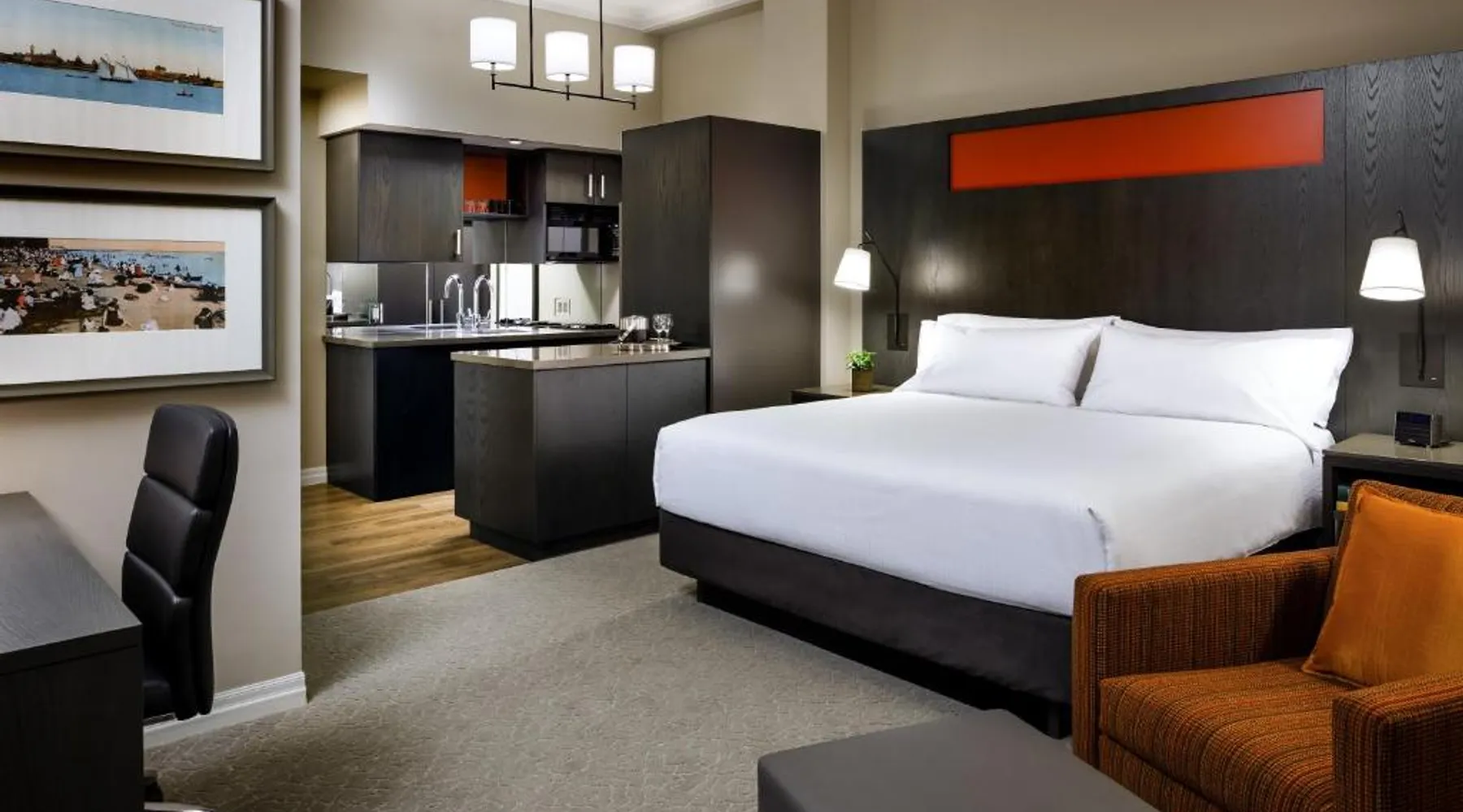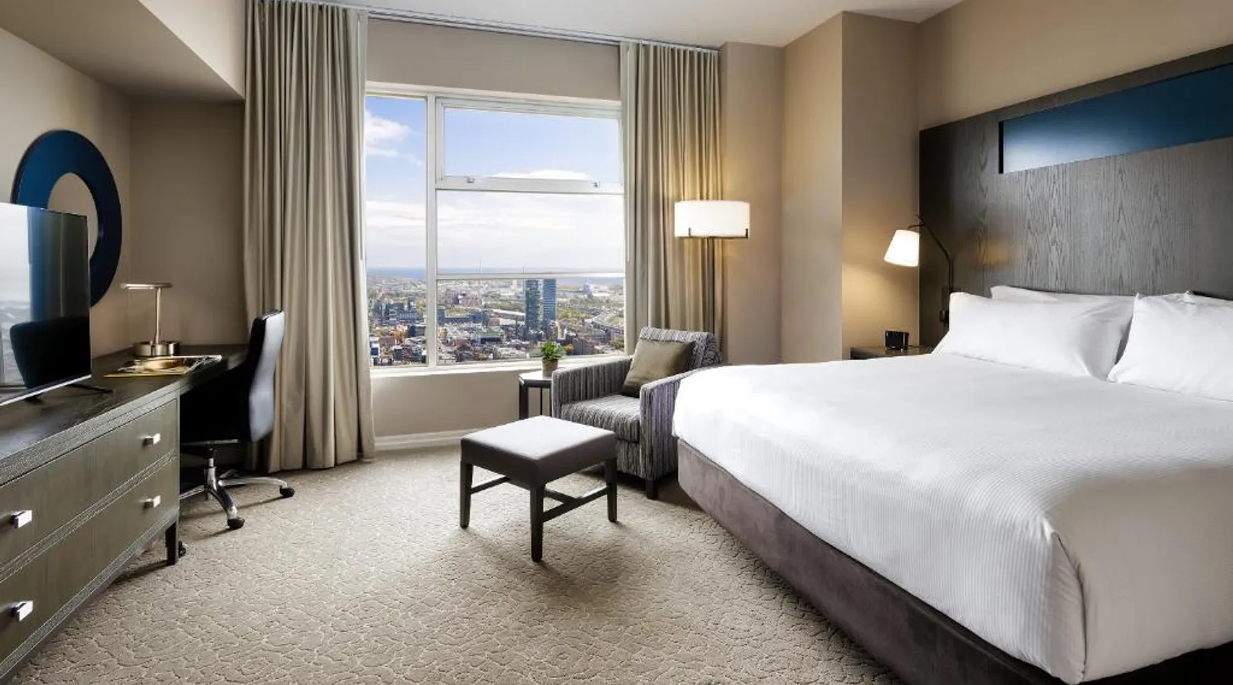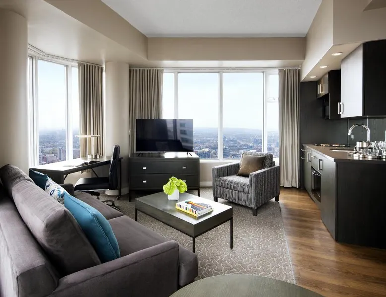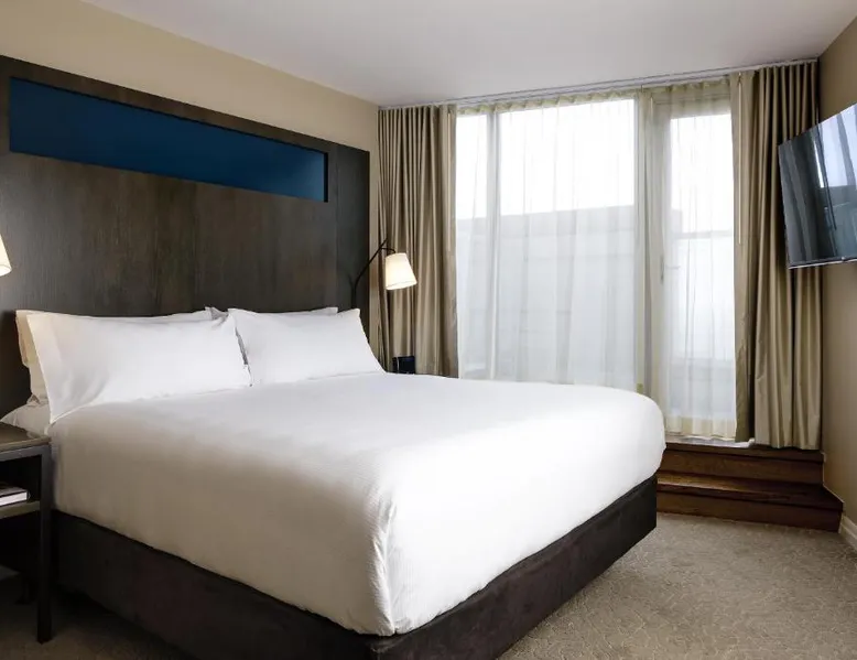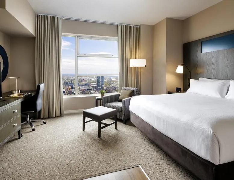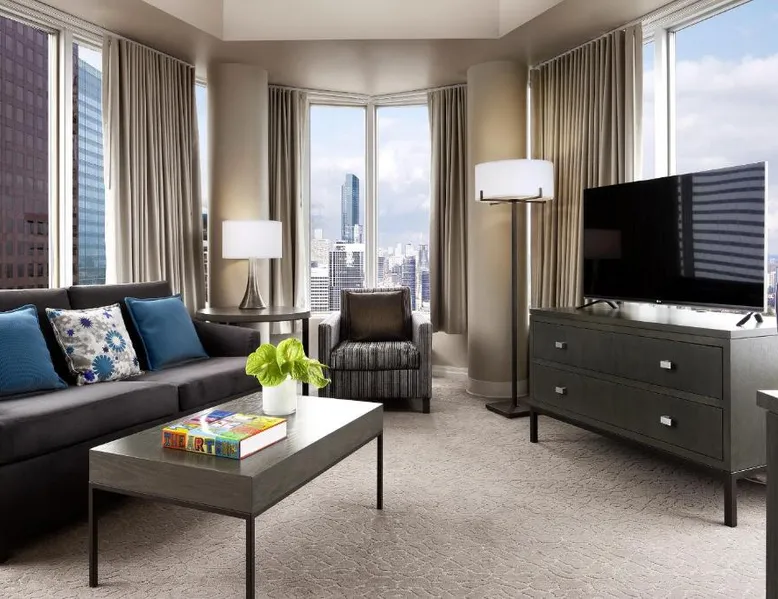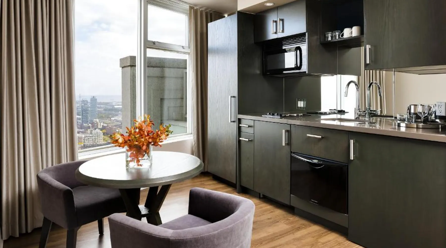 Built in 1914, this downtown Toronto hotel blends historic charm and elegance with modern conveniences. St. Lawrence Market and the Hockey Hall of Fame are less than 10 minutes' walk away. Accommodations at this all-suite hotel are furnished with a variety of thoughtful amenities, including microwaves, refrigerators and coffeemakers. They also feature separate sleeping, dining and working areas. One King West Hotel and Residence has an on-site fitness center along with a restaurant and a bar. One King West Hotel and Residence is 2461 feet from the Roy Thomson Hall. Billy Bishop Toronto City Airport is 2.4 mi away. Boasting views of Toronto or Lake Ontario, this modern suite consists of a living area and a kitchenette with a fridge, cooking hobs, a microwave oven and a dishwasher. It also features high ceilings, large windows, laundry facilities, a safety deposit box and a 47-inch Smart HDTV.