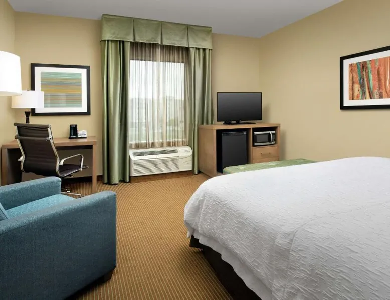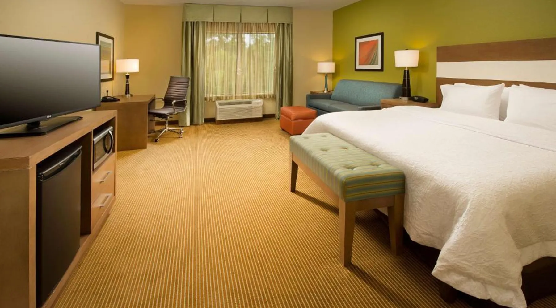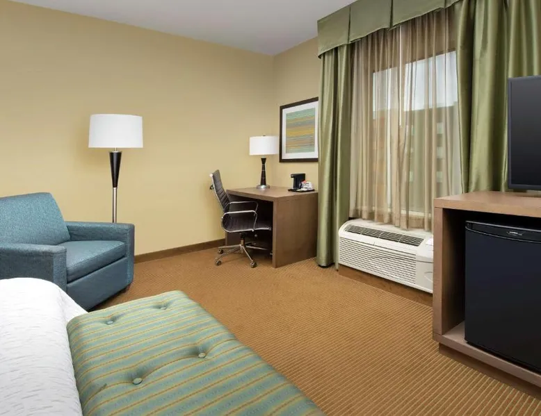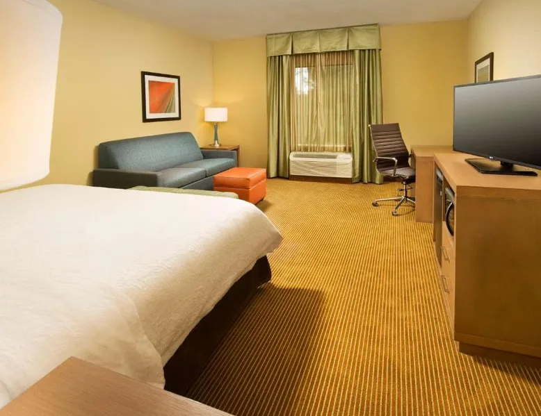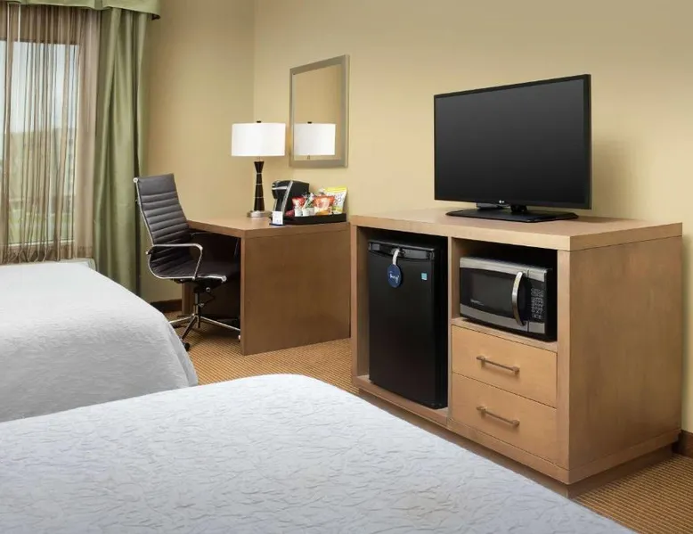 Comfortable Accommodations: Hampton Inn Lake Charles in Lake Charles offers family rooms with refrigerators, microwaves, TVs, and free WiFi. Each room includes a tea and coffee maker, hairdryer, sofa bed, and seating area. Exceptional Facilities: Guests can enjoy a fitness center, indoor swimming pool, and restaurant serving American cuisine with vegetarian and dairy-free options. Additional amenities include a minimarket, business area, and free on-site parking. Convenient Location: Located 5 mi from Lake Charles Regional Airport, the inn is near attractions such as L'Auberge Casino (1.5 mi) and Prien Lake Park (2.1 mi). Highly rated for its attentive staff and excellent service support. A flat-screen cable TV is featured in this room. There are also a microwave, refrigerator and coffee machine.