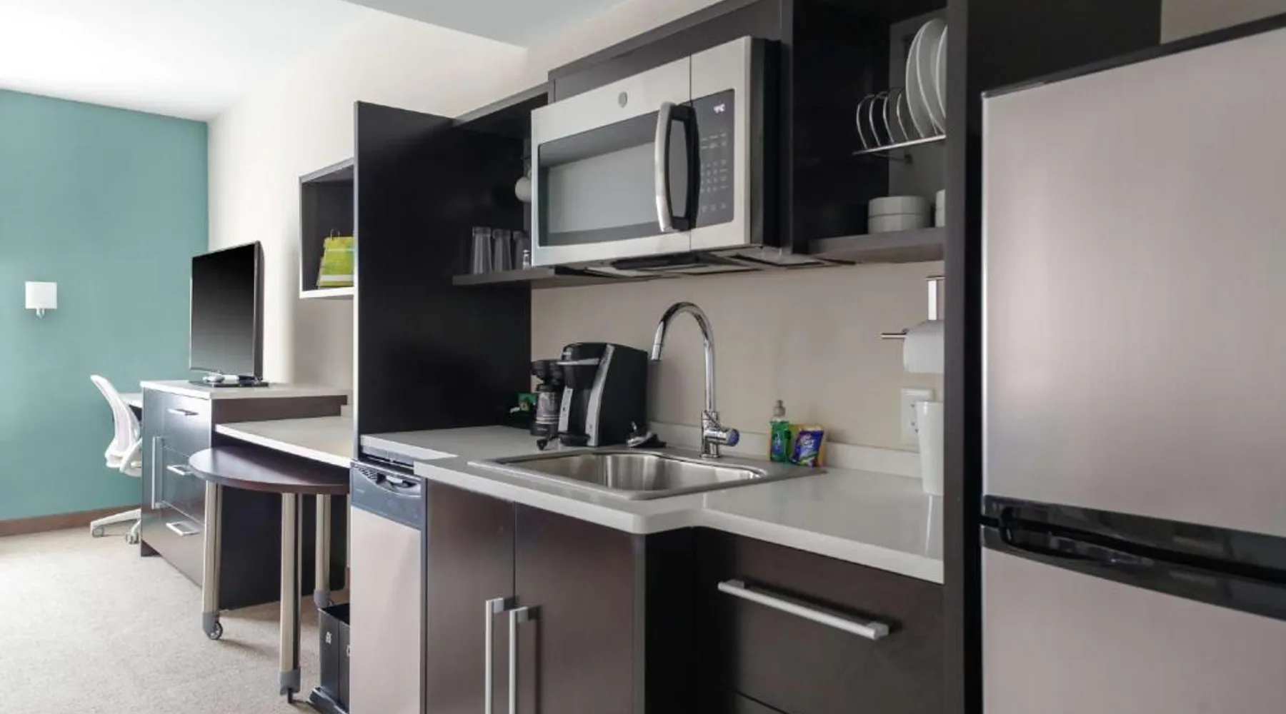 Comfortable Accommodations: Home2 Suites By Hilton Louisville Airport Expo Center in Louisville offers air-conditioned rooms with free WiFi, tea and coffee makers, and sofa beds. Each room includes a refrigerator, microwave, dishwasher, and kitchenware. Leisure Facilities: Guests can enjoy a saltwater swimming pool, indoor pool, and fitness center. The hotel provides free airport shuttle service, a 24-hour front desk, and free on-site private parking. Convenient Location: Located 1.2 mi from Louisville International Airport, the hotel is near attractions such as McDonald's Field (1 mi) and Kentucky Exposition Center (0.7 mi). Guests appreciate the airport shuttle, convenient location, and connectivity to the airport. The suite provides air conditioning, a tea and coffee maker, a seating area, heating, as well as a TV. The unit offers 1 bed.