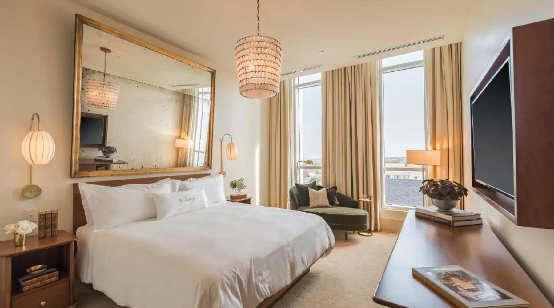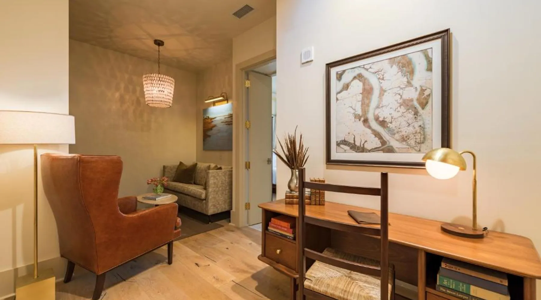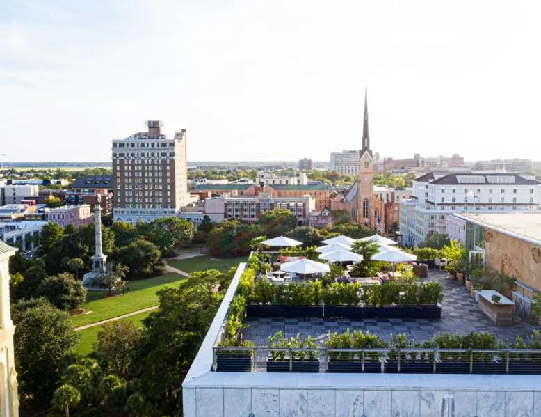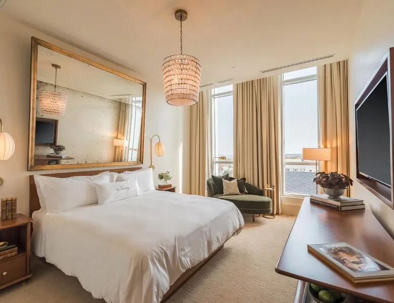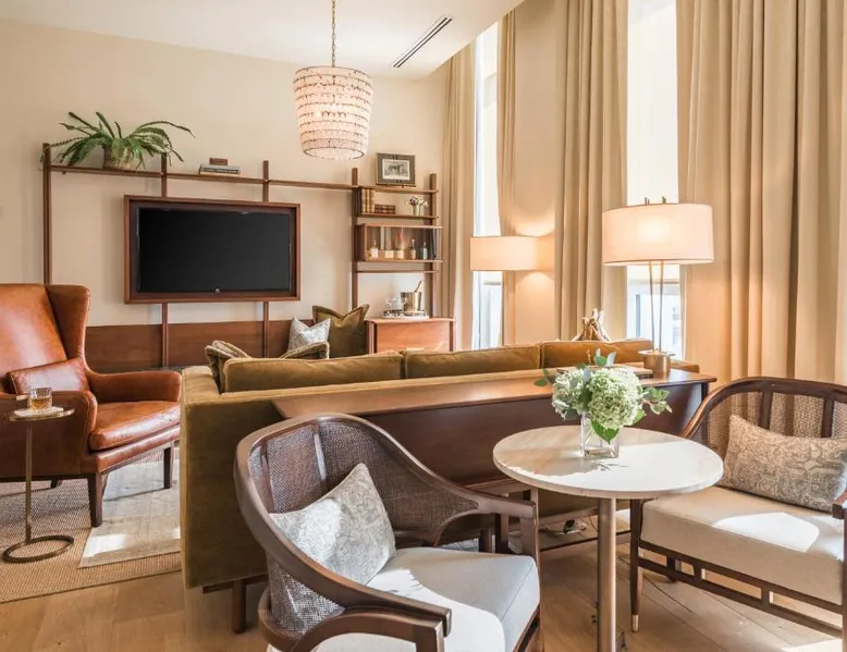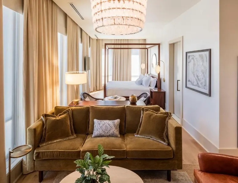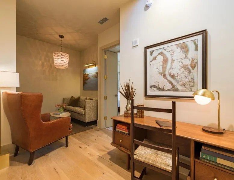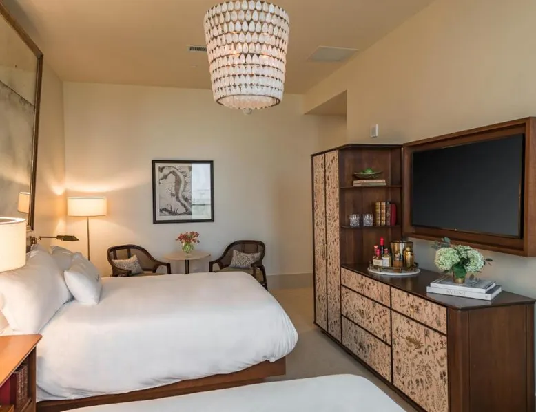 The historic Dewberry Charleston is a mid-20th century boutique hotel is located in the in the Mendell Rivers Federal building and features an American Southern brasserie-style restaurant and a craft cocktail bar. Spa at the Dewberry, a fitness center, and library are available as well as the Fieldshop from Garden & Gun on-site shop. The 2283 feet of indoor and outdoor event space includes a glass-enclosed rooftop venue. Floor-to-ceiling windows, flat-screen TV, and mini-bar are standard in every room at the Dewberry Charleston. Extras include an en suite with Vermont marble accents, free toiletries, and slippers. The Charleston Museum, American Theater, and Charleston Farmers Market are 3 minutes’ walk from the Charleston Dewberry hotel. The South Carolina Aquarium is 0.6 mi away. Overlooking historic Marion Square Park, this suite offers a separate living area, handcrafted bed frame, custom armoire, and marble-tiled bathroom with 2 sinks.