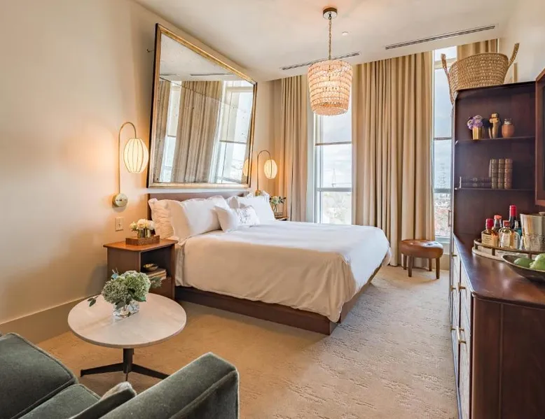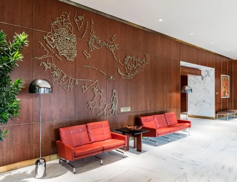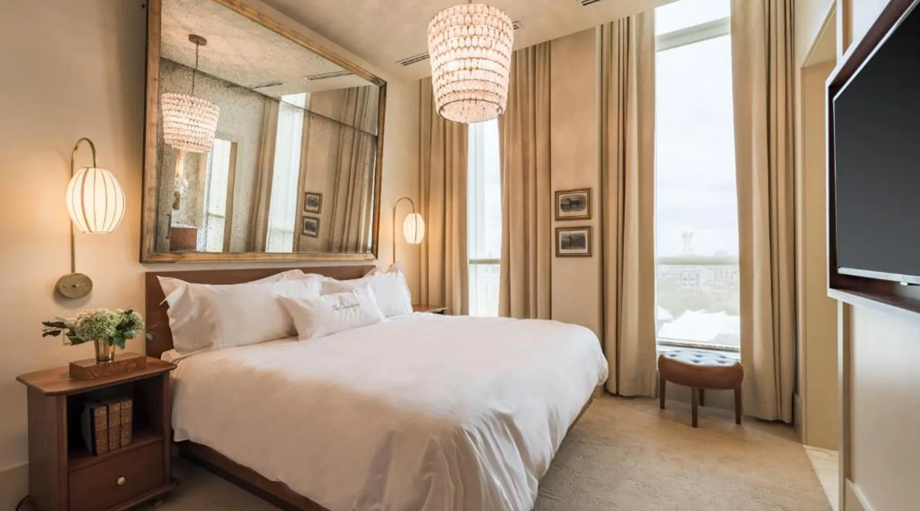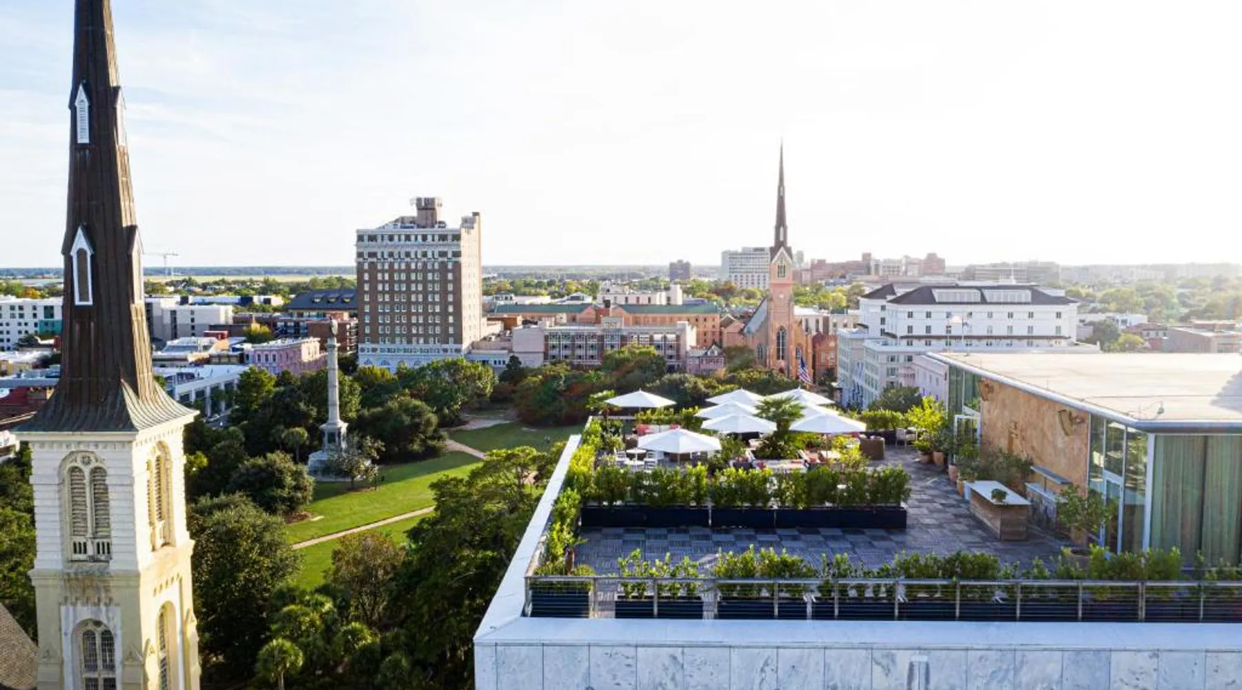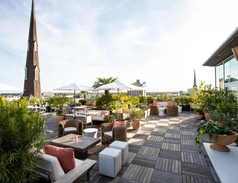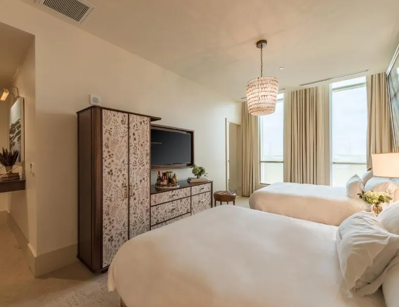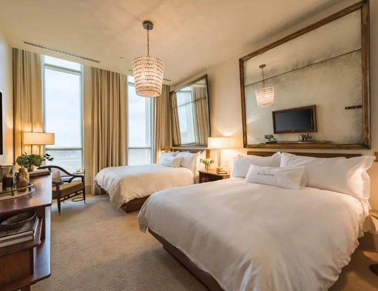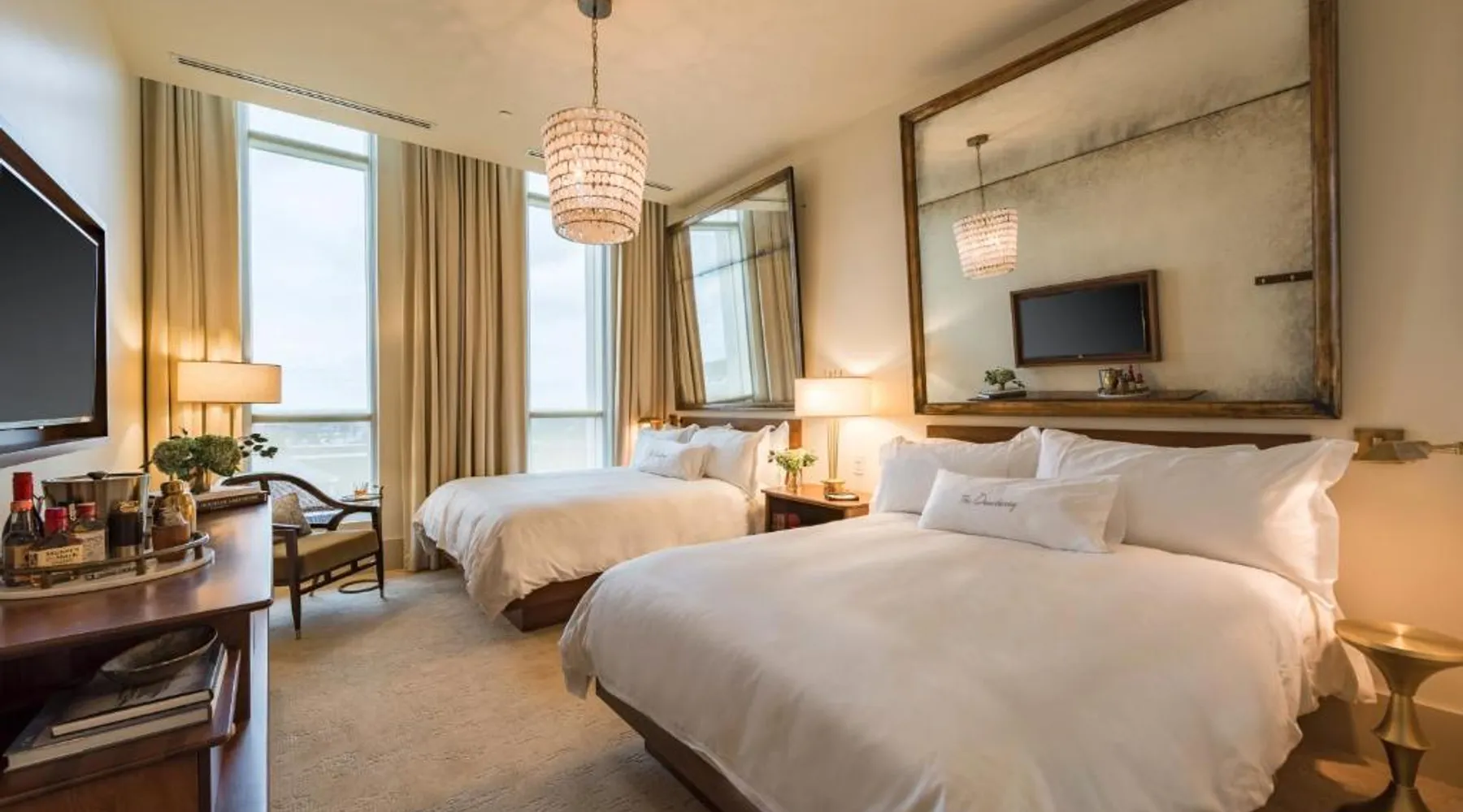 The historic Dewberry Charleston is a mid-20th century boutique hotel is located in the in the Mendell Rivers Federal building and features an American Southern brasserie-style restaurant and a craft cocktail bar. Spa at the Dewberry, a fitness center, and library are available as well as the Fieldshop from Garden & Gun on-site shop. The 2283 feet of indoor and outdoor event space includes a glass-enclosed rooftop venue. Floor-to-ceiling windows, flat-screen TV, and mini-bar are standard in every room at the Dewberry Charleston. Extras include an en suite with Vermont marble accents, free toiletries, and slippers. The Charleston Museum, American Theater, and Charleston Farmers Market are 3 minutes’ walk from the Charleston Dewberry hotel. The South Carolina Aquarium is 0.6 mi away. Overlooking historic Marion Square Park, this suite offers a separate living area, handcrafted bed frame, custom armoire, and marble-tiled bathroom with 2 sinks.