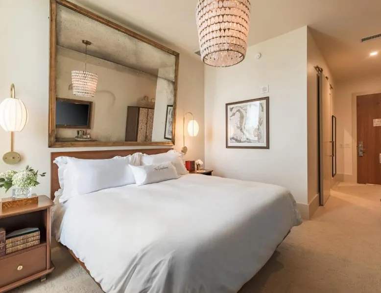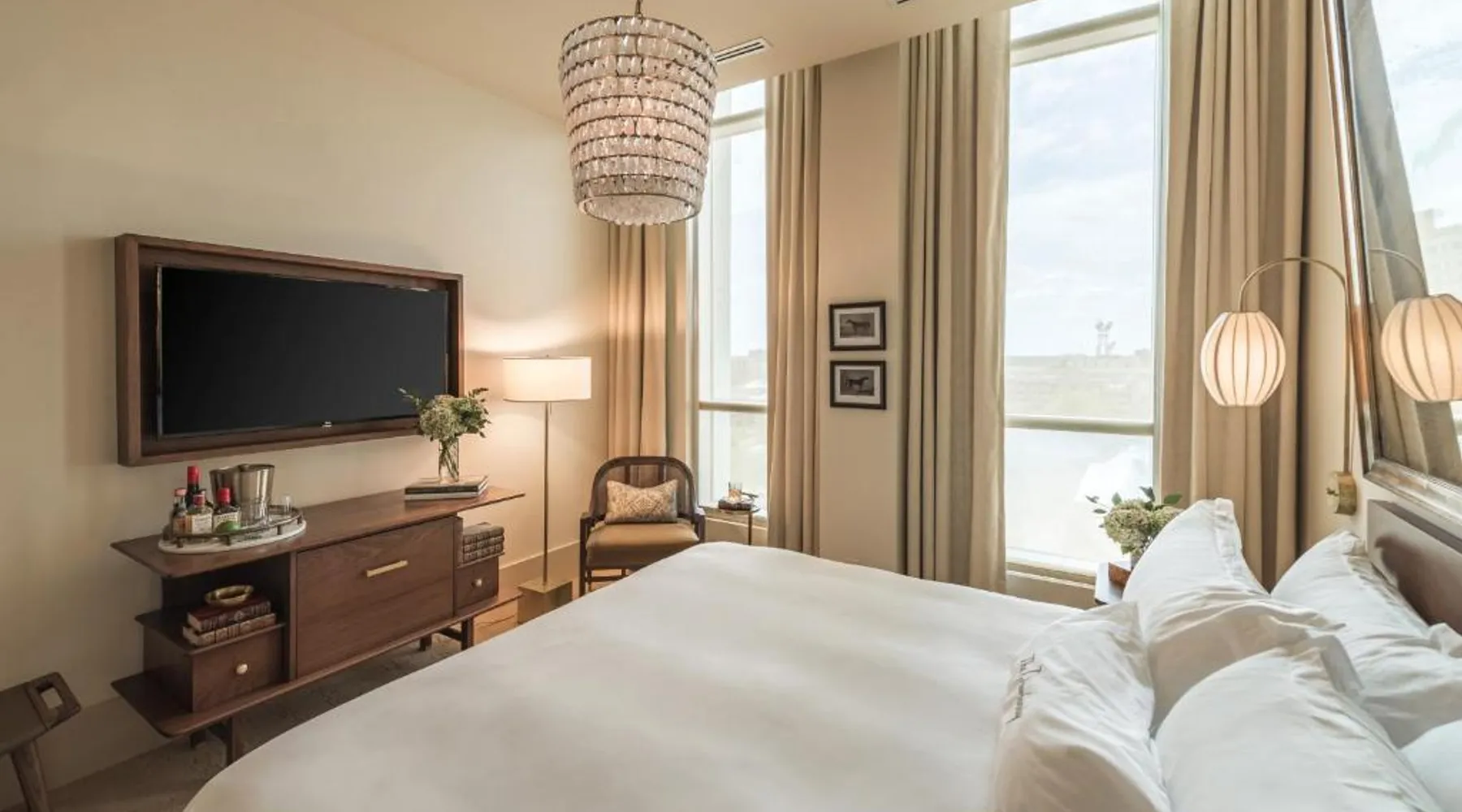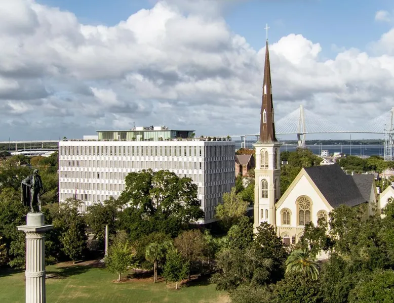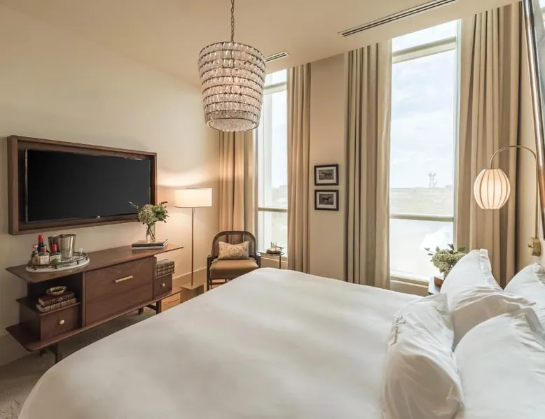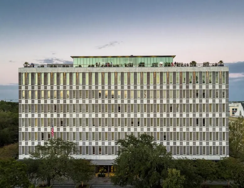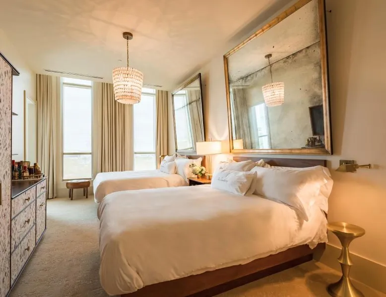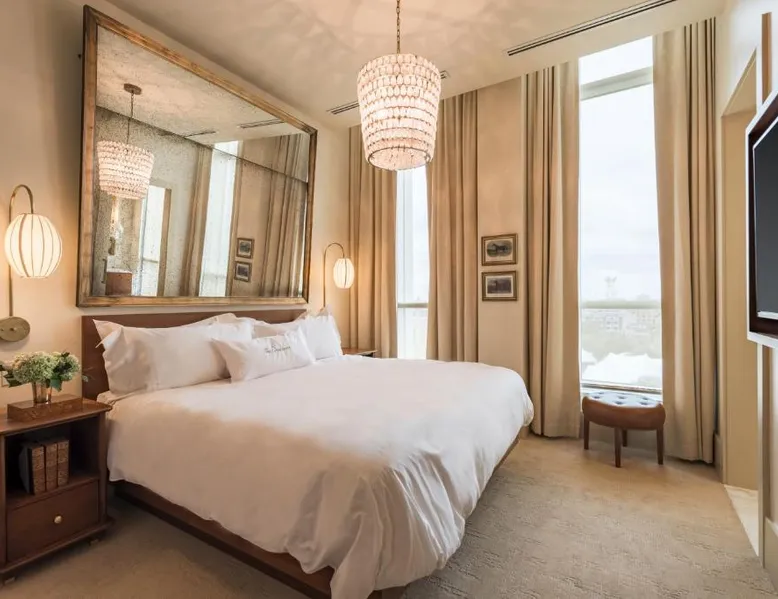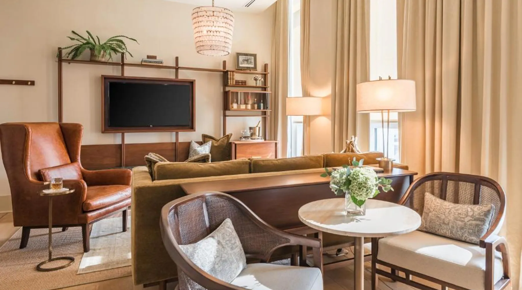 The historic Dewberry Charleston is a mid-20th century boutique hotel is located in the in the Mendell Rivers Federal building and features an American Southern brasserie-style restaurant and a craft cocktail bar. Spa at the Dewberry, a fitness center, and library are available as well as the Fieldshop from Garden & Gun on-site shop. The 2283 feet of indoor and outdoor event space includes a glass-enclosed rooftop venue. Floor-to-ceiling windows, flat-screen TV, and mini-bar are standard in every room at the Dewberry Charleston. Extras include an en suite with Vermont marble accents, free toiletries, and slippers. The Charleston Museum, American Theater, and Charleston Farmers Market are 3 minutes’ walk from the Charleston Dewberry hotel. The South Carolina Aquarium is 0.6 mi away. Overlooking historic Marion Square Park, this suite offers a separate living area, handcrafted bed frame, custom armoire, and marble-tiled bathroom with 2 sinks.