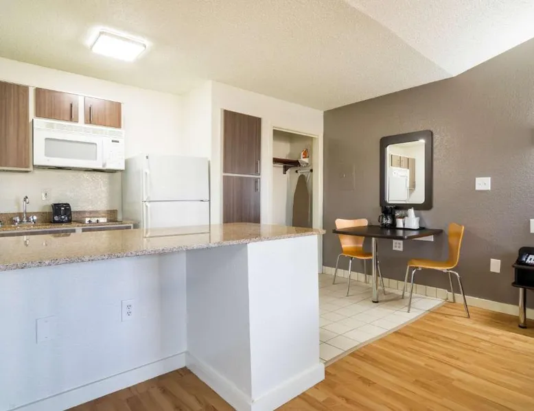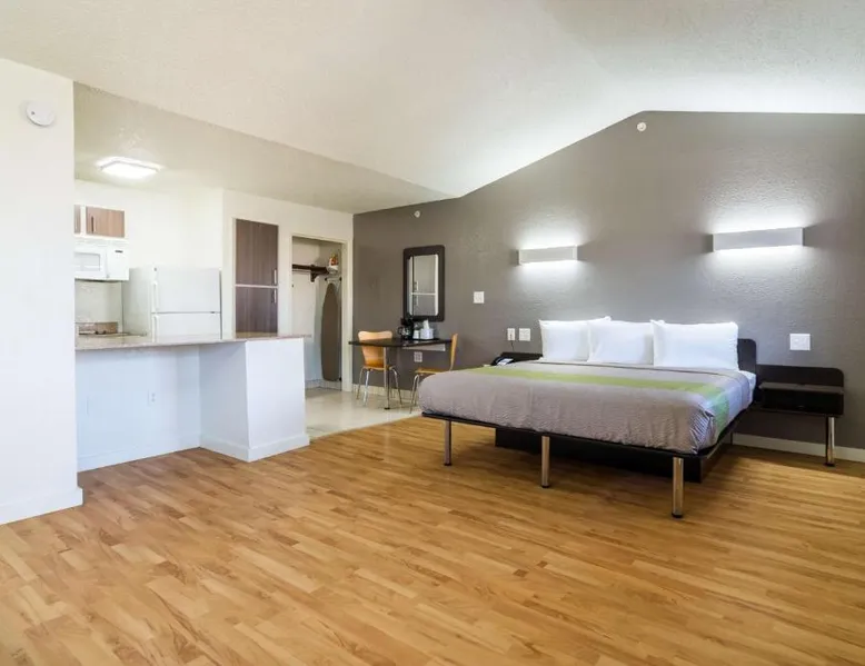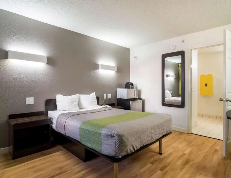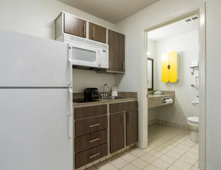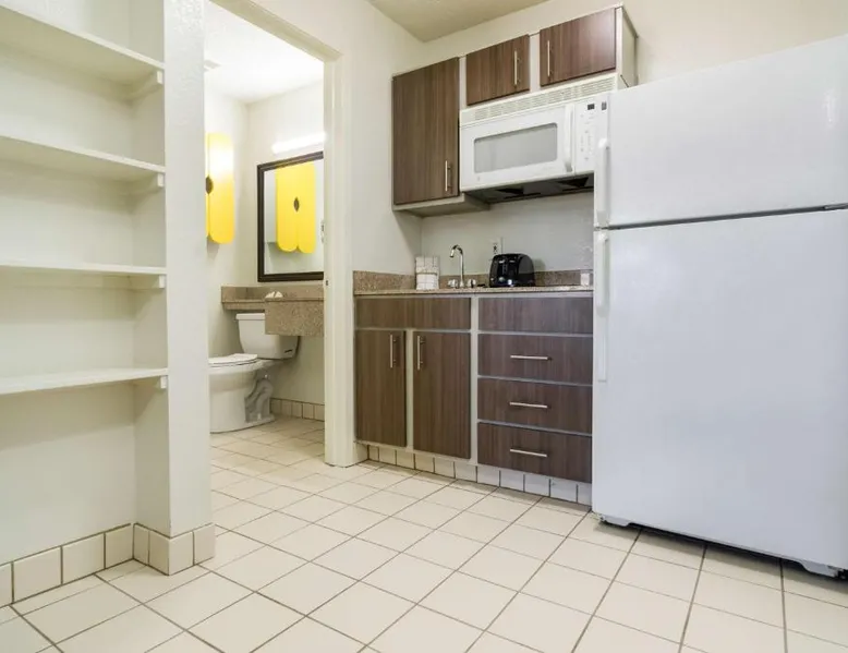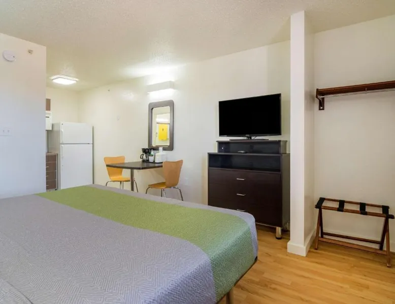 Comfortable Accommodations: Studio 6-Plano, TX - Dallas - Plano Medical Center in Plano offers air-conditioned rooms with kitchenettes, private bathrooms, and free WiFi in public areas. Each room includes a tea and coffee maker, coffee machine, refrigerator, microwave, shower, stovetop, and TV. Convenient Facilities: Guests benefit from a elevator, 24-hour front desk, and free on-site private parking. Additional amenities include a bath and free WiFi in public areas. Prime Location: Located 16 mi from Dallas Love Field Airport, the hotel is near Historic Downtown Plano (5.6 mi), Haggard Library (2.6 mi), and an ice-skating rink. Guests appreciate the convenient location, value for money, and suitability for city trips. Furnished with a small refrigerator and microwave, this room comes with a TV. A desk is also provided.