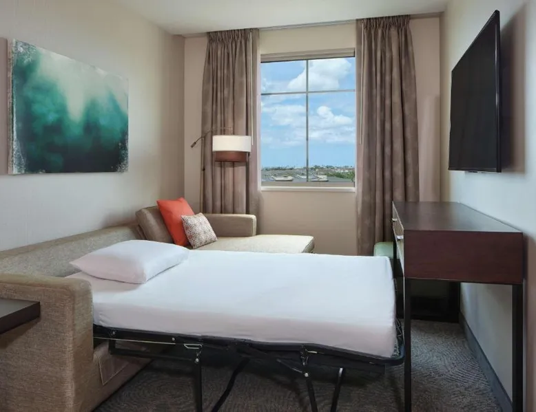 Comfortable Accommodations: Embassy Suites By Hilton Oahu Kapolei in Kapolei offers family rooms with balconies, private bathrooms, and modern amenities. Each room includes air-conditioning, a work desk, and free WiFi. Dining and Leisure: Guests can enjoy a swimming pool with a view, fitness center, restaurant, and bar. The family-friendly restaurant serves American, Japanese, and local cuisines, offering lunch, dinner, and cocktails. Breakfast includes local specialties, fresh pastries, and a hot tub. Convenient Location: Located 17 mi from Honolulu International Airport, the hotel is near Pearl Harbor (15 mi) and Wet Wild Hawaii (1.8 mi). Guests appreciate the attentive staff, excellent service, and room cleanliness. This studio is air-conditioned and has a flat-screen TV with cable channels, a tea and coffee maker, a seating area and a safe deposit box. The unit has 2 beds.