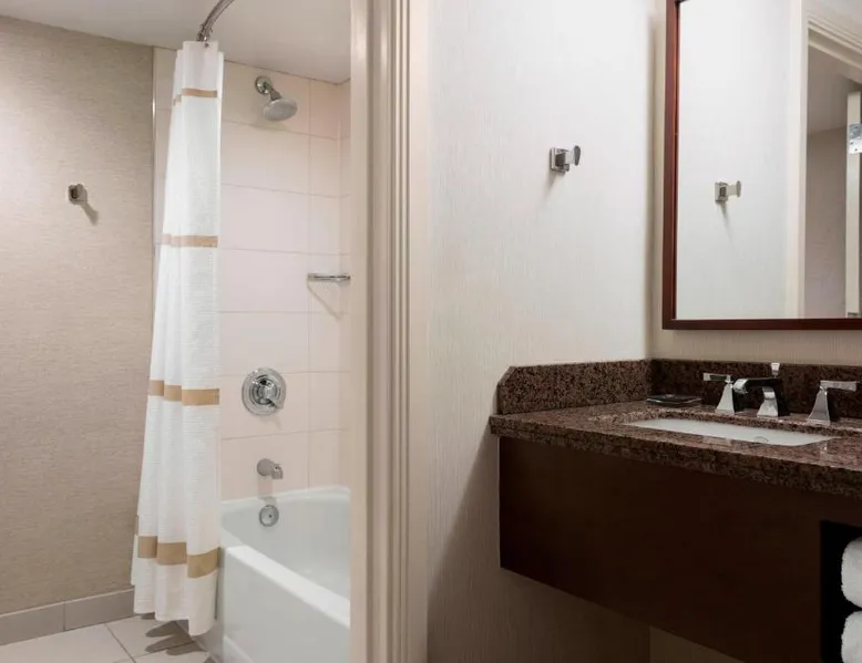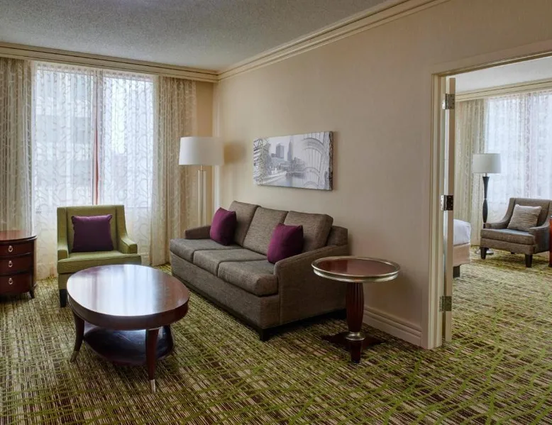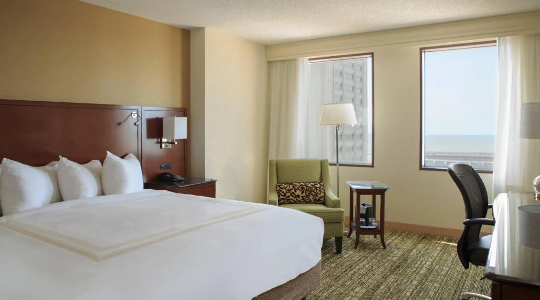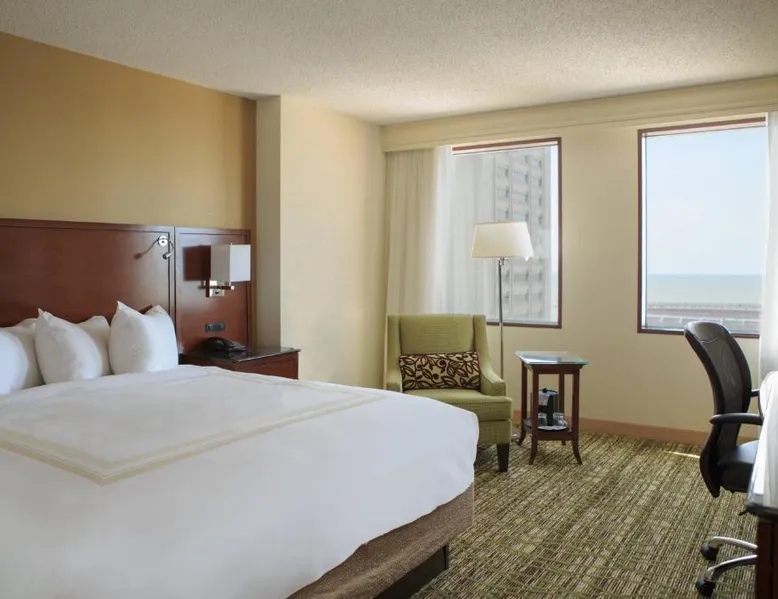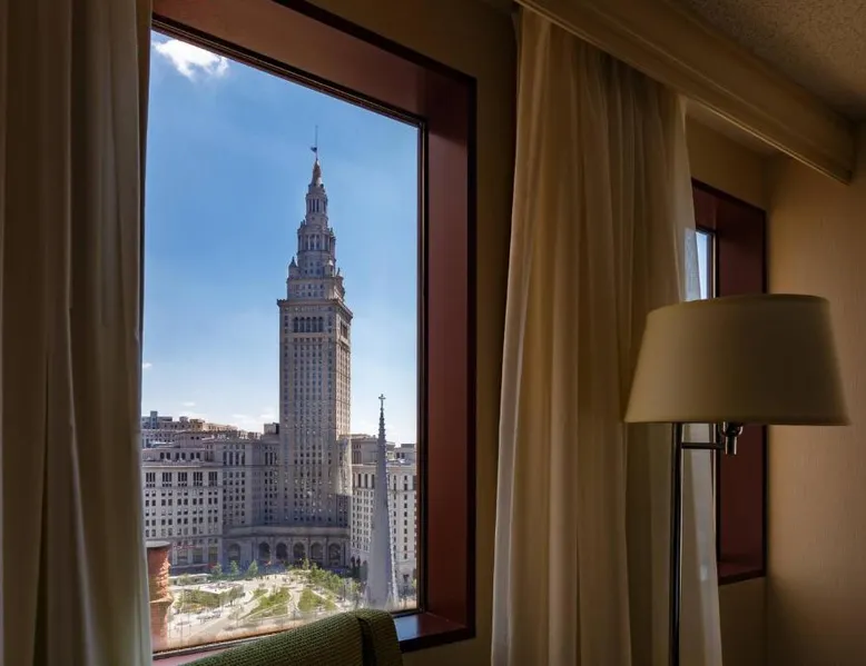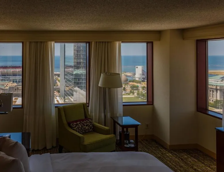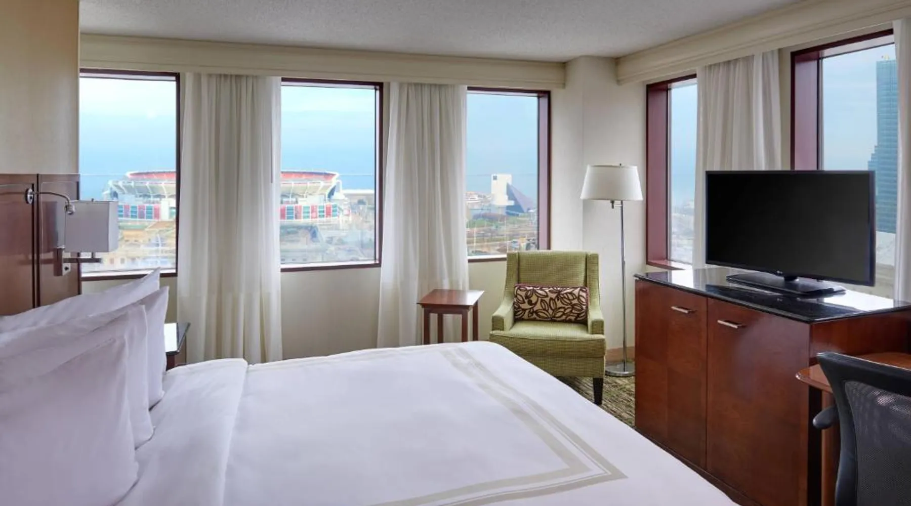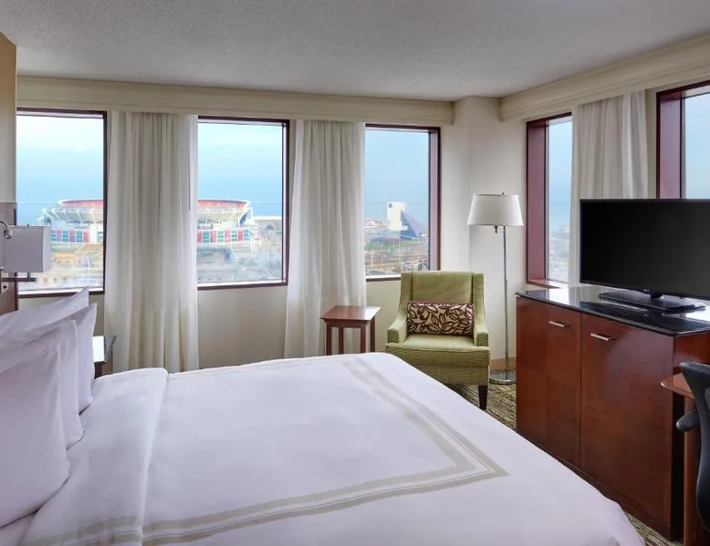 Located in the heart of downtown Cleveland, this hotel is less than a mile away from Cleveland Convention Center and offers a fitness center. Every room at Cleveland Marriott Downtown at Key Tower provides a flat-screen cable TV and marble bathrooms with rainfall shower heads. A seating area with a large chair and ottoman are also included. Guests can view sporting events on flat-screen plasma TVs while enjoying cocktails and casual dining at Greatroom Restaurant. 17,918 sq. ft. of meeting and event space is offered at Cleveland Marriott Downtown at Key Tower. Free WiFi is offered in the hotel lobby and public areas. Cleveland Marriott Downtown at Key Tower is within walking distance from Rocket Mortgage Field House, Progressive Field and the Rock & Roll Hall of Fame. Featuring a view of Lake Erie, this room includes a small refrigerator and a coffee maker. A desk and ironing facilities are also provided.