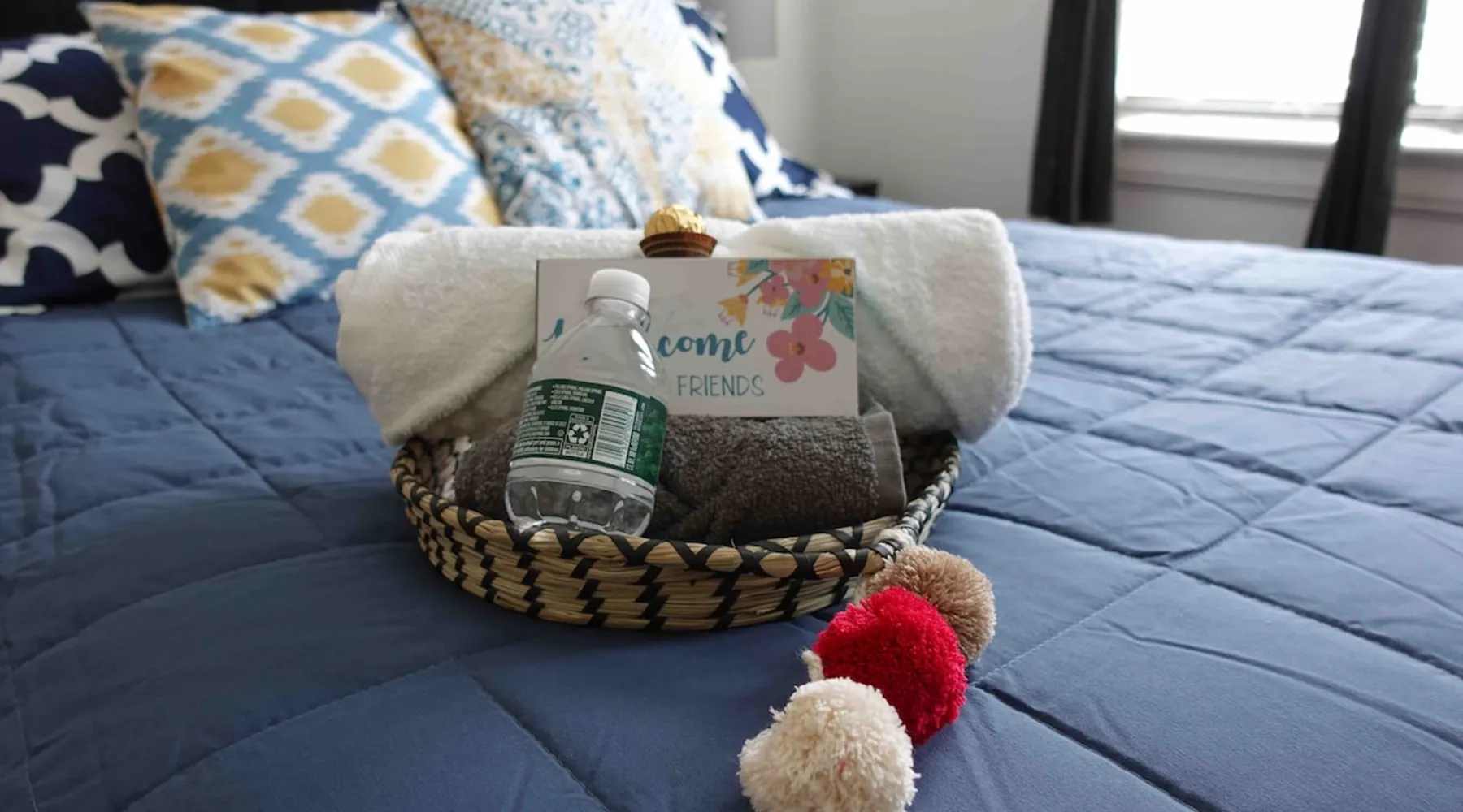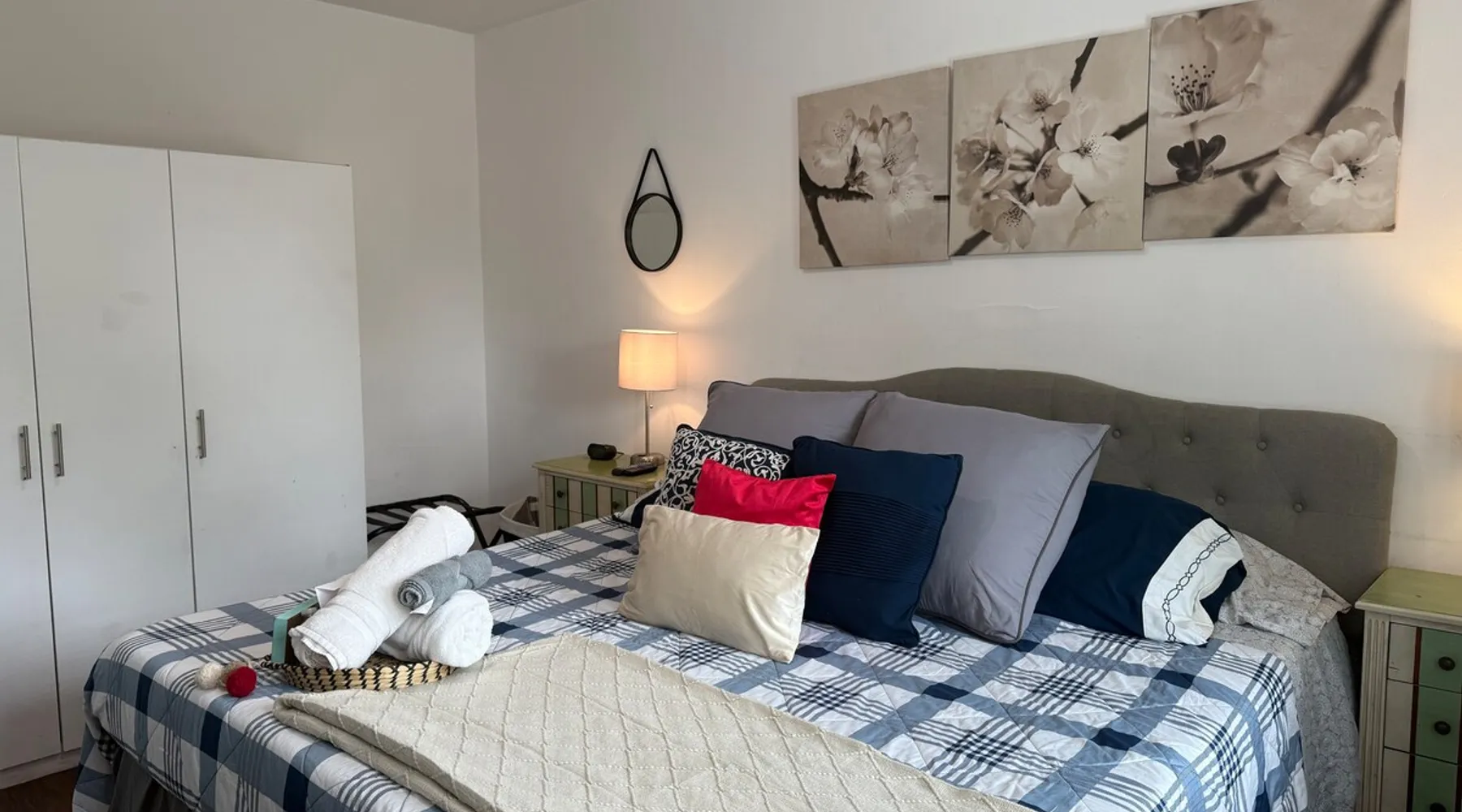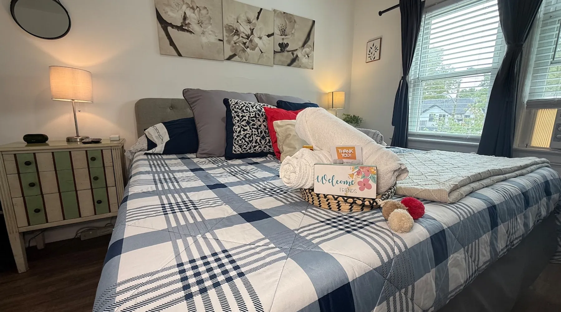 Private room for 2 with king-size bed, 60” TV, desk, AC/heating. Shared bathroom and fully equipped kitchen with basics (oil, salt, sugar, spices, coffee). Kitchen and bathroom cleaned every 2 days. Room includes fresh towels, welcome water and small snacks. Safe neighborhood with nearby bus and train for easy access to Manhattan and NYC. Perfect for couples or travelers seeking comfort and convenience. The space Private room for 2 with king-size bed, 60” TV, desk, AC/heating. Shared bathroom and fully equipped kitchen (cleaned every 2 days). Fresh towels and a welcome bottle of water included. Guest access Guests have full private access to this bedroom, which includes a comfortable queen-size bed, blackout curtains, a large smart TV, desk space, and air conditioning. Fresh linens, towels, and essentials are provided for your stay. During your stay I respect guests’ privacy but I’m available if needed. You can reach me by message or phone during your stay, and I’m happy to provide local tips or assistance. Other things to note Kitchen and bathroom are shared with 2 other respectful guests and are cleaned every 2 days. Welcome water and small snacks are provided only at check-in. Quiet hours after 10pm. No smoking inside the house.