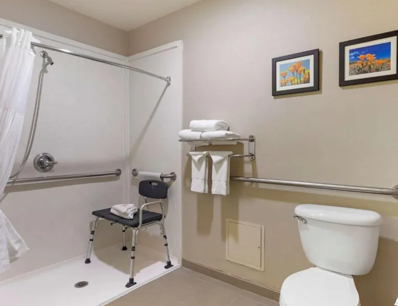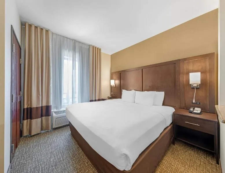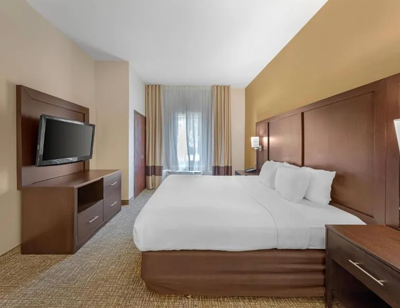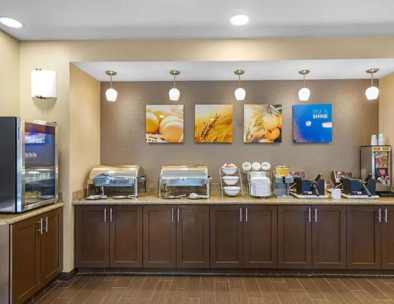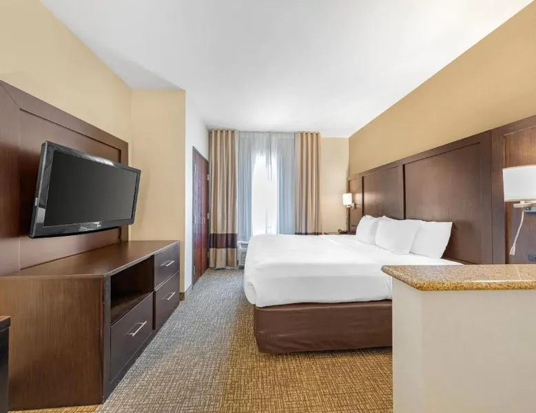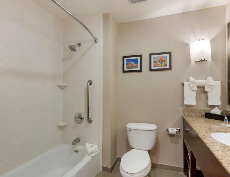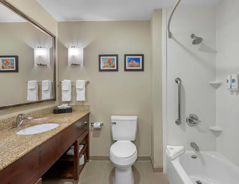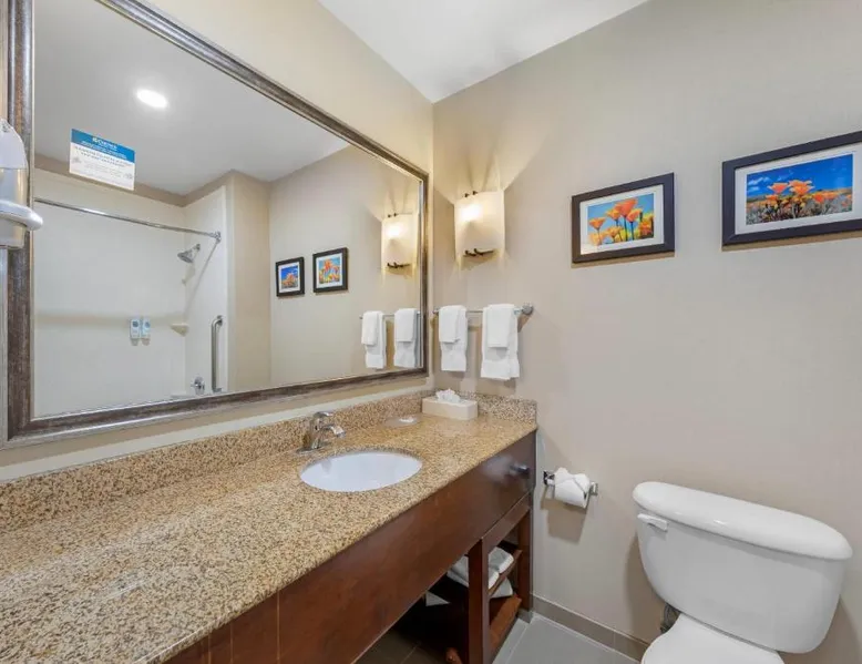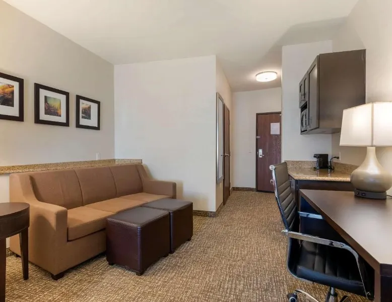 Comfort Suites Ontario Airport Convention Center is only 1 mile from the LA/Ontario International Airport and provides free airport transportation. Local points of interest including the Ontario Convention Center, Citizens Business Bank Arena and the Auto Club Speedway, home of NASCAR racing, are all within minutes from this hotel. Additional attractions nearby include: Ontario Mills Mall, Planes of Fame Air Museum and California Speedway, Fairplex, home of the L.A. County Fairgrounds, Raging Waters water park, Claremont College and University of La Verne, A number of exciting entertainment venues, retailers and restaurants can be found in the vicinity. Hotel features and amenities include: Free wireless high-speed Internet access, Outdoor heated pool and hot tub and 24-hour fitness center. Free Grab-and-Go Breakfast is available. This hotel has a contemporary business center, offering a computer with free high-speed Internet access,copy and fax services. There are two banquet and meeting rooms located on the premises that can accommodate up to 75 people for most business or social functions. Contact our on-site sales professional to assist with planning and to ensure the success of your event. All of our guest suites have 42-inch flat-screen televisions, microwaves, refrigerators, coffee makers, curved shower rods, hair dryers, irons, ironing boards, pillow-top mattresses and cable television. Keep your electronic devices charged with the recharge device including AC and USB outlets provided in all guest rooms. Some rooms have wet bars. Connecting rooms can be requested. This hotel has been certified a green lodging hotel with the California Green Lodging Program. For added convenience, coin-operated laundry facilities are located on the premises and valet cleaning service is offered. Stop by the market pantry for cold drinks, snack options and late night cravings, available 24 hours a day. Ample parking is available and can accommodate most cars, trucks or buses. There is also a Stay and Fly Package. Free Wi-Fi, a 42-inch flat-screen cable TV, microwave, small fridge, coffeemaker and curved shower rod are included in this suite.