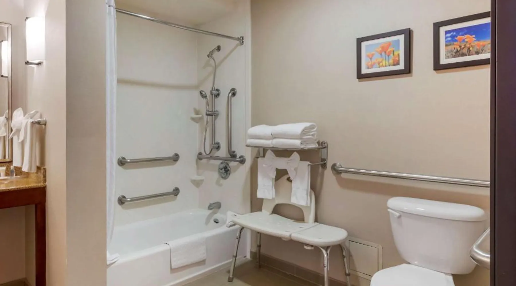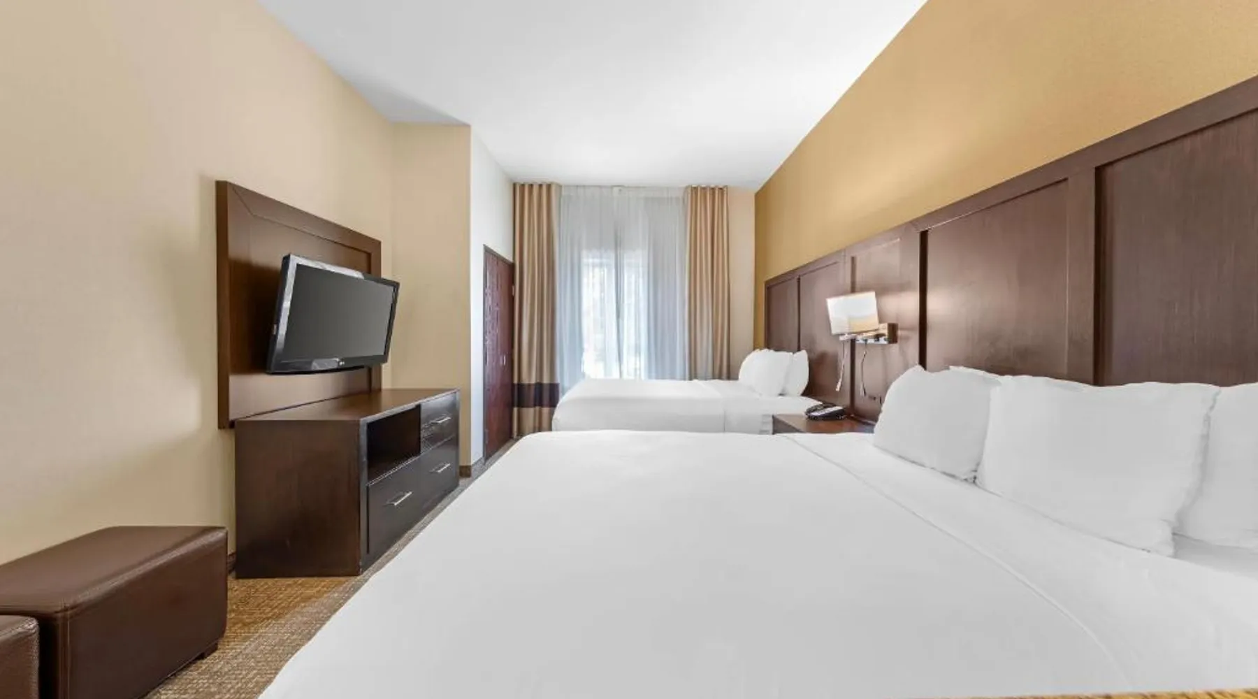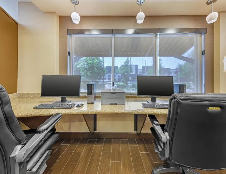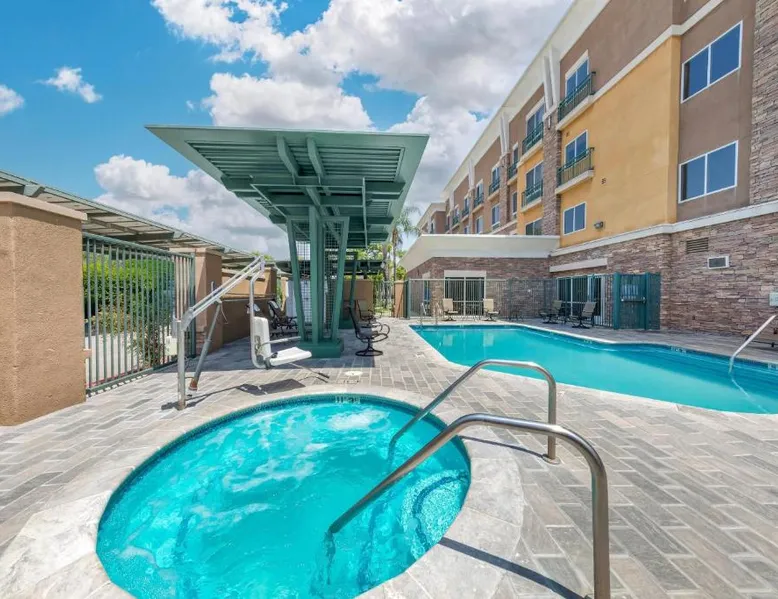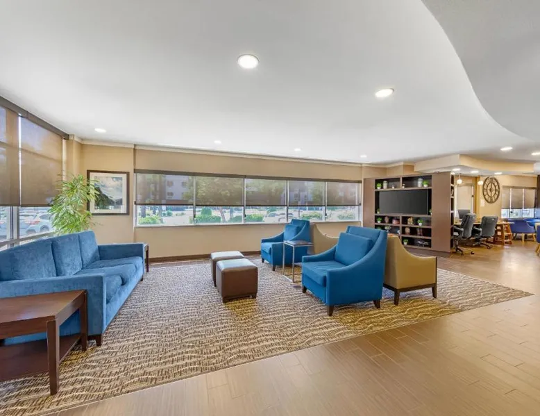 Comfort Suites Ontario Airport Convention Center is only 1 mile from the LA/Ontario International Airport and provides free airport transportation. Local points of interest including the Ontario Convention Center, Citizens Business Bank Arena and the Auto Club Speedway, home of NASCAR racing, are all within minutes from this hotel. Additional attractions nearby include: Ontario Mills Mall, Planes of Fame Air Museum and California Speedway, Fairplex, home of the L.A. County Fairgrounds, Raging Waters water park, Claremont College and University of La Verne, A number of exciting entertainment venues, retailers and restaurants can be found in the vicinity. Hotel features and amenities include: Free wireless high-speed Internet access, Outdoor heated pool and hot tub and 24-hour fitness center. Free Grab-and-Go Breakfast is available. This hotel has a contemporary business center, offering a computer with free high-speed Internet access,copy and fax services. There are two banquet and meeting rooms located on the premises that can accommodate up to 75 people for most business or social functions. Contact our on-site sales professional to assist with planning and to ensure the success of your event. All of our guest suites have 42-inch flat-screen televisions, microwaves, refrigerators, coffee makers, curved shower rods, hair dryers, irons, ironing boards, pillow-top mattresses and cable television. Keep your electronic devices charged with the recharge device including AC and USB outlets provided in all guest rooms. Some rooms have wet bars. Connecting rooms can be requested. This hotel has been certified a green lodging hotel with the California Green Lodging Program. For added convenience, coin-operated laundry facilities are located on the premises and valet cleaning service is offered. Stop by the market pantry for cold drinks, snack options and late night cravings, available 24 hours a day. Ample parking is available and can accommodate most cars, trucks or buses. There is also a Stay and Fly Package. Free Wi-Fi, a 42-inch flat-screen cable TV, microwave, small fridge, coffeemaker and curved shower rod are included in this suite.