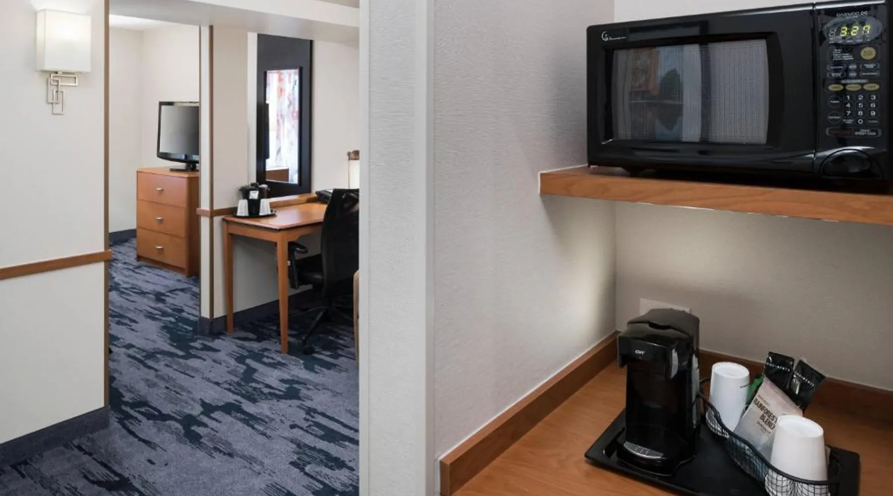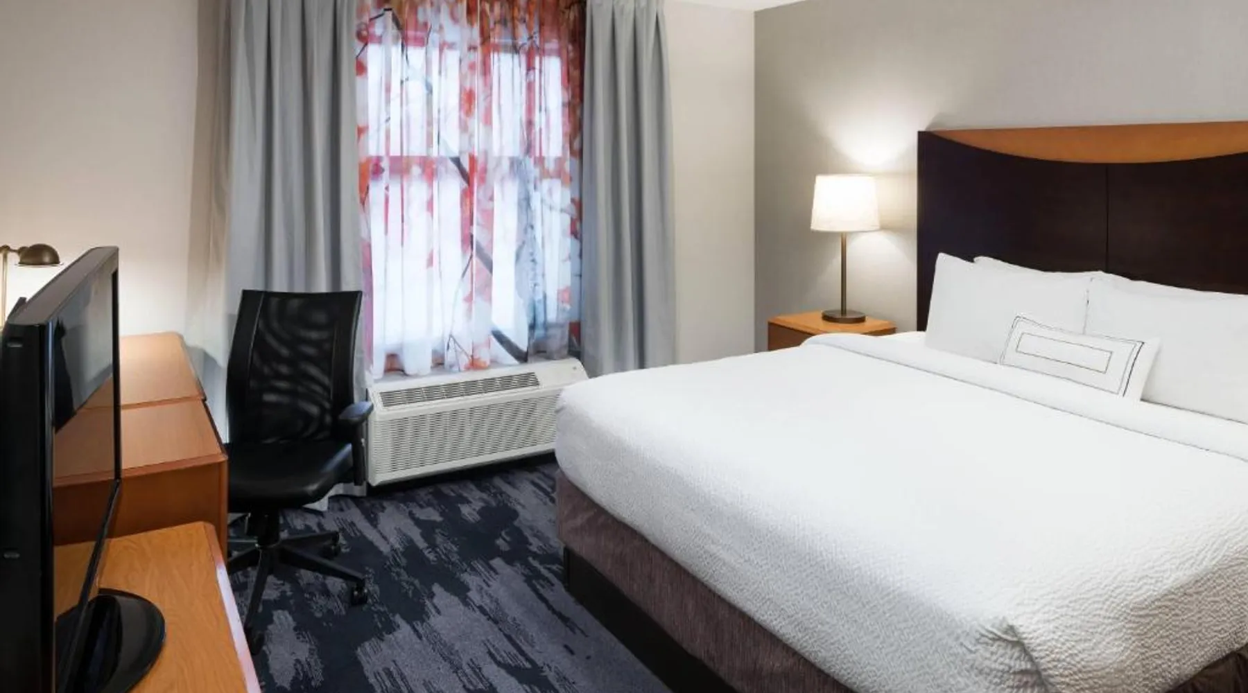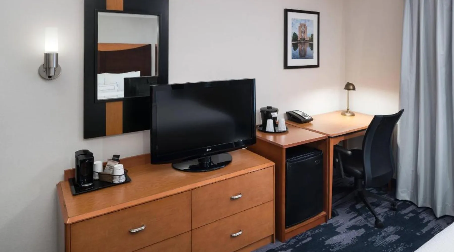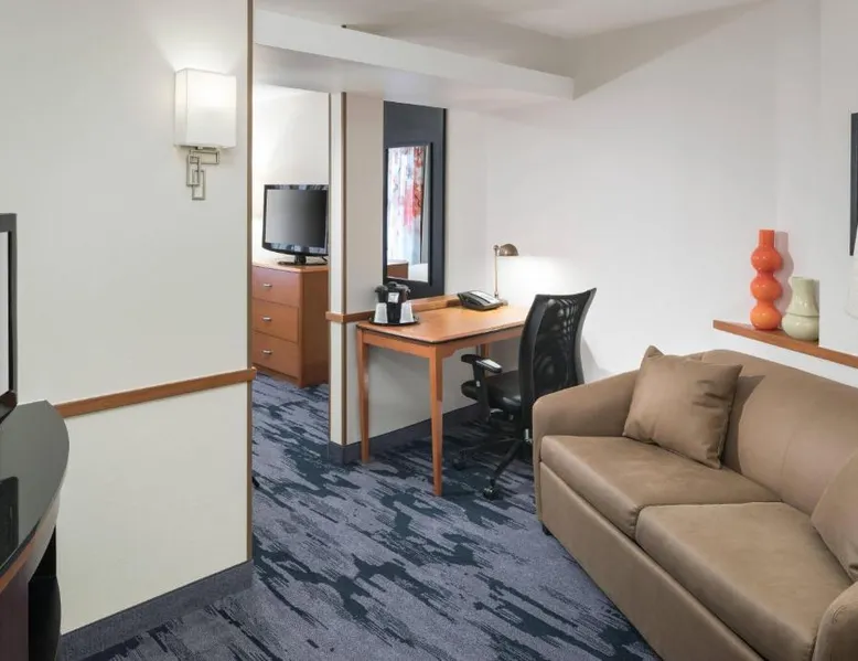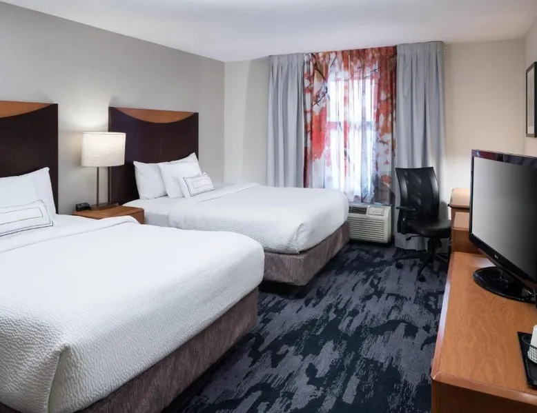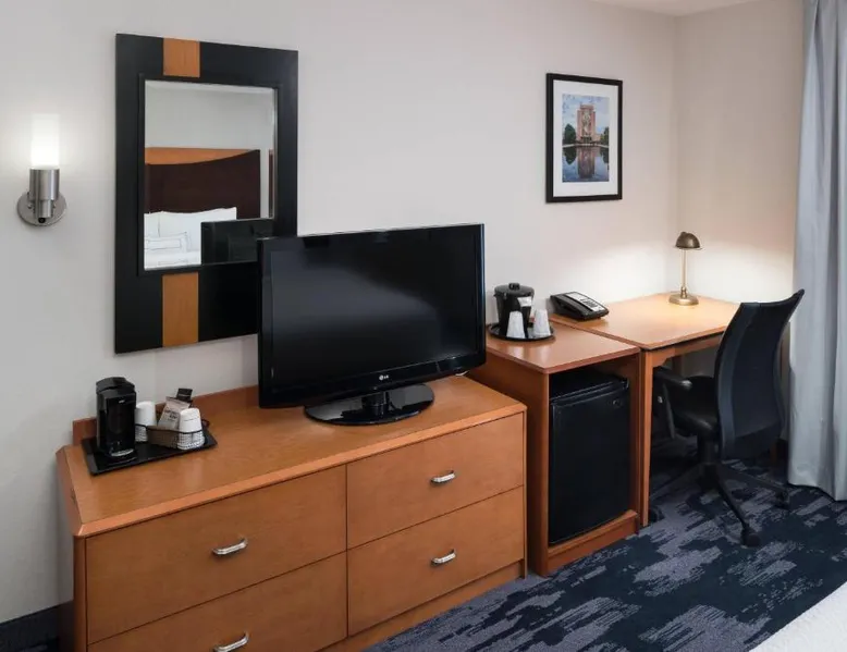 Comfortable Accommodations: Fairfield Inn & Suites South Bend at Noter Dame in South Bend offers air-conditioned rooms with private bathrooms, tea and coffee makers, hairdryers, work desks, seating areas, bath or showers, and TVs. Facilities and Services: Guests can enjoy a fitness center and indoor swimming pool, a elevator, and a 24-hour front desk. Paid on-site parking is available. Dining Options: A continental and American breakfast is served daily. Location and Attractions: Located 4.3 mi from South Bend Regional Airport, the hotel is an 8-minute walk from Noter Dame Stadium, 0.9 mi from the University of Noter Dame, and near other attractions. Guests appreciate the convenient location for city trips. This air-conditioned studio includes a flat-screen TV with cable channels and a private bathroom. The unit offers 1 bed.