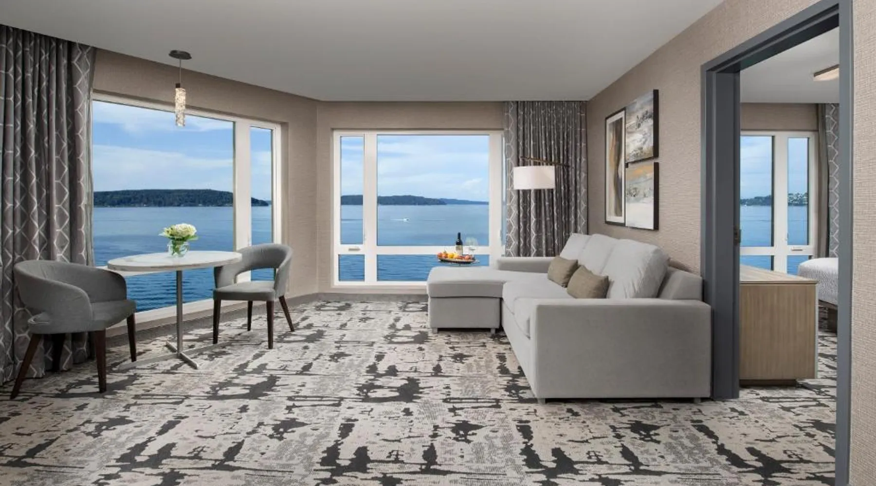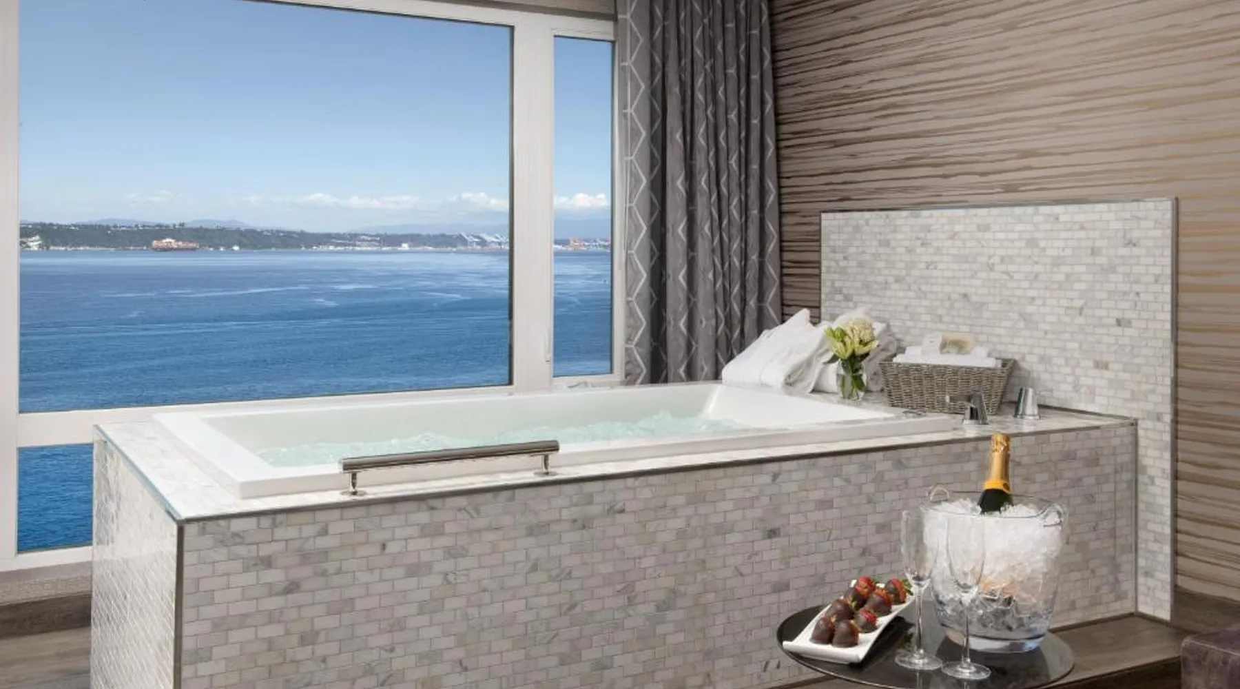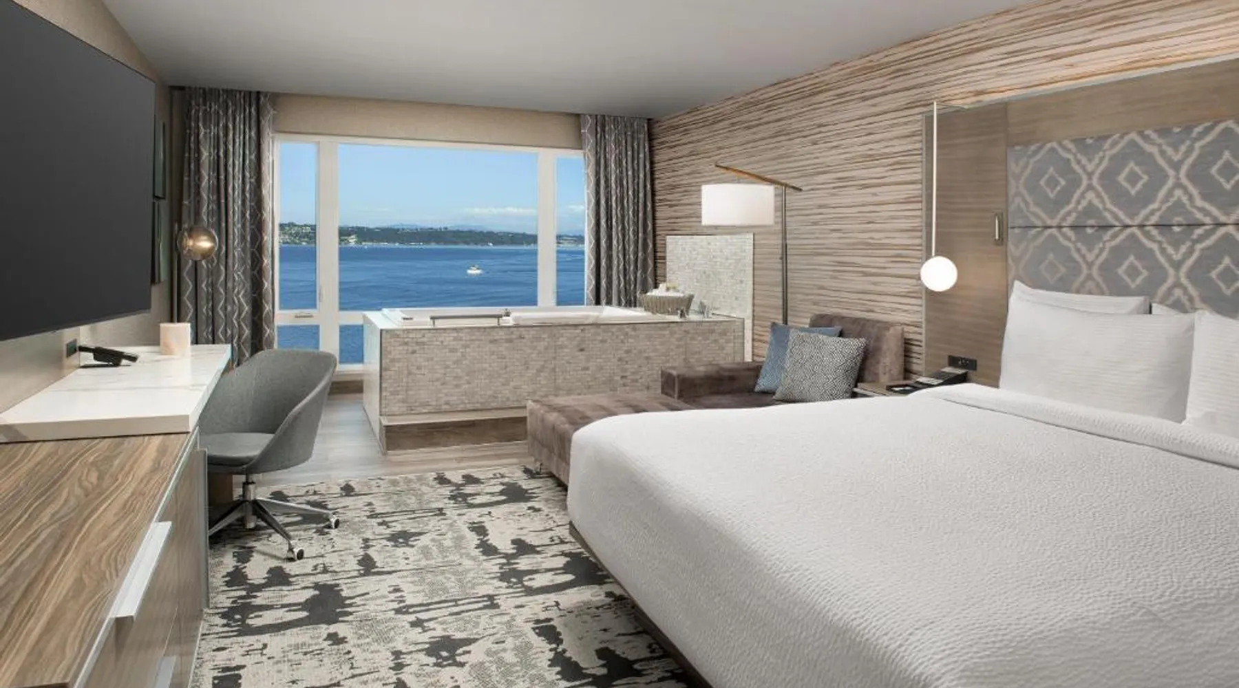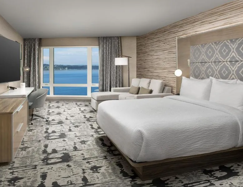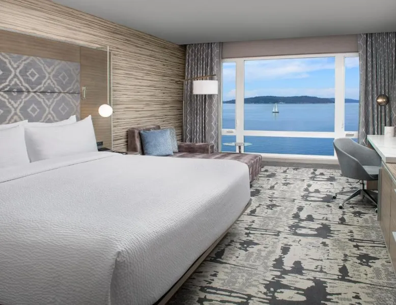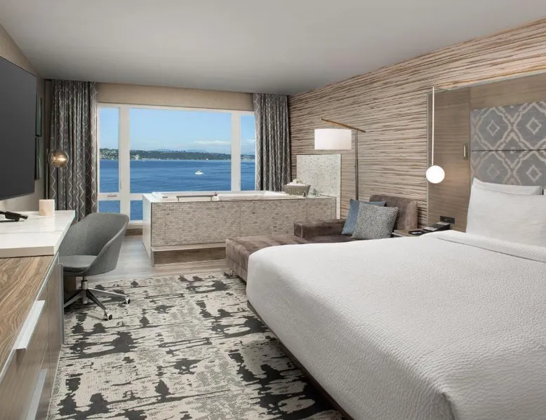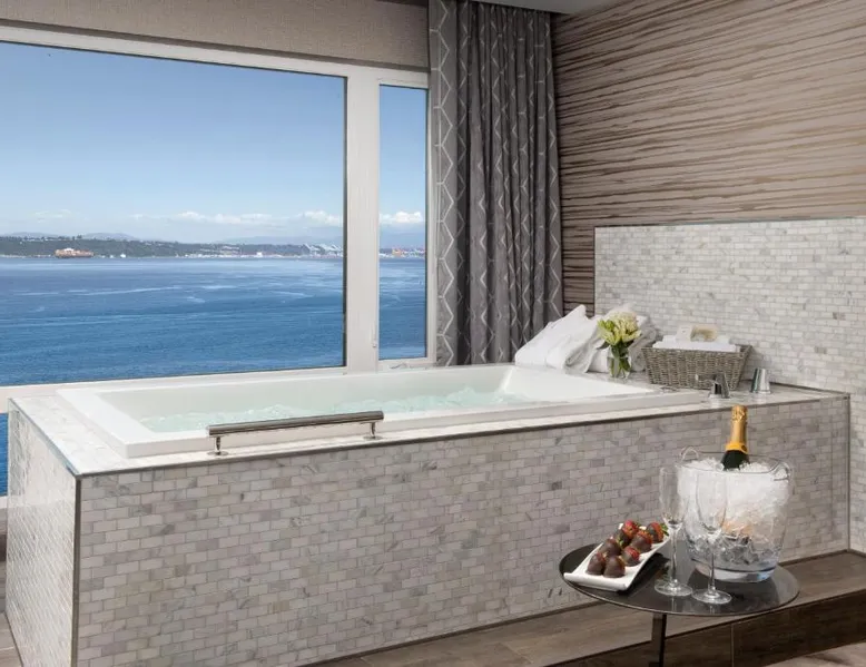 Elegant Accommodations: Silver Cloud Hotel Tacoma at Point Ruston Waterfront in Tacoma offers a 4-star experience with a rooftop swimming pool, spa facilities, fitness center, sun terrace, and a lush garden. Guests enjoy free WiFi, a restaurant, bar, and a variety of amenities including a hot tub and outdoor fireplace. Comfortable Rooms: Rooms feature air-conditioning, private bathrooms, tea and coffee makers, hairdryers, refrigerators, work desks, and seating areas. Additional amenities include bathrobes, baths, and wardrobes, ensuring a relaxing and comfortable stay. Dining Options: The family-friendly restaurant serves American cuisine with vegetarian, vegan, gluten-free, and dairy-free options. Breakfast includes local specialties, warm dishes, fresh pastries, pancakes, and juice. Dinner is available in a modern and romantic ambiance. Prime Location: Located 26 mi from Seattle–Tacoma International Airport, the hotel is a 16-minute walk from Owen Beach. Nearby attractions include the Museum of Glass (5.6 mi) and various restaurants. Guests appreciate the scenic views and excellent service. This quadruple room features air conditioning, soundproofing and lake view and a 65 inch flat screen TV