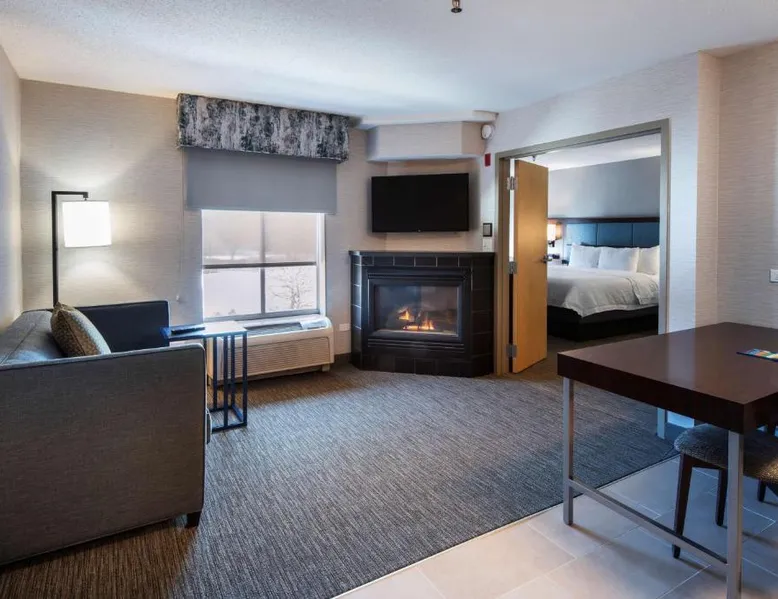 Comfortable Accommodations: Hampton Inn & Suites Lincolnshire in Lincolnshire offers family rooms with free WiFi, air-conditioning, and modern amenities. Each room includes a tea and coffee maker, hairdryer, refrigerator, free toiletries, microwave, shower, and TV. Leisure Facilities: Guests can enjoy a fitness center, sun terrace, and indoor swimming pool. Additional amenities include a lounge, fitness room, elevator, 24-hour front desk, minimarket, business area, outdoor seating area, and luggage storage. Convenient Location: Located 13 mi from Chicago O'Hare International Airport, the hotel is near attractions such as Six Flags Great America (18 mi), Loyola University Chicago (23 mi), and Wrigley Field (27 mi). Free on-site parking is available. Guest Satisfaction: Highly rated for its breakfast, room cleanliness, and convenient location, the hotel ensures a pleasant stay for all visitors. Features a fully equipped wet bar area, separate bedroom and living room with a sofa bed.