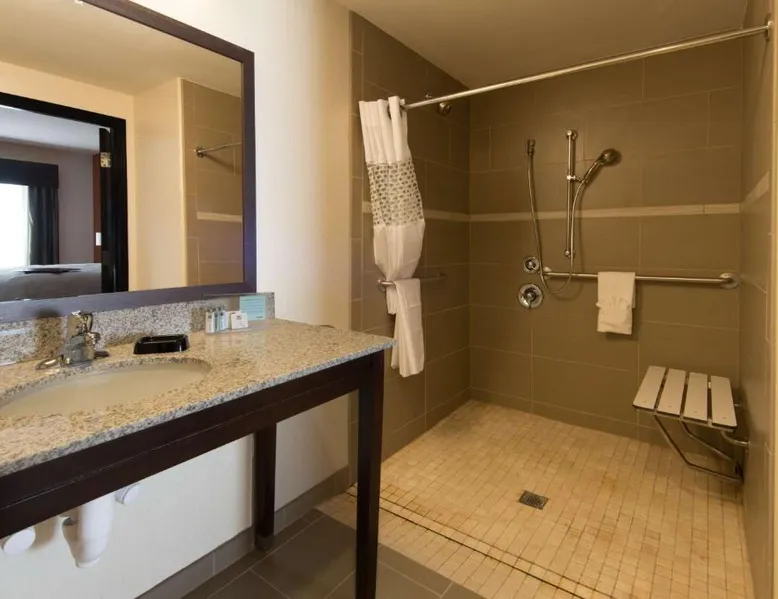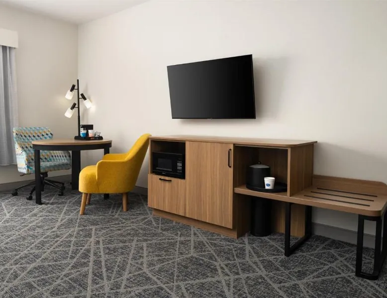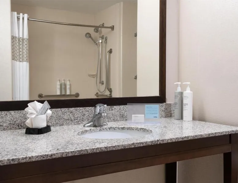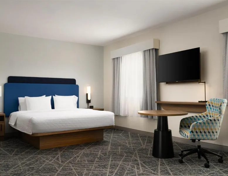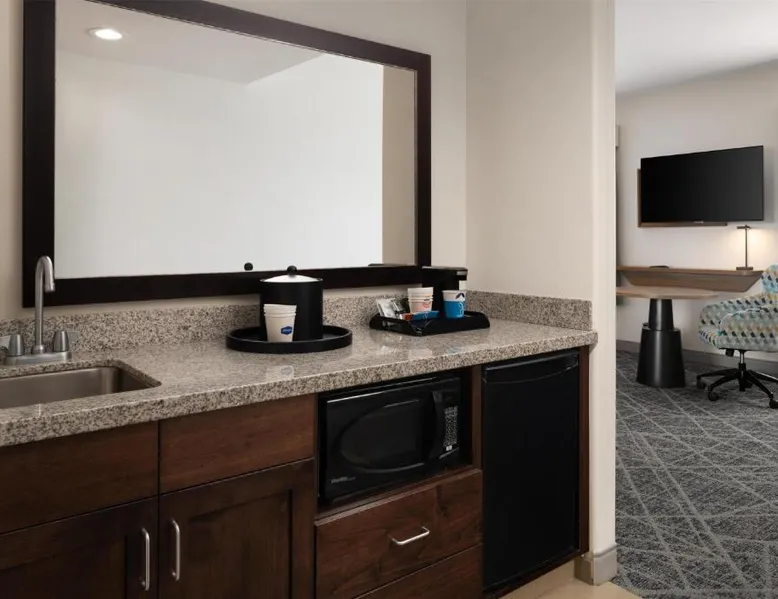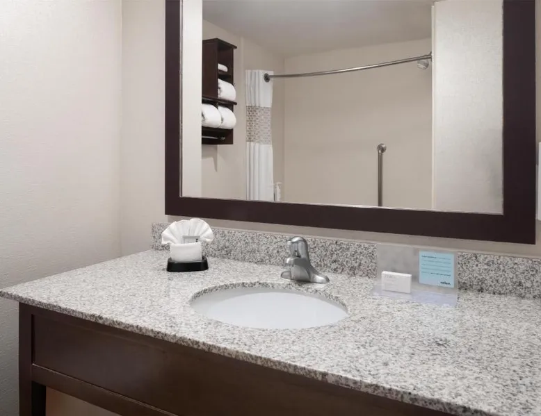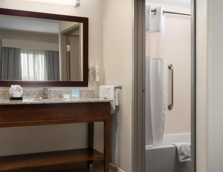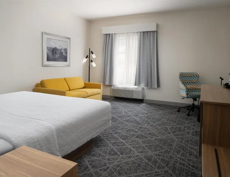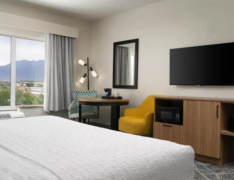 Comfortable Accommodations: Hampton Inn & Suites Albuquerque North/I-25 in Albuquerque offers family rooms with free WiFi, a fitness center, indoor swimming pool, and a hot tub. Guests enjoy a lounge, fitness room, and 24-hour front desk. Dining and Amenities: The hotel serves a continental, American, and buffet breakfast with fresh pastries, cheese, and fruits. Additional amenities include a business area, concierge service, and free on-site parking. Prime Location: Located 7.5 mi from Albuquerque International Sunport, the hotel is a 19-minute walk from Cliff's Amusement Park. Nearby attractions include Bernalillo Metropolitan Courthouse and Albuquerque Convention Center. Guest Satisfaction: Highly rated for room cleanliness, attentive staff, and excellent restaurant. A flat-screen cable TV, a microwave and a small refrigerator are featured in this room. An private bathroom with a hairdryer is also included.