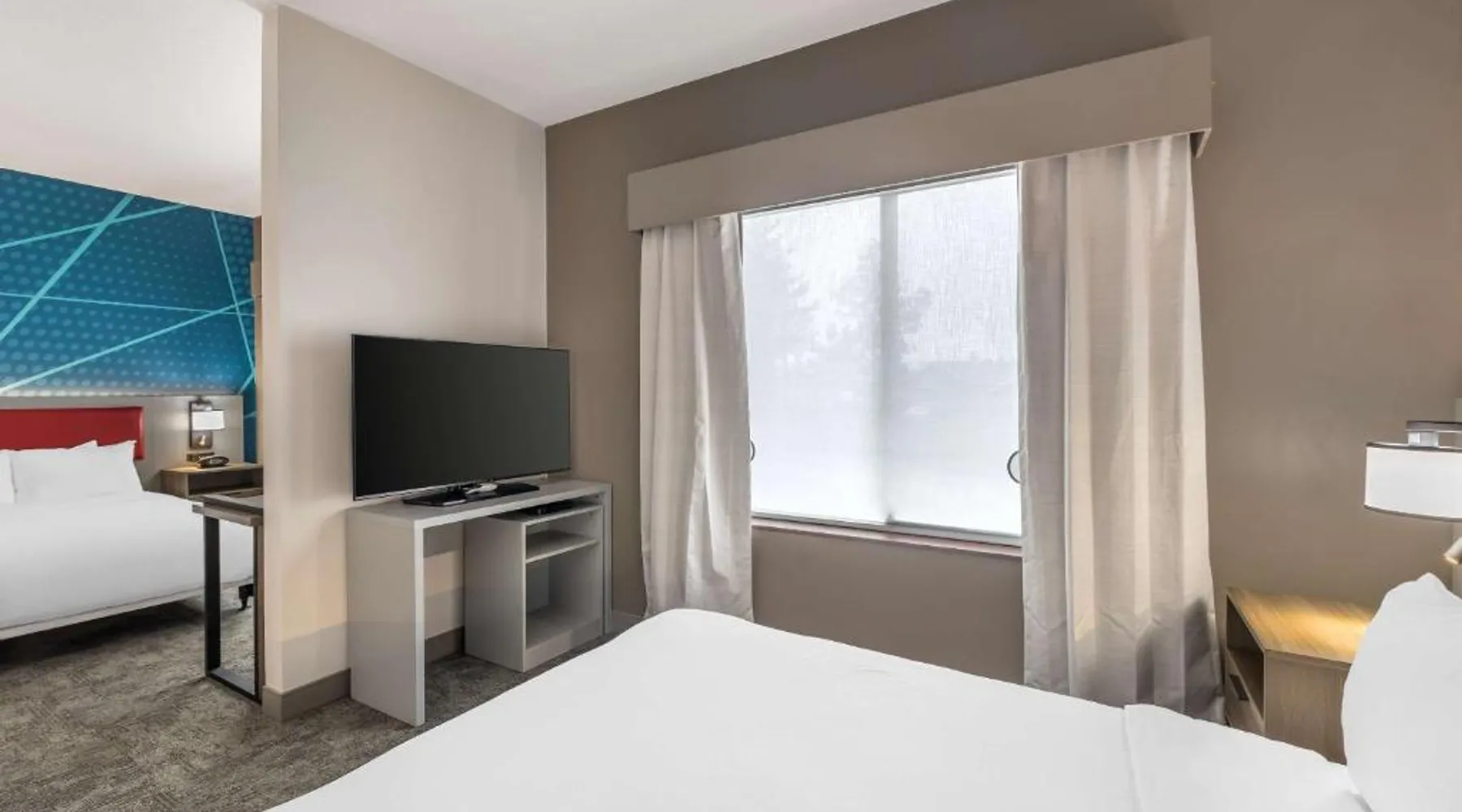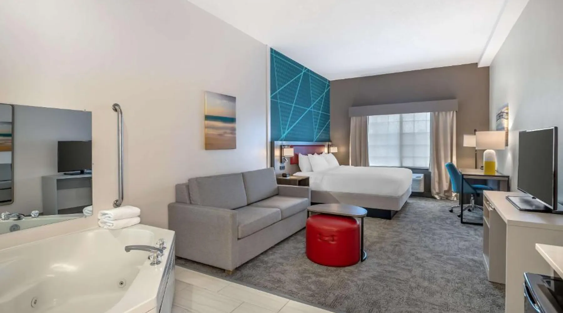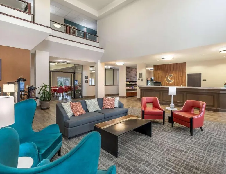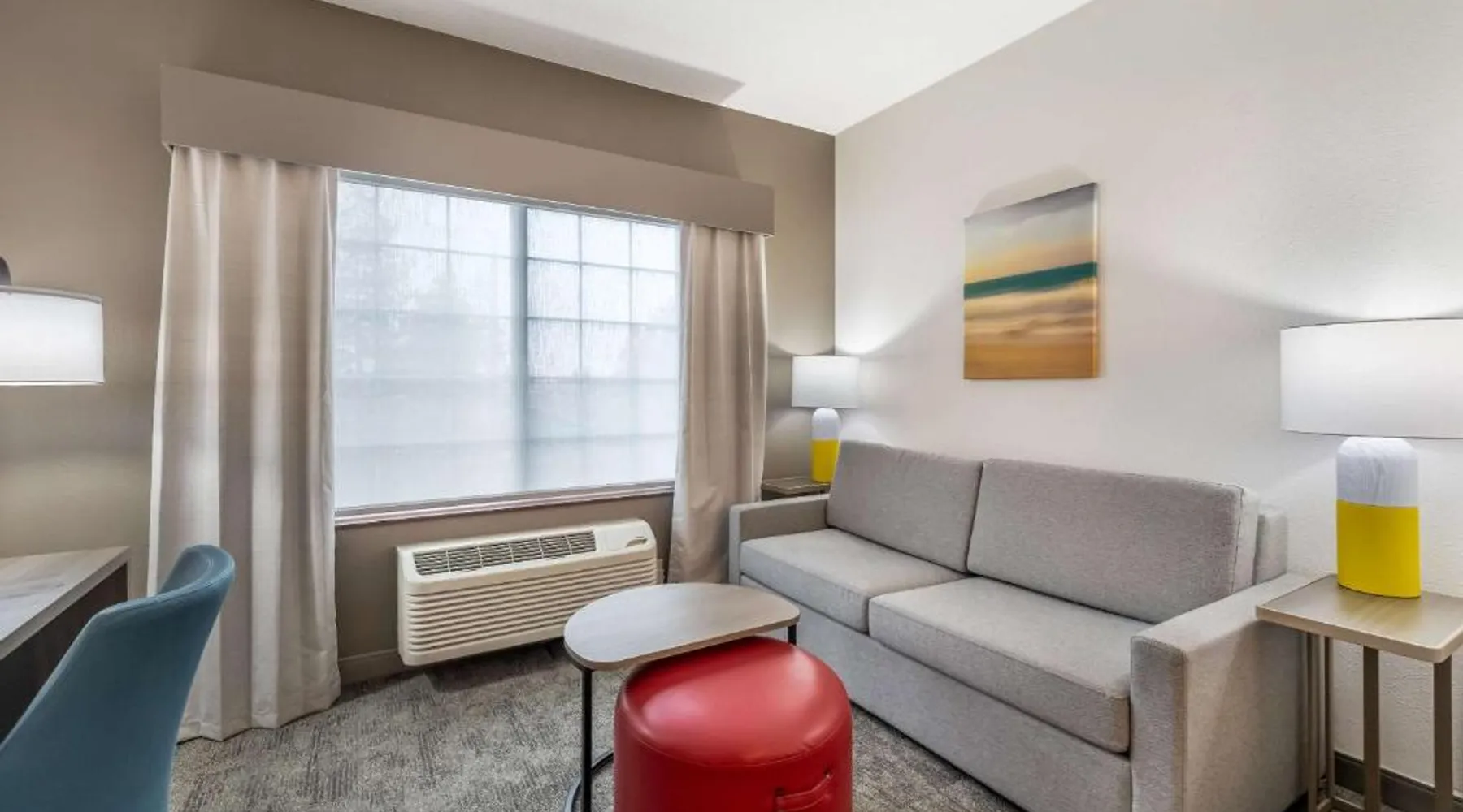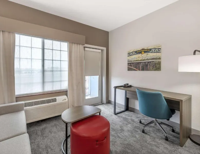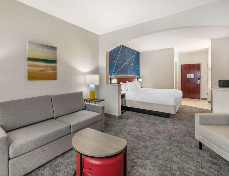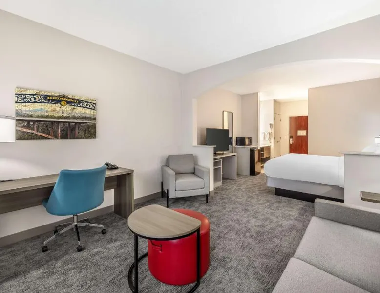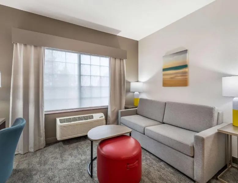 Comfortable Accommodations: Comfort Suites Redmond Airport in Redmond offers air-conditioned rooms with private bathrooms, tea and coffee makers, and free WiFi. Each room includes a work desk, TV, and sofa for added comfort. Relaxing Facilities: Guests can unwind at the spa and wellness center, indoor swimming pool, and hot tub. The property also features a fitness room, lounge, and 24-hour front desk. Convenient Services: The hotel provides a free airport shuttle service, free on-site private parking, and express check-in and check-out. Additional amenities include a business area, housekeeping, and luggage storage. Local Attractions: Located 1.9 mi from Redmond Municipal Airport, the hotel is near Hollinshead Park (14 mi), Drake Park (15 mi), and Ponderosa Park (16 mi). Guests appreciate the breakfast provided by the property and the convenient location. A microwave, refrigerator and flat-screen cable TV are included in this suite.