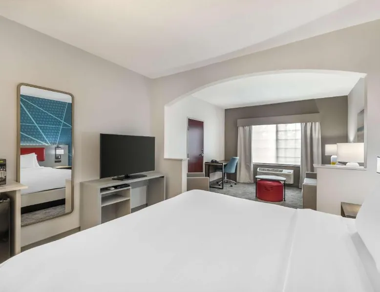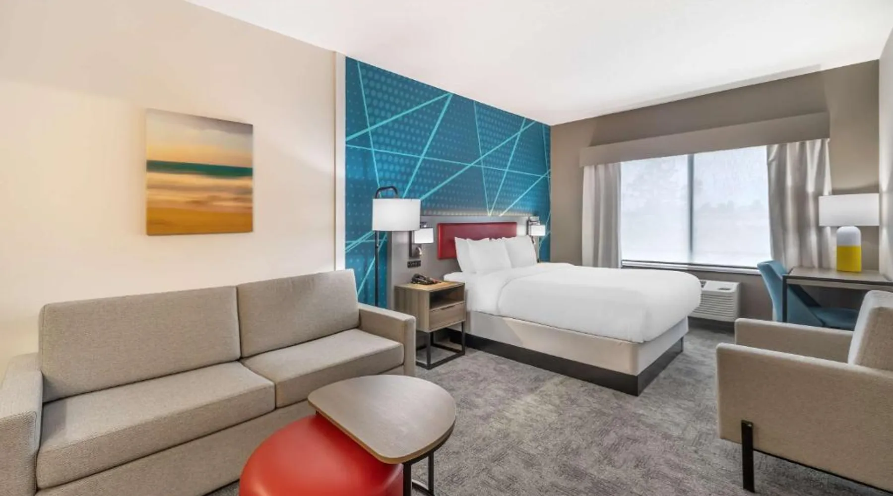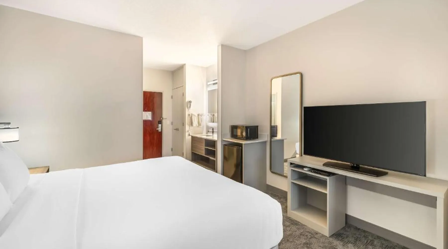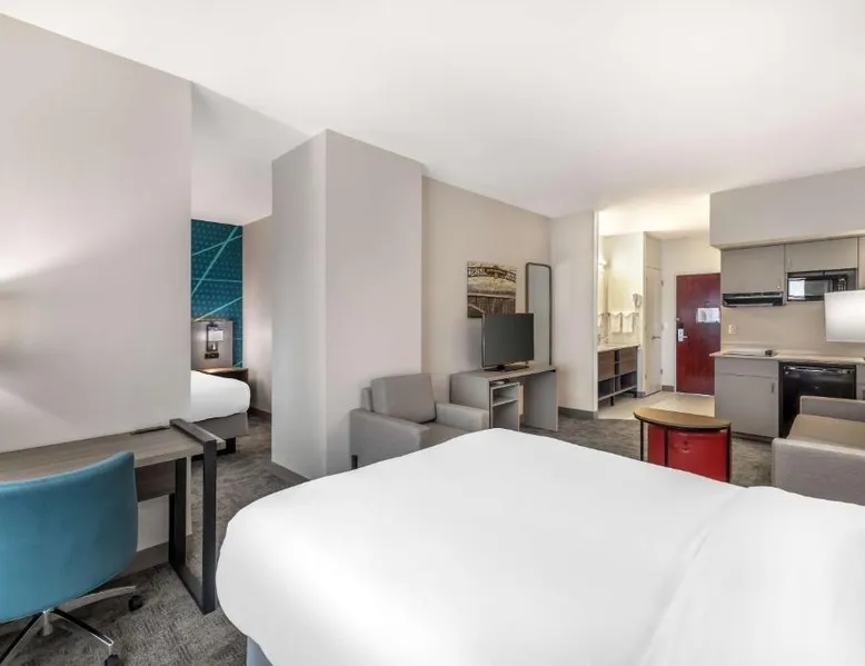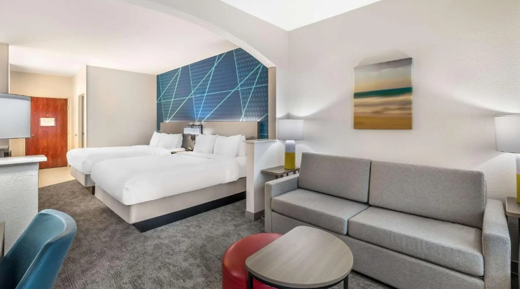 Comfortable Accommodations: Comfort Suites Redmond Airport in Redmond offers air-conditioned rooms with private bathrooms, tea and coffee makers, and free WiFi. Each room includes a work desk, TV, and sofa for added comfort. Relaxing Facilities: Guests can unwind at the spa and wellness center, indoor swimming pool, and hot tub. The property also features a fitness room, lounge, and 24-hour front desk. Convenient Services: The hotel provides a free airport shuttle service, free on-site private parking, and express check-in and check-out. Additional amenities include a business area, housekeeping, and luggage storage. Local Attractions: Located 1.9 mi from Redmond Municipal Airport, the hotel is near Hollinshead Park (14 mi), Drake Park (15 mi), and Ponderosa Park (16 mi). Guests appreciate the breakfast provided by the property and the convenient location. A microwave, refrigerator and flat-screen cable TV are included in this suite.