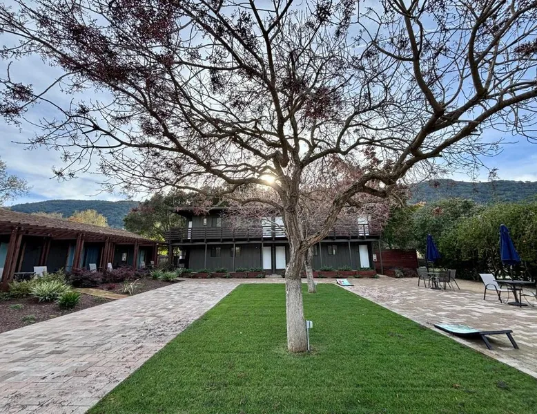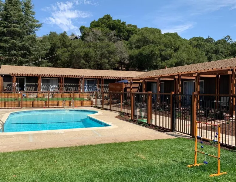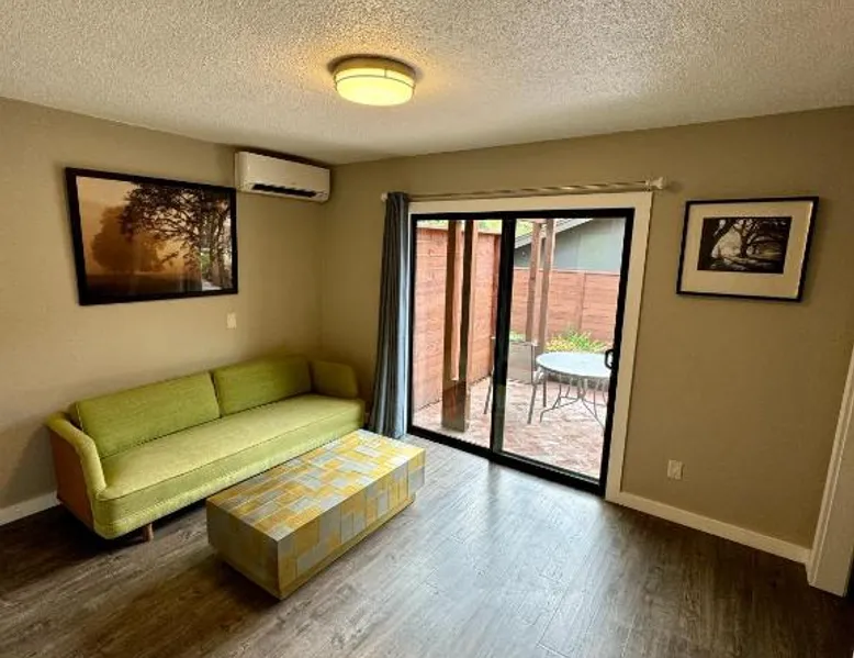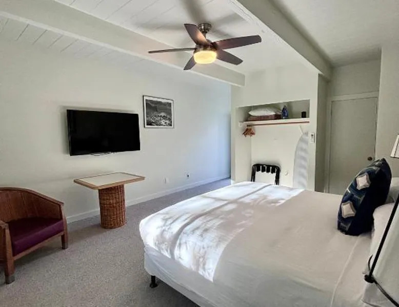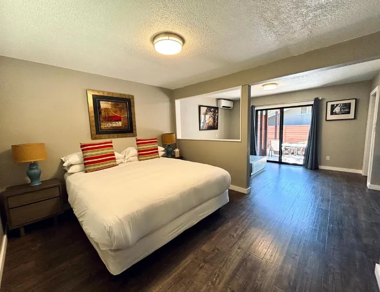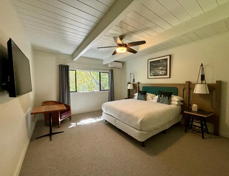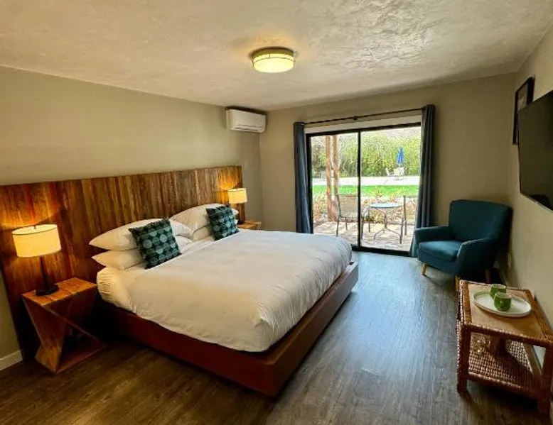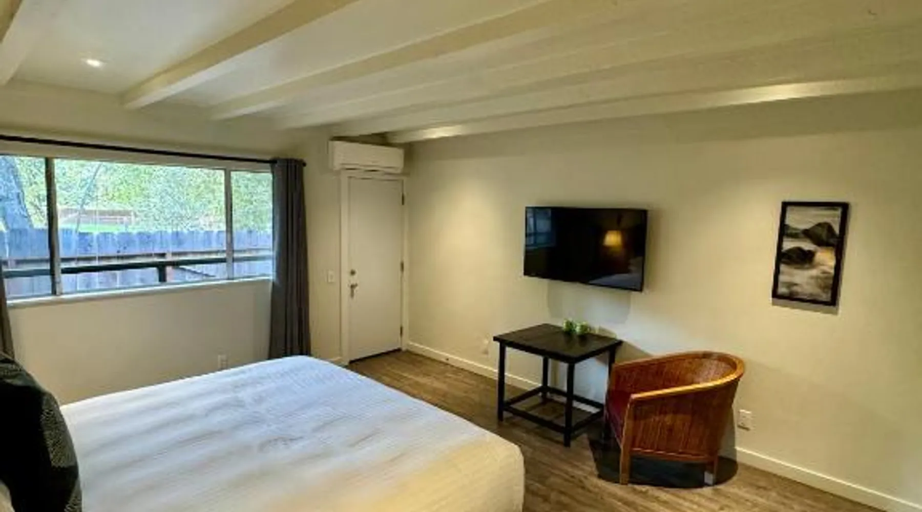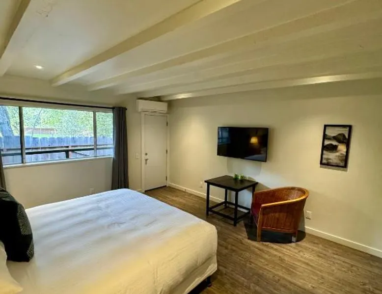 Nestled among the Santa Lucia Mountains, Hidden Valley Inn is just 5 minutes walk to Carmel Valley Village where guests can explore many wine tasting rooms, boutique shops, and fine restaurants offering al fresco style dining. Free guest parking is provided on site. Guest rooms offer cable TV, complimentary WiFi, and a private bathroom with a hairdryer and organic bath products. All rooms will have either a pool, garden, or a mountain view and most offer private outdoor patio space with table and seating. The Inn also offers a spacious communal courtyard surrounding an outdoor swimming pool with lawn and seating Vineyards, golf courses, and scenic trails are all nearby. Guests can visit the nearby Garland Ranch Regional Park, featuring miles of varied hiking trails as well as access to the beautiful Carmel River. Carmel-By-The-Sea, downtown Monterey, and WeatherTech Raceway Laguna Seca are all a short drive away. The Big Sur coast is breathtaking, one hour drive south. This room features a king sized bed. Either a ground level room with outdoor patio or a second level room with deck. It includes in room coffee and cable TV.