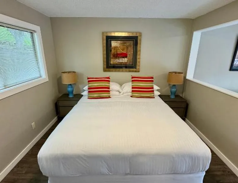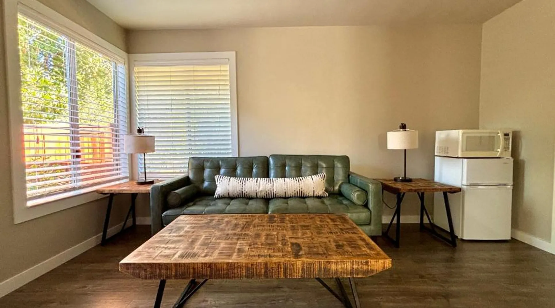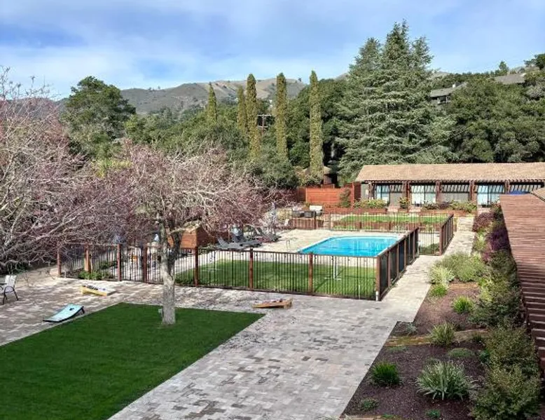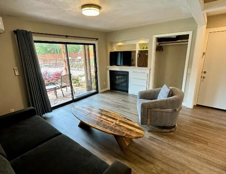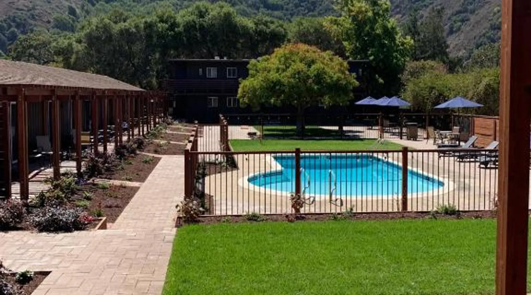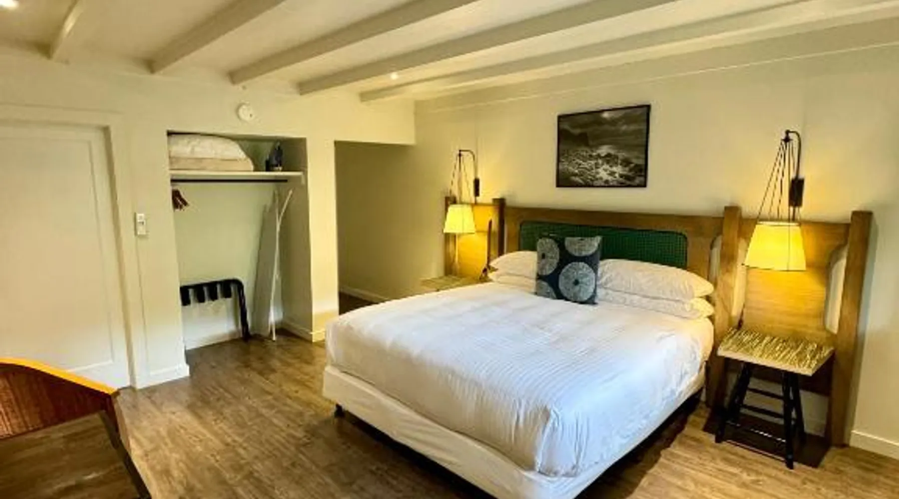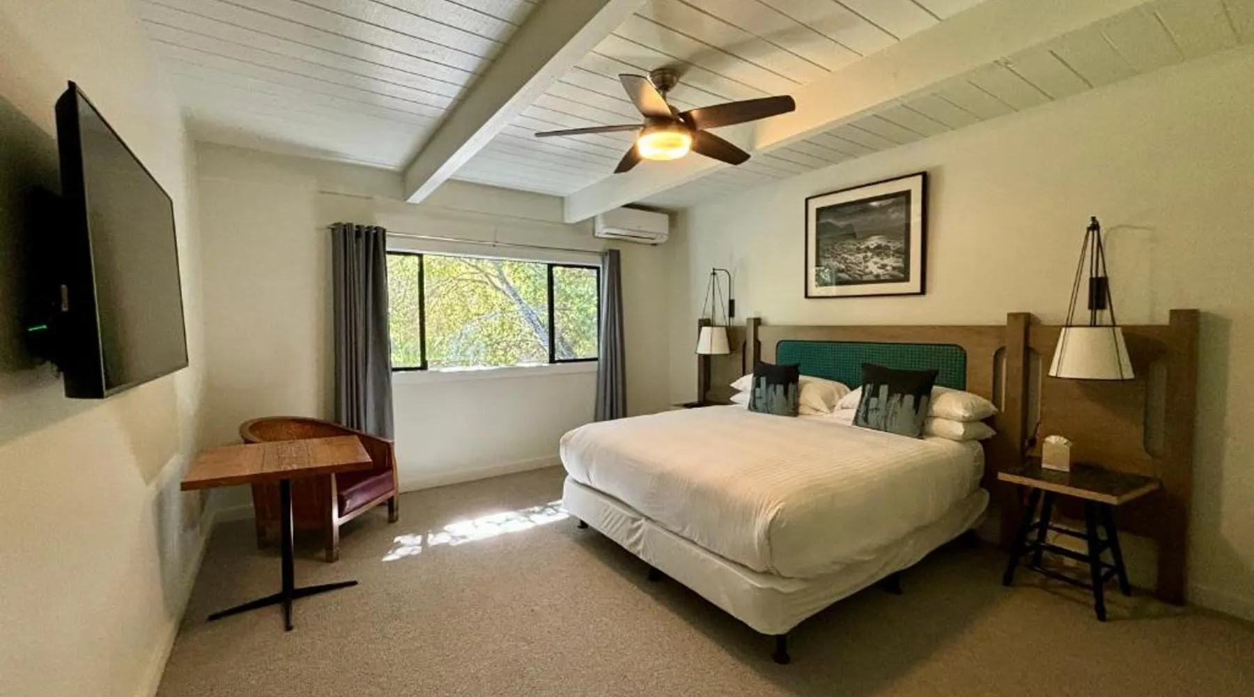 Nestled among the Santa Lucia Mountains, Hidden Valley Inn is just 5 minutes walk to Carmel Valley Village where guests can explore many wine tasting rooms, boutique shops, and fine restaurants offering al fresco style dining. Free guest parking is provided on site. Guest rooms offer cable TV, complimentary WiFi, and a private bathroom with a hairdryer and organic bath products. All rooms will have either a pool, garden, or a mountain view and most offer private outdoor patio space with table and seating. The Inn also offers a spacious communal courtyard surrounding an outdoor swimming pool with lawn and seating Vineyards, golf courses, and scenic trails are all nearby. Guests can visit the nearby Garland Ranch Regional Park, featuring miles of varied hiking trails as well as access to the beautiful Carmel River. Carmel-By-The-Sea, downtown Monterey, and WeatherTech Raceway Laguna Seca are all a short drive away. The Big Sur coast is breathtaking, one hour drive south. This room features a king sized bed. Either a ground level room with outdoor patio or a second level room with deck. It includes in room coffee and cable TV.