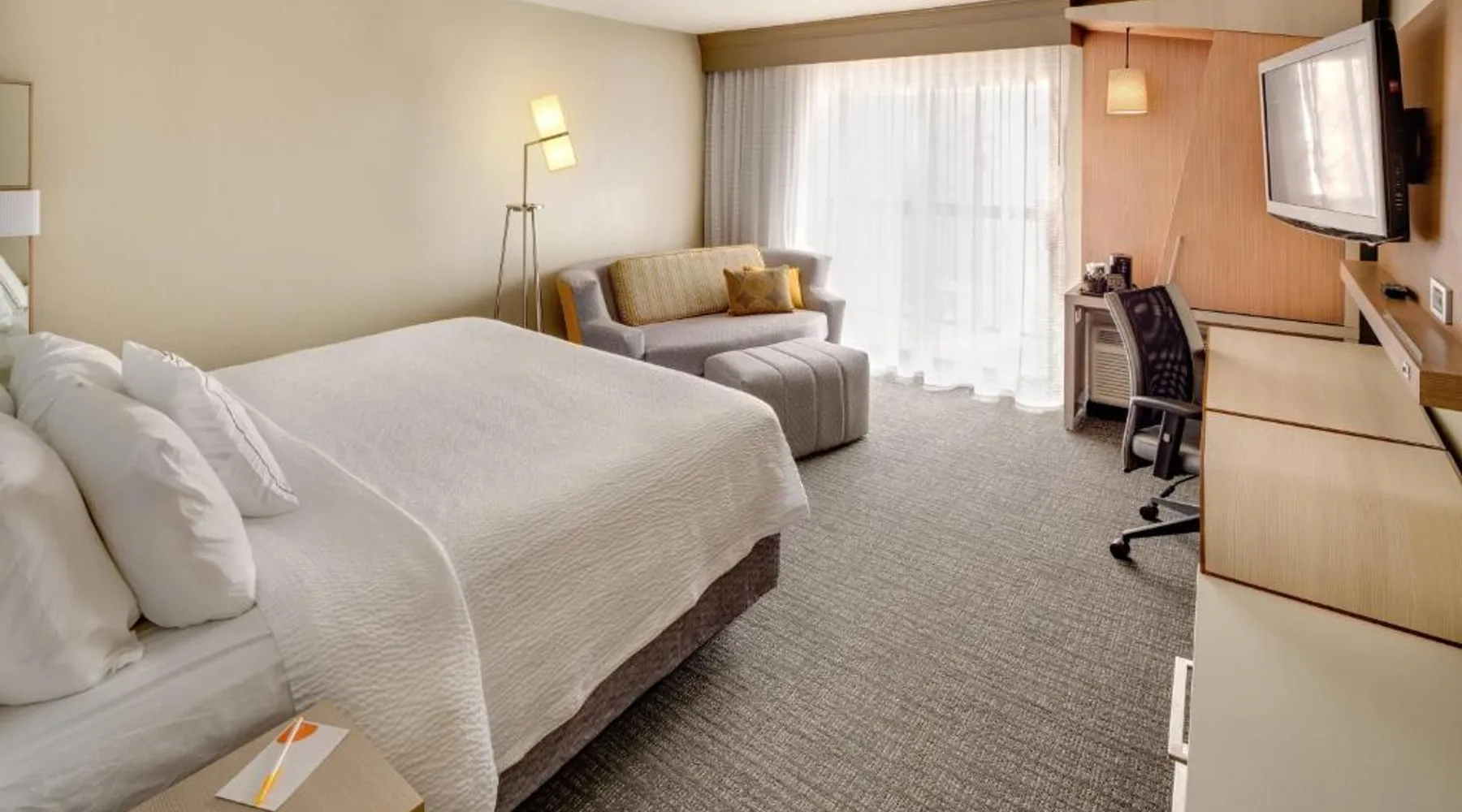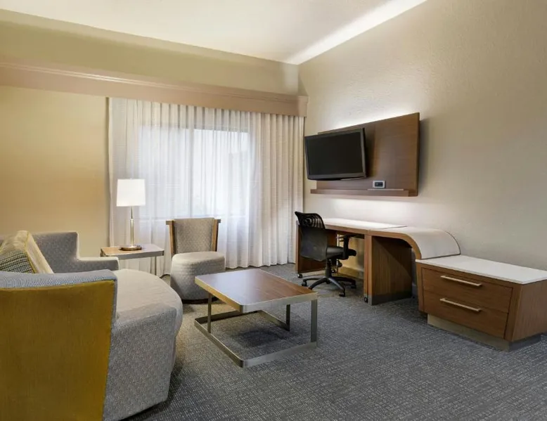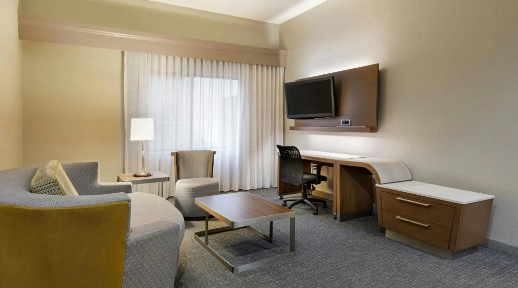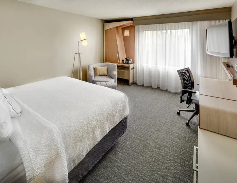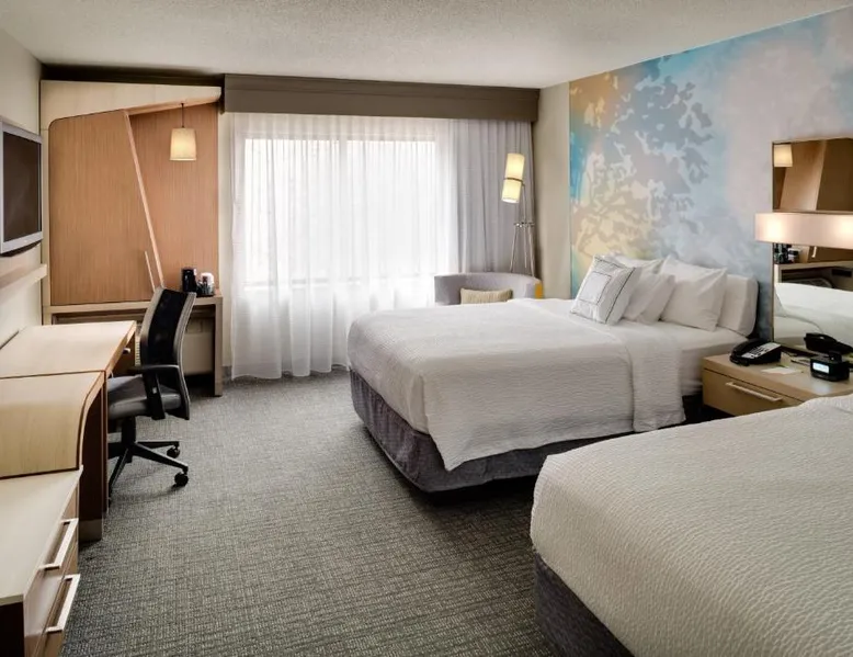 Comfortable Accommodations: Courtyard St. Louis Airport/Earth City in Bridgeton offers comfortable rooms with air-conditioning, private bathrooms, and free WiFi. Each room includes a work desk, bath or shower, and a seating area with a sofa. Exceptional Facilities: Guests can enjoy an indoor swimming pool, fitness center, and a restaurant serving American cuisine. Additional amenities include a elevator and a 24-hour front desk. Free on-site parking is available. Prime Location: Located 6.8 mi from St. Louis Lambert International Airport, the hotel is near attractions such as Hollywood Casino St. Louis (3.7 mi), St. Louis Gateway Arch (22 mi), and Forest Park (14 mi). Guests appreciate the bed comfort and room cleanliness. Offering free Wi-Fi and cable TV, this room includes tea and coffee-making facilities.