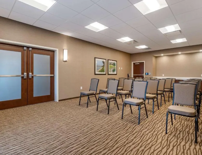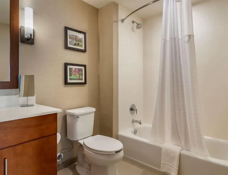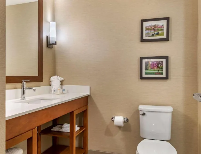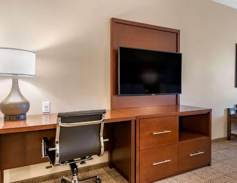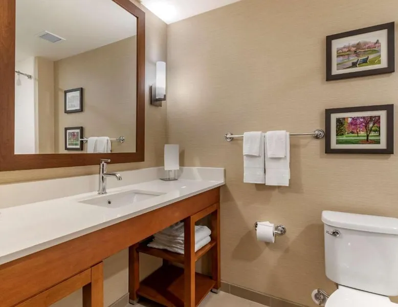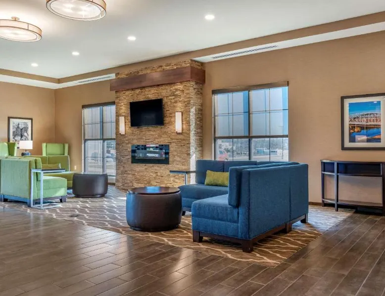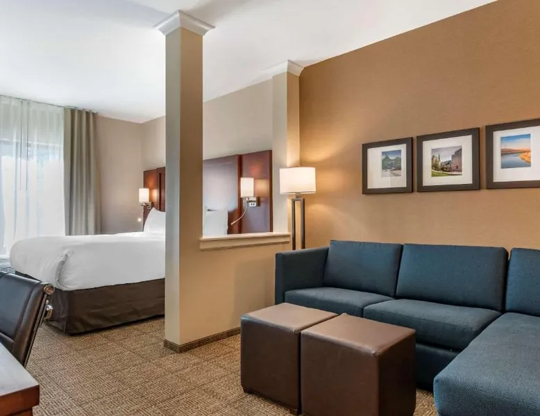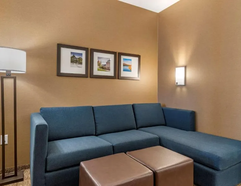 Comfortable Accommodations: Comfort Suites Camp Hill-Harrisburg West in Camp Hill offers rooms with air-conditioning, free WiFi, and private check-in and check-out services. Each room includes a work desk, refrigerator, and TV. Facilities and Services: Guests can enjoy a fitness center, lounge, and outdoor seating area. Additional amenities include a minimarket, child-friendly buffet, business area, and free on-site parking. Dining Options: A buffet breakfast is served with warm dishes, fresh pastries, fruits, and juice. Location and Attractions: Located 11 mi from Harrisburg International Airport, the hotel is near Pennsylvania State Capitol (2.5 mi), National Civil War Museum (4.3 mi), and Hershey Park Stadium (16 mi). Activities include fishing, hiking, and cycling. Guests appreciate room cleanliness, comfort, and staff support. The spacious suite provides air conditioning, a tea and coffee maker and a seating area.