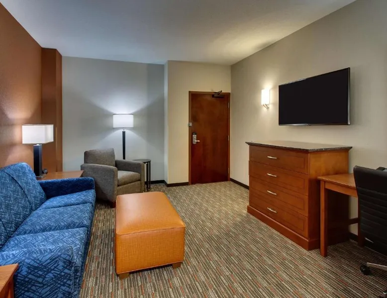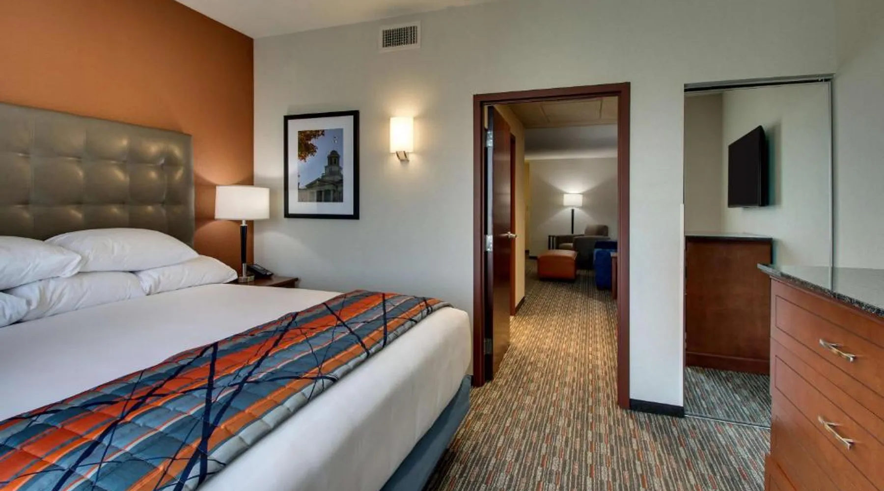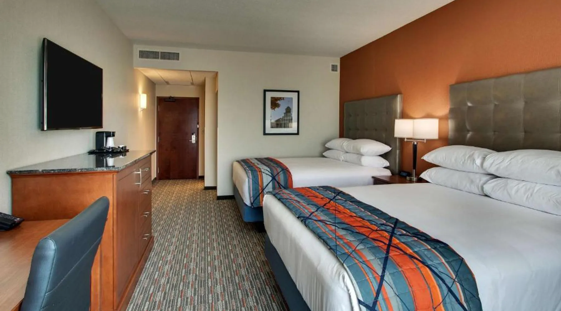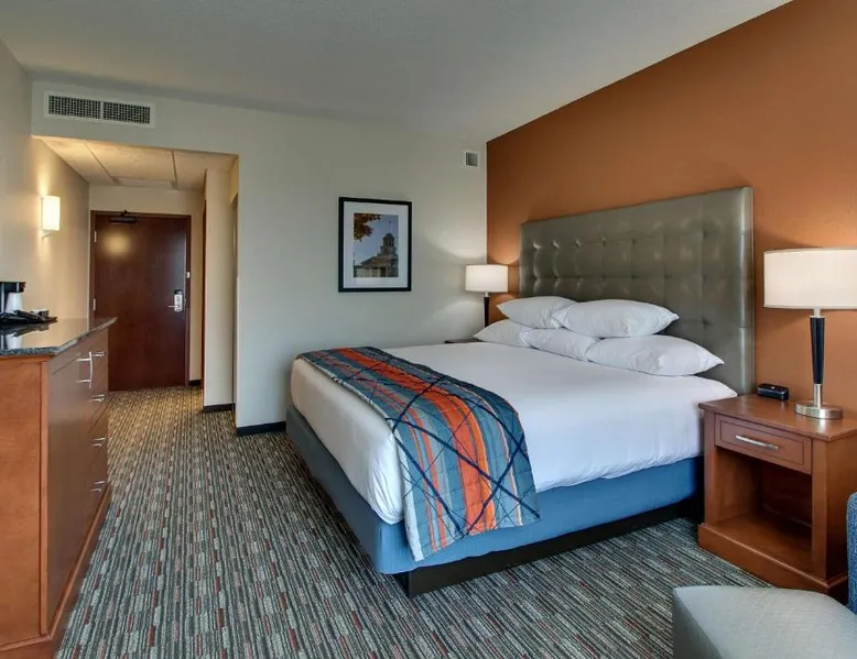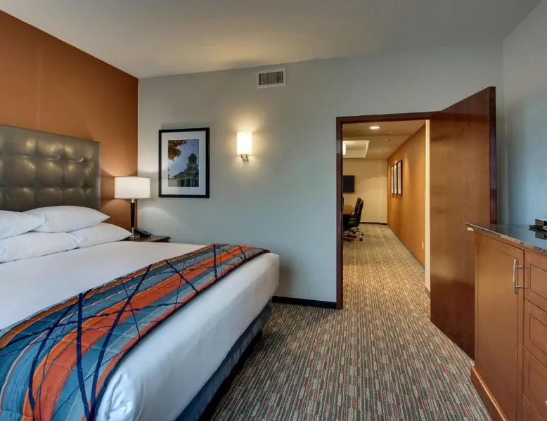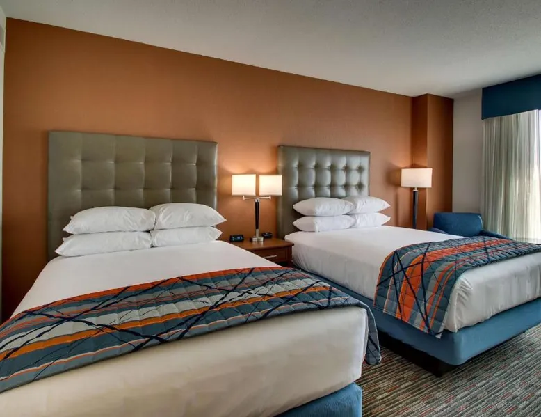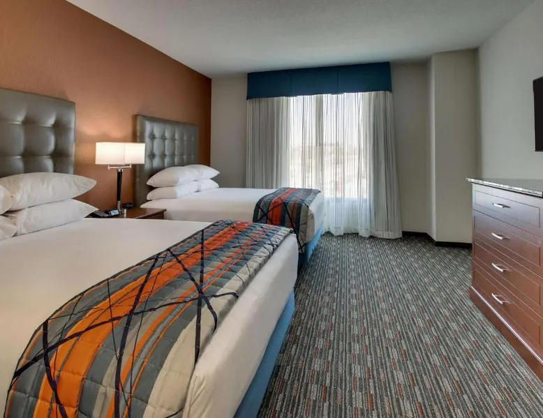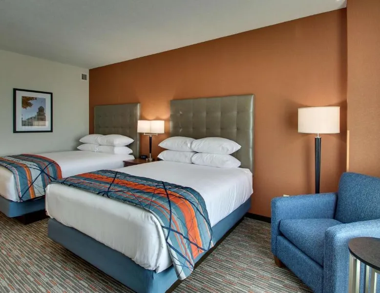 Comfortable Accommodations: Drury Inn & Suites Iowa City Coralville in Coralville offers family rooms with air-conditioning, private bathrooms, and free WiFi. Each room includes a work desk, refrigerator, and TV. Leisure Facilities: Guests can enjoy a fitness center, outdoor swimming pool, and hot tub. Additional amenities include a elevator, business area, and free on-site private parking. Dining Options: A buffet breakfast is provided each morning, along with dinner options. The property staff and service support receive high ratings from guests. Nearby Attractions: Kinnick Stadium is 2.5 mi away, Paramount Theater 24 mi, and The Eastern Iowa Airport 19 mi from the hotel. This air-conditioned suite is consisted of of a flat-screen TV with cable channels and a private bathroom. The unit has 3 beds.