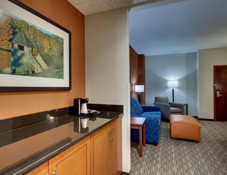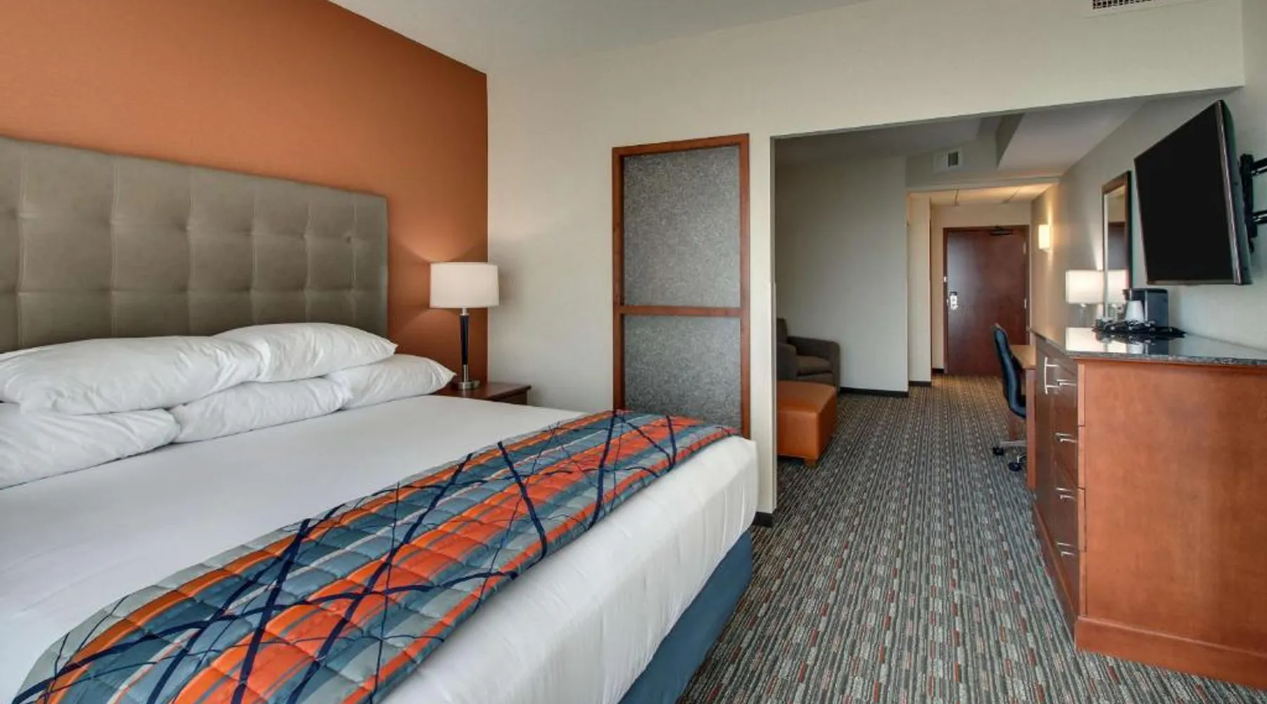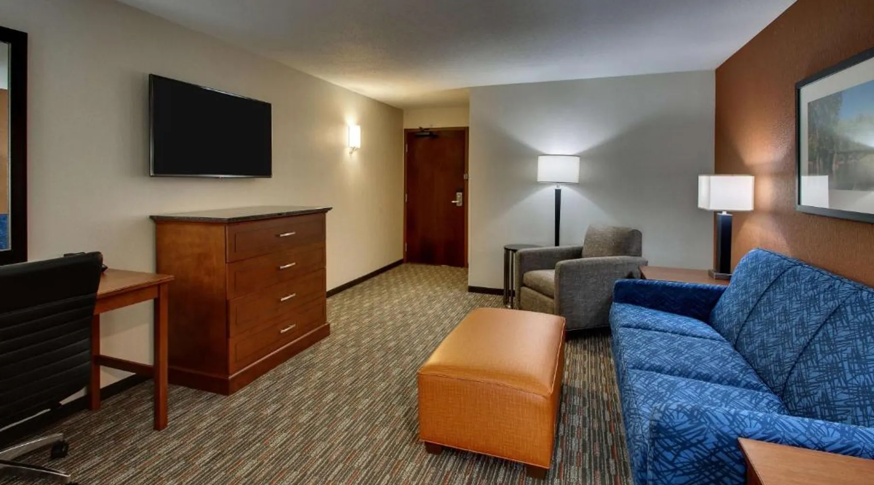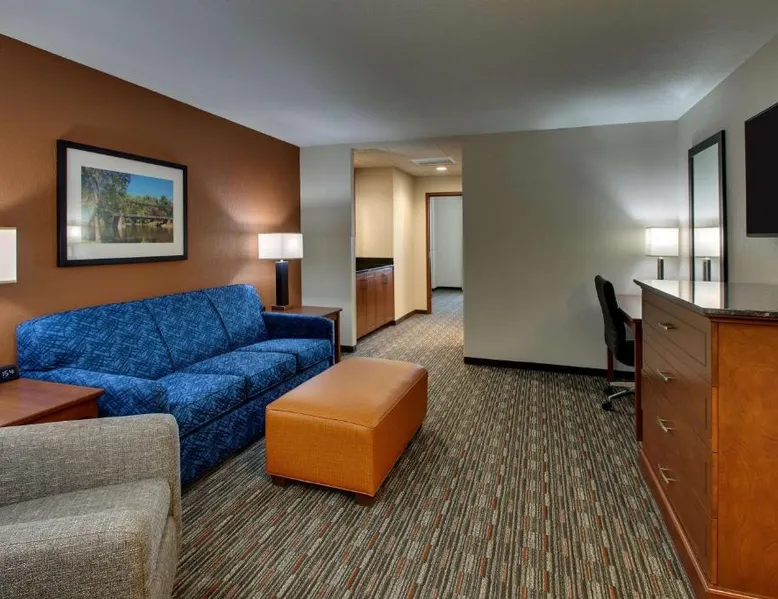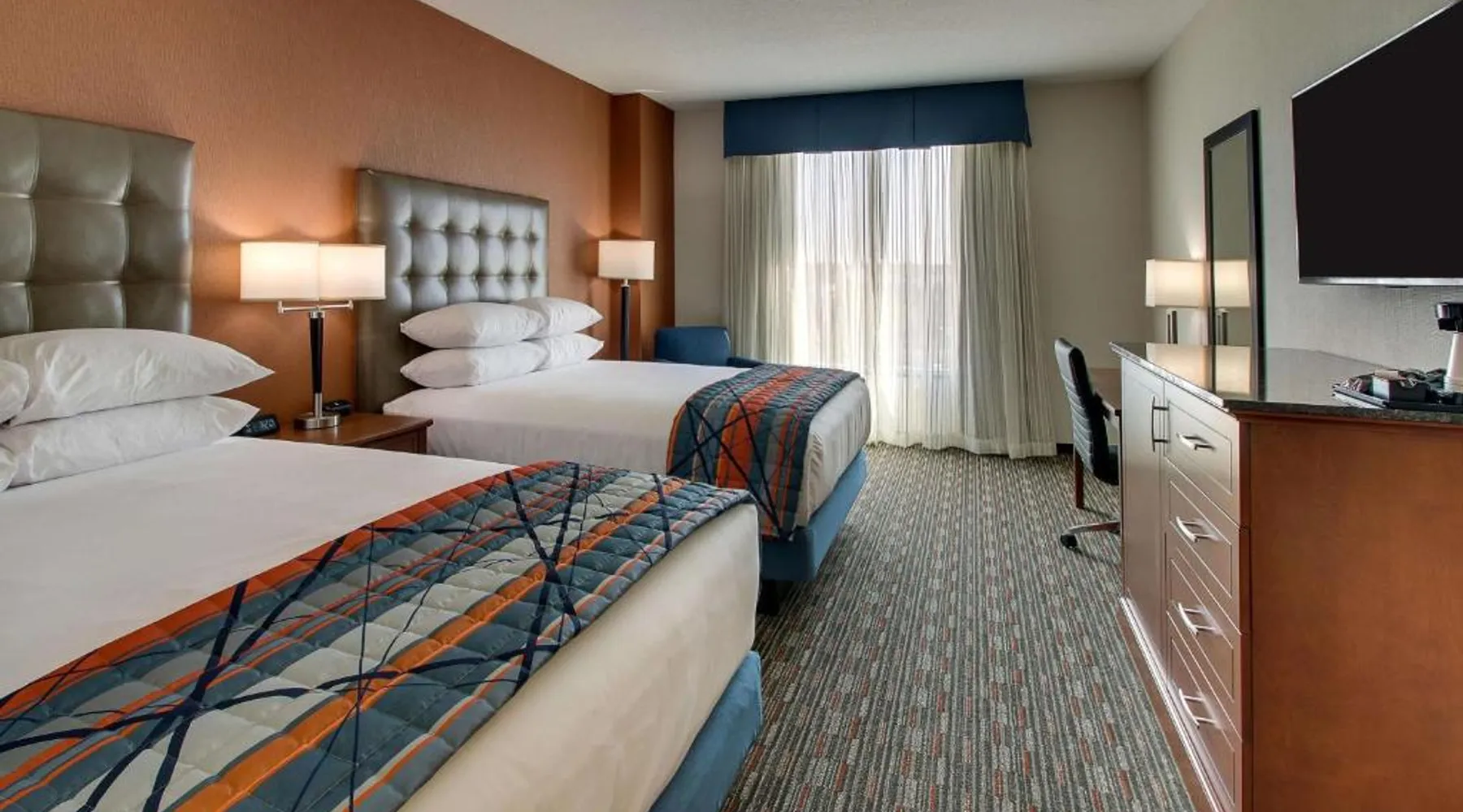Comfortable Accommodations: Drury Inn & Suites Iowa City Coralville in Coralville offers family rooms with air-conditioning, private bathrooms, and free WiFi. Each room includes a work desk, refrigerator, and TV. Leisure Facilities: Guests can enjoy a fitness center, outdoor swimming pool, and hot tub. Additional amenities include a elevator, business area, and free on-site private parking. Dining Options: A buffet breakfast is provided each morning, along with dinner options. The property staff and service support receive high ratings from guests. Nearby Attractions: Kinnick Stadium is 2.5 mi away, Paramount Theater 24 mi, and The Eastern Iowa Airport 19 mi from the hotel. This air-conditioned suite is consisted of of a flat-screen TV with cable channels and a private bathroom. The unit has 3 beds.