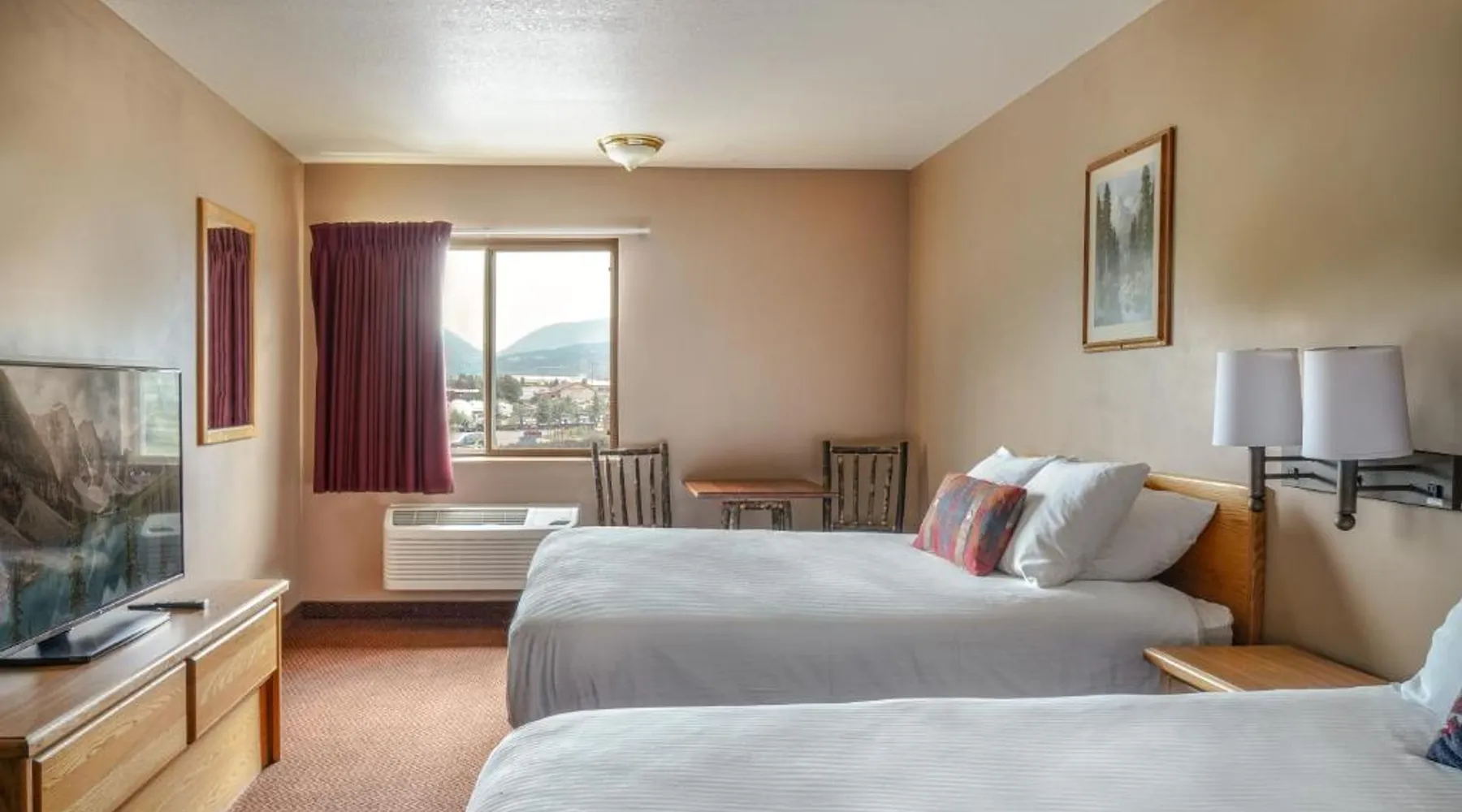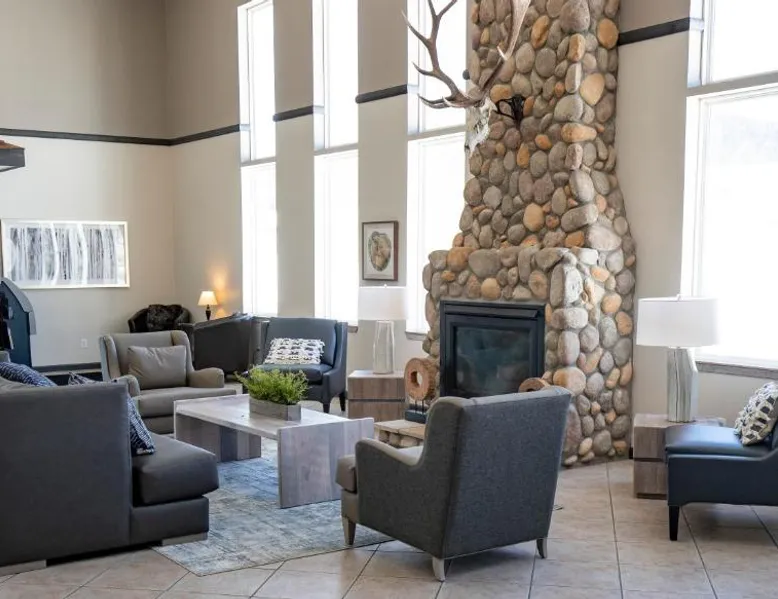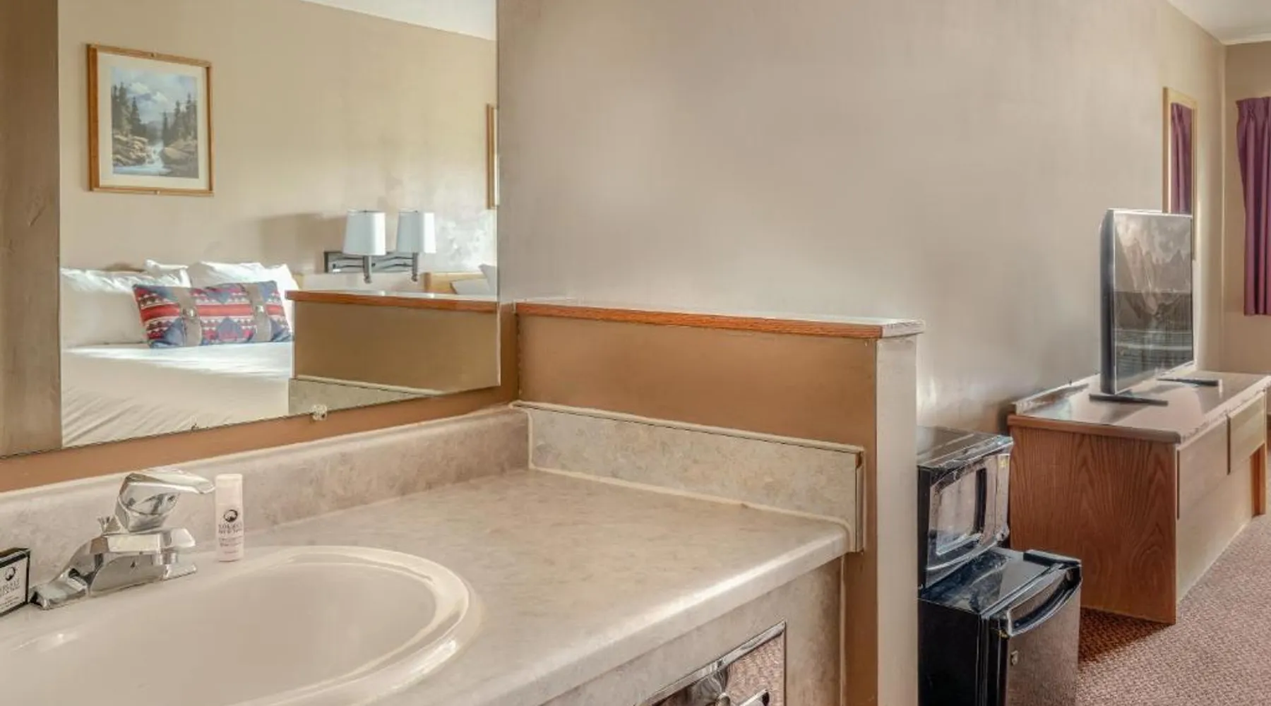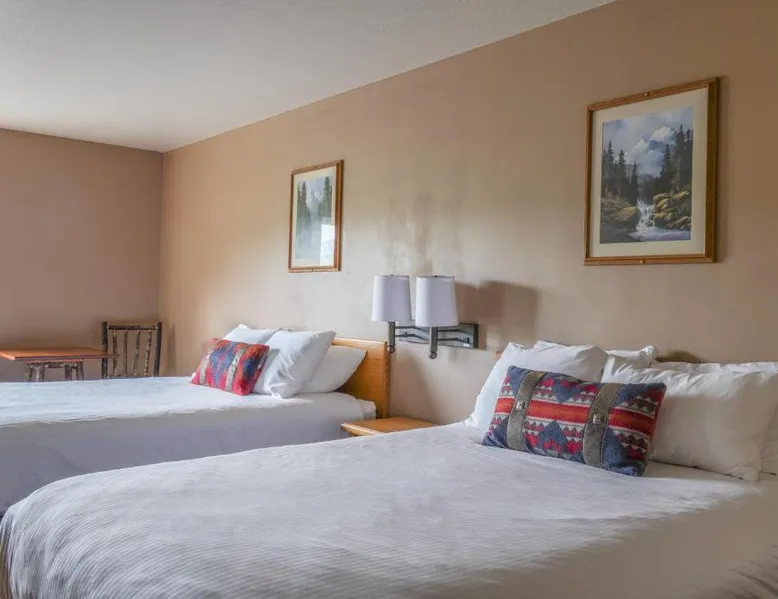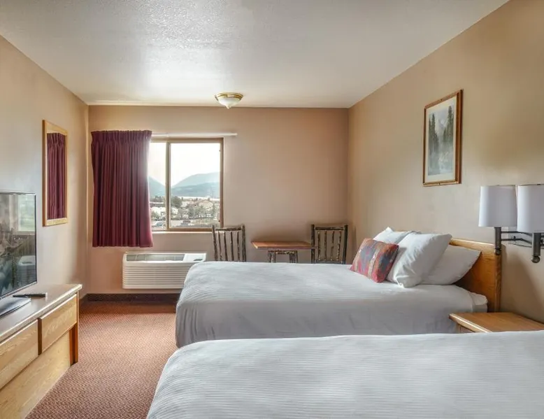 Comfortable Accommodations: Whitewater Inn in Big Sky offers comfortable rooms with air-conditioning, tea and coffee makers, refrigerators, and microwaves. Each room includes a private bathroom and essential amenities for a pleasant stay. Leisure Facilities: Guests can enjoy an indoor swimming pool, fitness center, and free WiFi. Additional facilities include a hot tub, lounge, and 24-hour front desk. Free on-site parking is available for convenience. Activities and Location: The hotel is located 43 mi from Bozeman Yellowstone International Airport. Activities available include skiing and hiking, with ski passes available for purchase at the hotel. A TV, a microwave, a small fridge and a coffee machine are provided in this room.