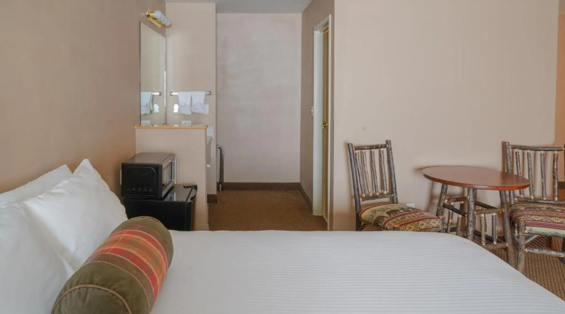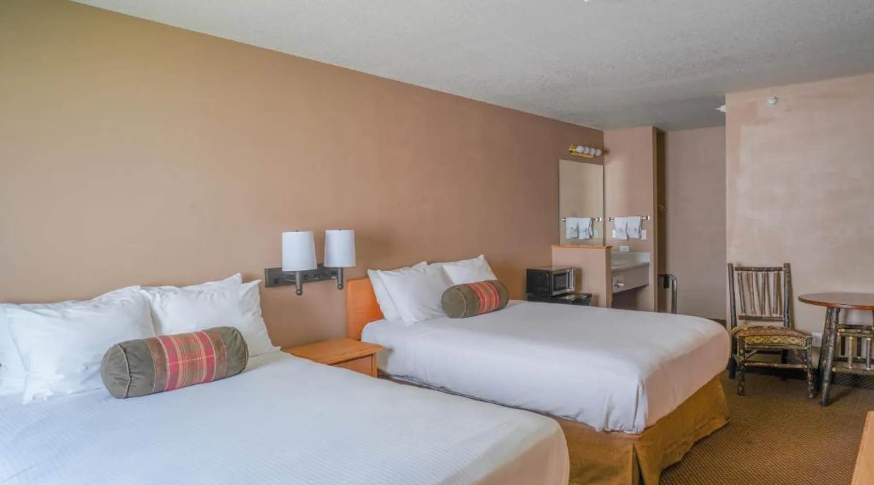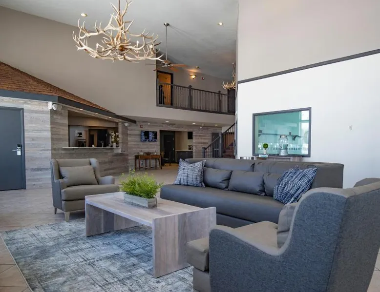 Comfortable Accommodations: Whitewater Inn in Big Sky offers comfortable rooms with air-conditioning, tea and coffee makers, refrigerators, and microwaves. Each room includes a private bathroom and essential amenities for a pleasant stay. Leisure Facilities: Guests can enjoy an indoor swimming pool, fitness center, and free WiFi. Additional facilities include a hot tub, lounge, and 24-hour front desk. Free on-site parking is available for convenience. Activities and Location: The hotel is located 43 mi from Bozeman Yellowstone International Airport. Activities available include skiing and hiking, with ski passes available for purchase at the hotel. A TV, a microwave, a small fridge and a coffee machine are provided in this room.