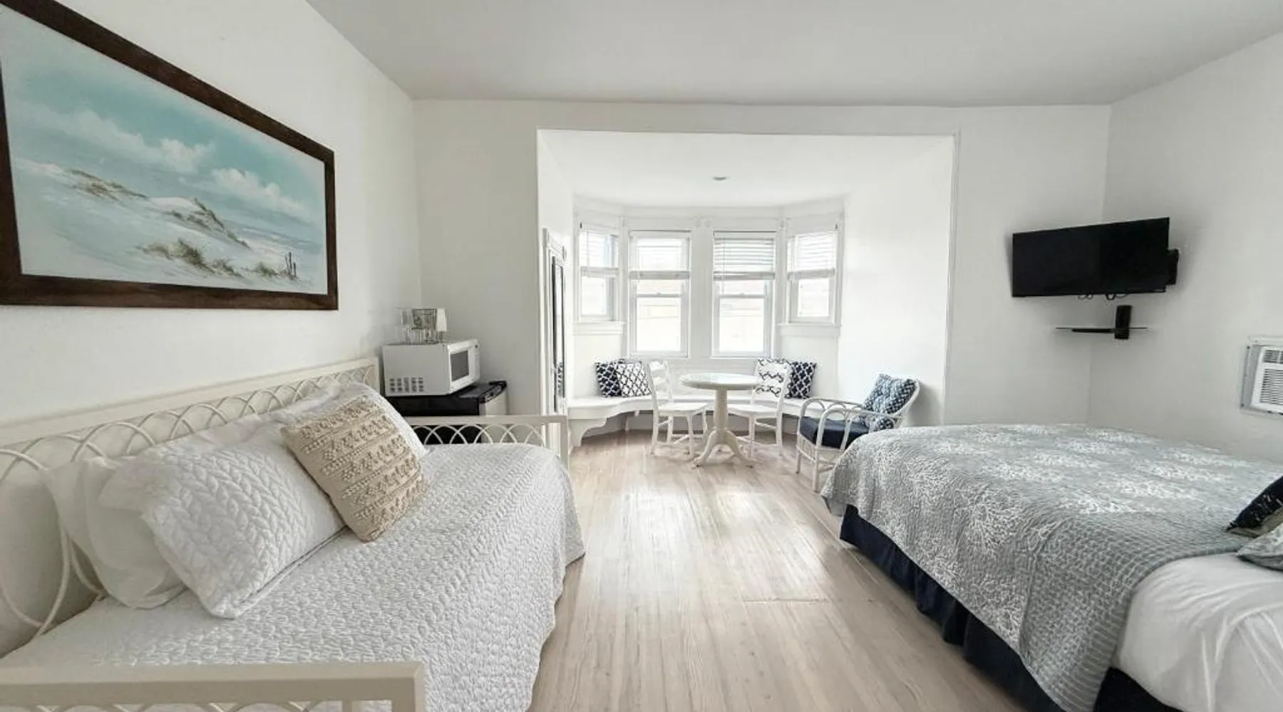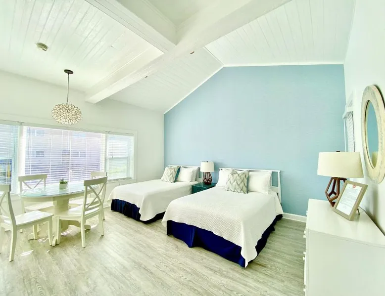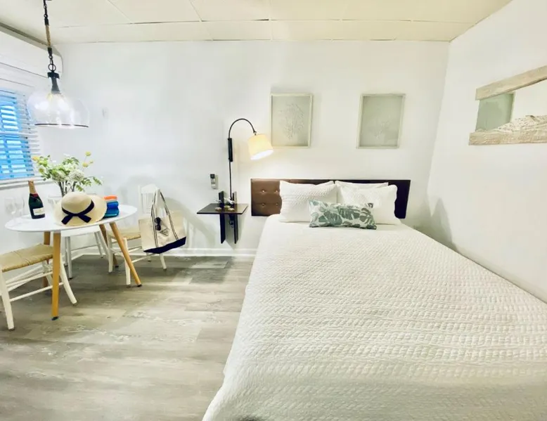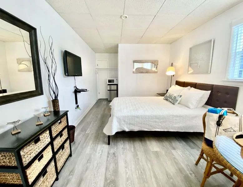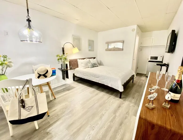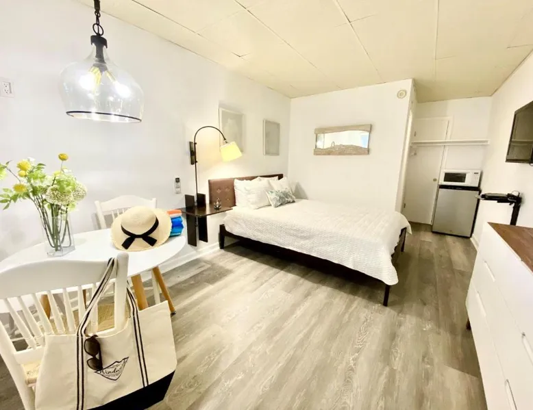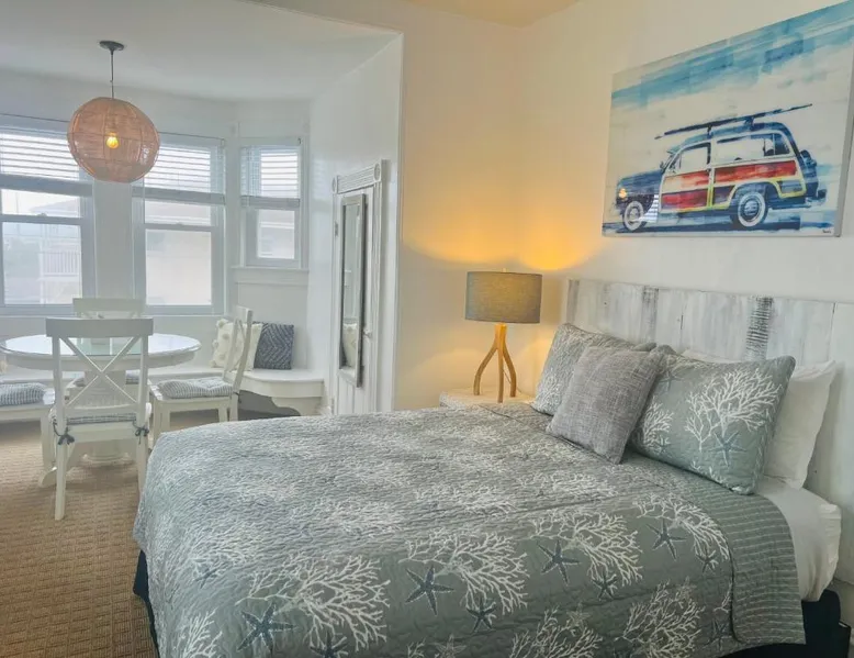 Historic Setting: Windward at the Beach in Beach Haven offers a 3-star inn experience housed in a historic building. The property features family rooms and a concierge service, ensuring a comfortable stay. Comfortable Amenities: Guests enjoy free WiFi, air-conditioning, private bathrooms with free toiletries, and amenities such as a refrigerator, microwave, TV, and a seating area. Additional features include a kitchenette with a dining table, oven, stovetop, and toaster. Free off-site parking is available, and the inn provides a ground-floor unit with carpeted floors. Prime Location: Located 39 mi from Atlantic City International Airport, the inn is a short walk from Beach Haven Dog-Friendly Beach (16-minute walk), Fantasy Island Amusement Park (0.6 mi), Earth Sea Sky (16-minute walk), and Saint Mary's Church (17 mi). Boating is available in the surrounding area. Guest Satisfaction: Highly rated for its beach access, room cleanliness, and convenient location. This studio is on the 2nd floor and features a queen bed, plus a twin day bed with trundle, a private bathroom, flat-screen TV, and a bay window seating area.