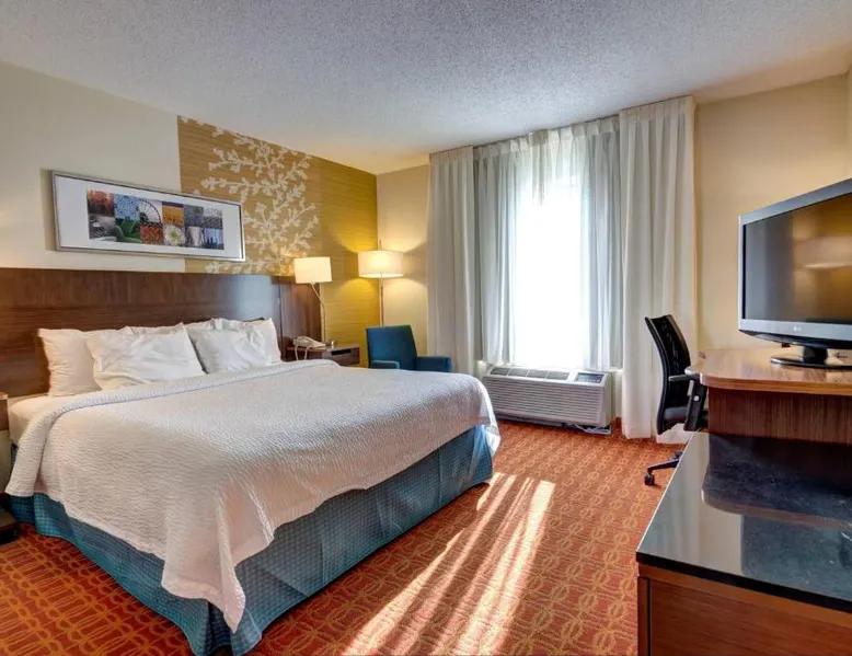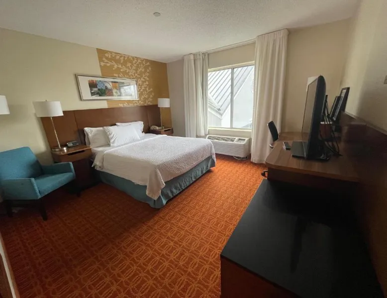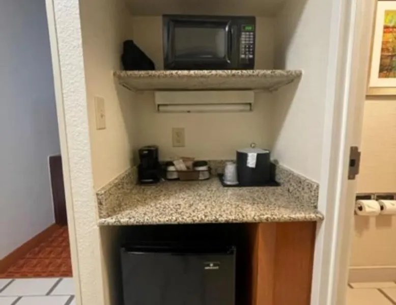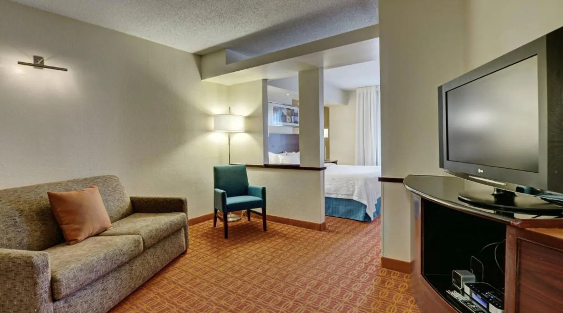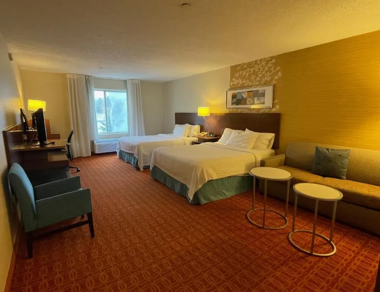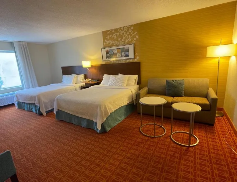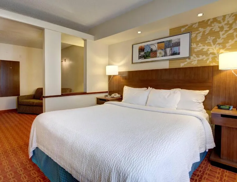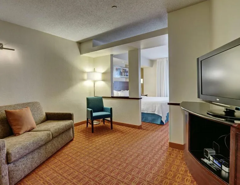 Comfortable Accommodations: Fairfield Inn and Suites by Marriott Potomac Mills Woodbridge in Woodbridge offers comfortable rooms with air-conditioning, private bathrooms, and modern amenities. Each room includes a work desk, sofa bed, and free WiFi. Exceptional Facilities: Guests can enjoy an indoor swimming pool, fitness room, and outdoor seating area. Additional facilities include a picnic area, room service, and free on-site parking. Convenient Location: Located 24 mi from Ronald Reagan Washington National Airport, the hotel is near attractions such as Occoquan National Wildlife Refuge (4.3 mi) and Lake Ridge Golf Park And Marina (4.3 mi). Guests appreciate the convenient location and room comfort. This suite features a refrigerator, microwave, seating area and flat-screen TV.