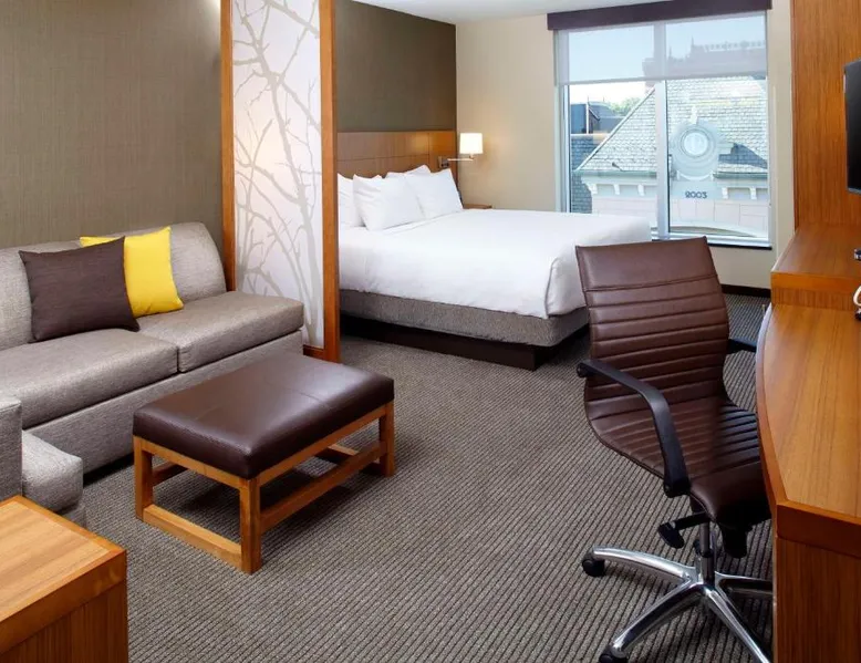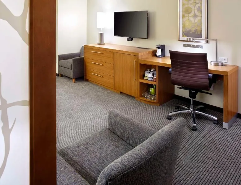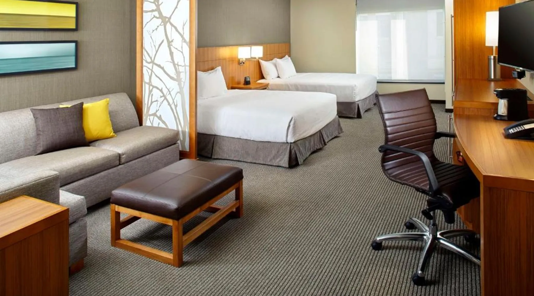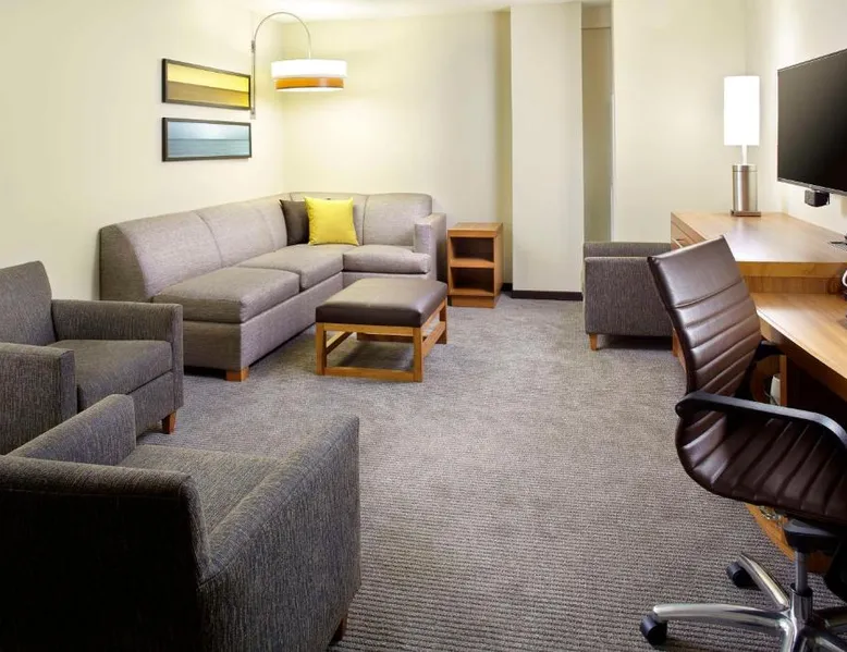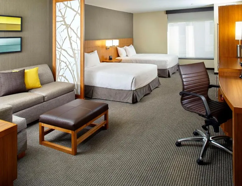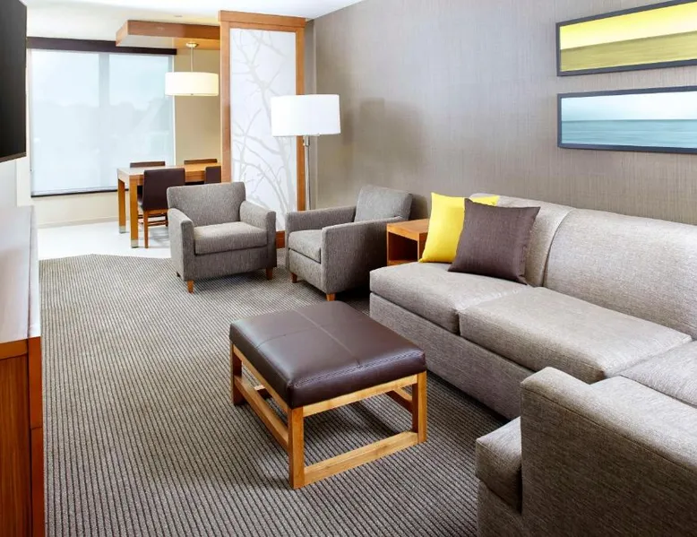 Comfortable Accommodations: Hyatt Place Cleveland/Lyndhurst/Legacy Village in Lyndhurst offers family rooms with air-conditioning, private bathrooms, and modern amenities. Each room includes a tea and coffee maker, hypoallergenic bedding, and free WiFi. Dining and Leisure: The family-friendly restaurant serves American cuisine, complemented by a bar. Guests can also enjoy an indoor swimming pool, fitness center, and lounge. Free on-site parking is available. Prime Location: Located a few steps from Contessa Gallery and a 17-minute walk to Beachwood Place Mall, the hotel is near attractions such as Cleveland Cinemas and Canterbury Golf Club. Guests appreciate the convenient location and nearby shops. This room includes a separate living area and a sofa bed.