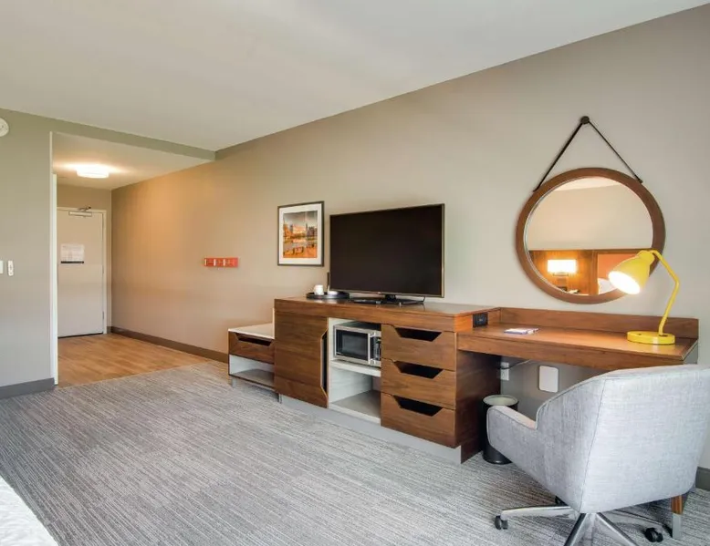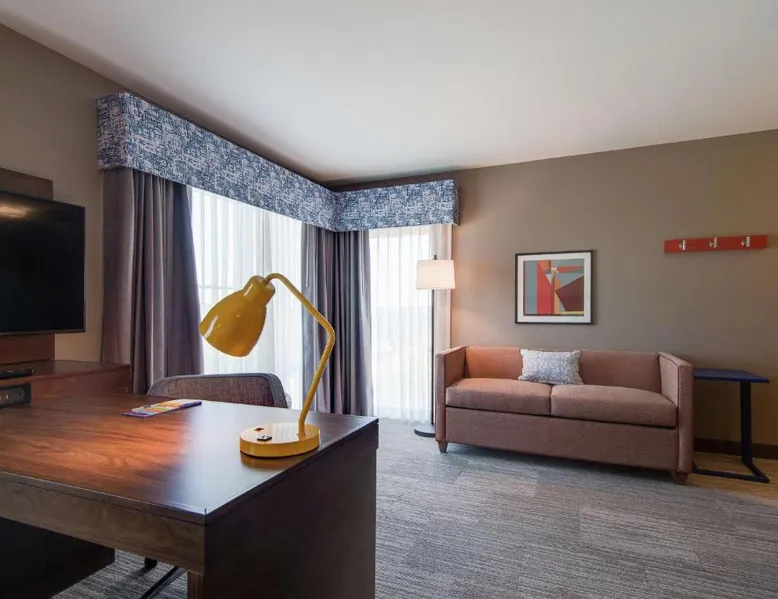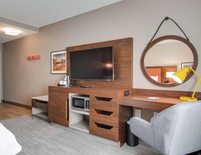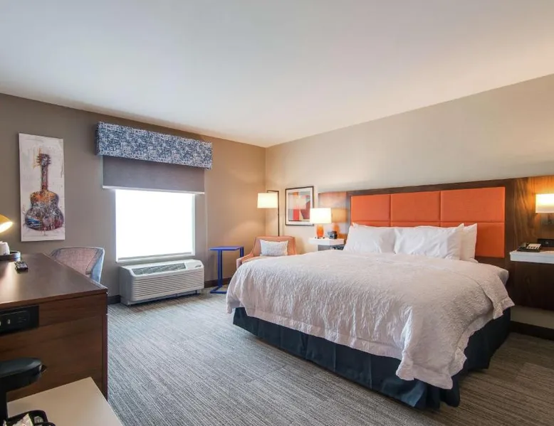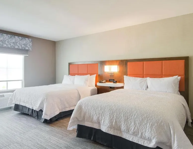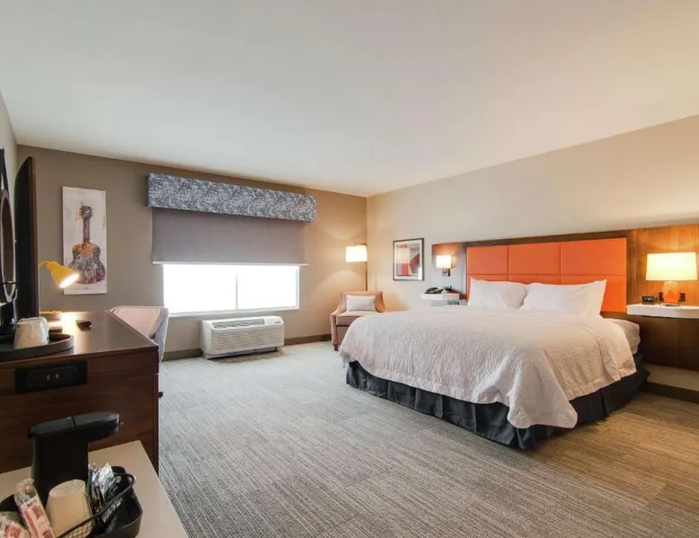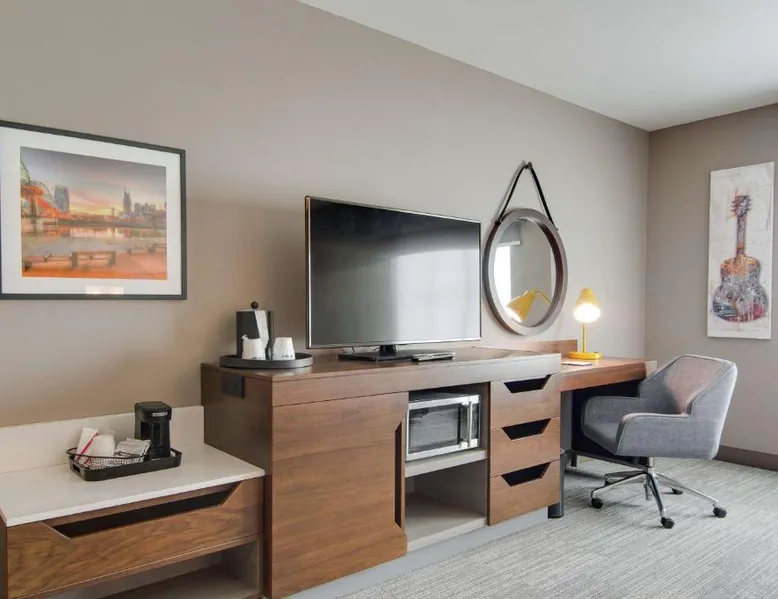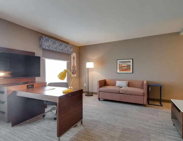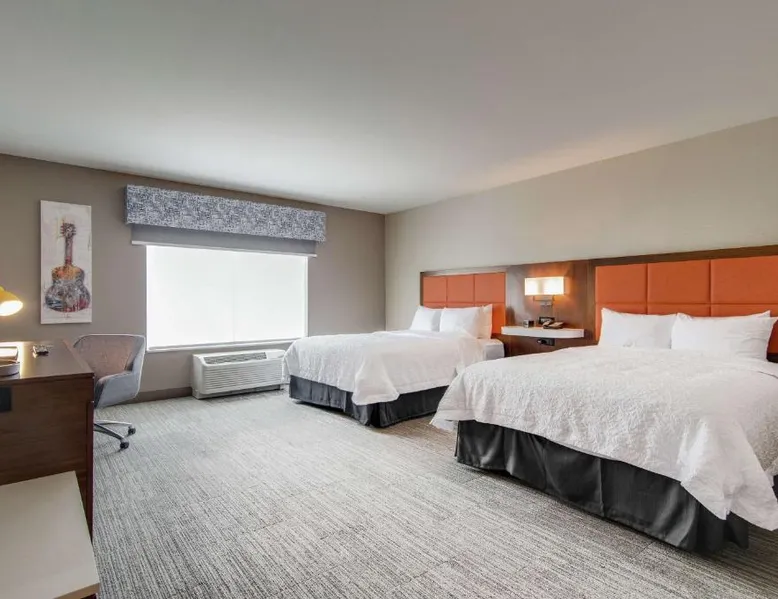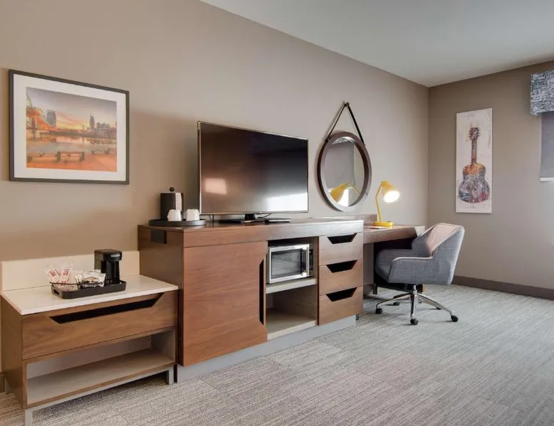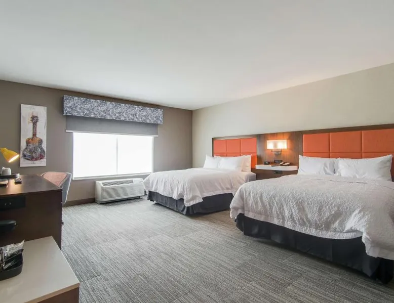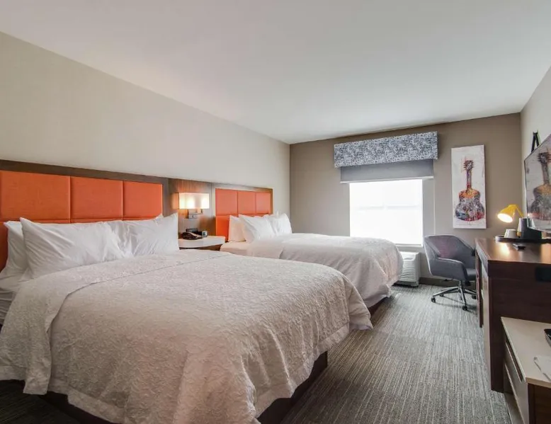 Comfortable Accommodations: Hampton Inn & Suites by Hilton Nashville North Skyline in Nashville offers air-conditioned rooms with free WiFi, tea and coffee makers, and work desks. Each room includes a refrigerator, microwave, and TV. Dining and Leisure: The modern, family-friendly restaurant serves American cuisine with gluten-free options for lunch and dinner. Guests can also enjoy the bar and indoor swimming pool. Additional facilities include a fitness room, outdoor fireplace, and outdoor seating area. Convenient Location: Located 11 mi from Nashville International Airport, the hotel is near attractions such as Fontanel Mansion (5.6 mi) and Grand Ole Opry (7.5 mi). Free on-site parking is available. Highly rated for breakfast and airport shuttle. The studio is furnished with a desk and a seating area and features air conditioning and a tea and coffee maker. The unit has 2 beds.