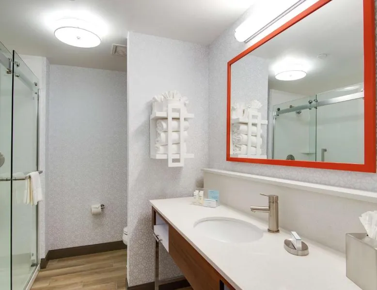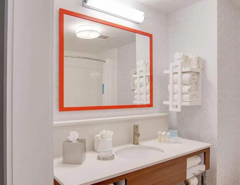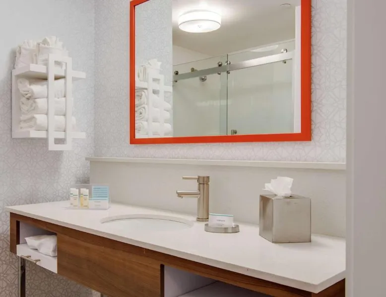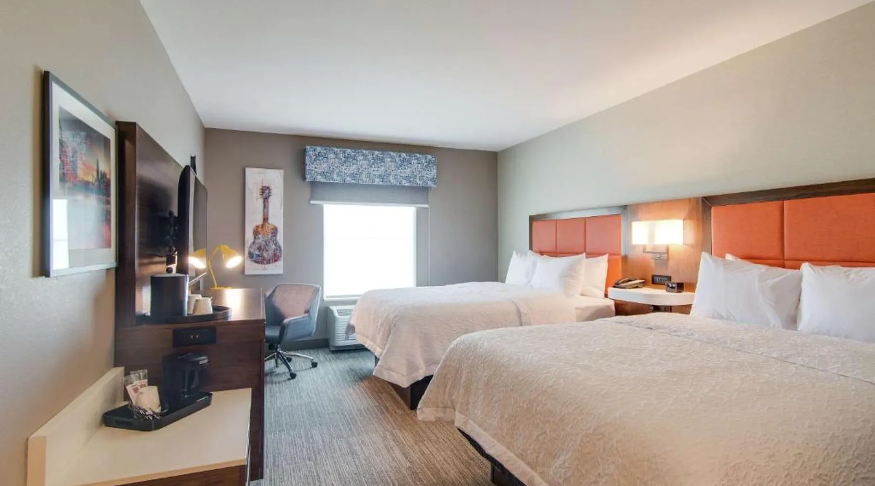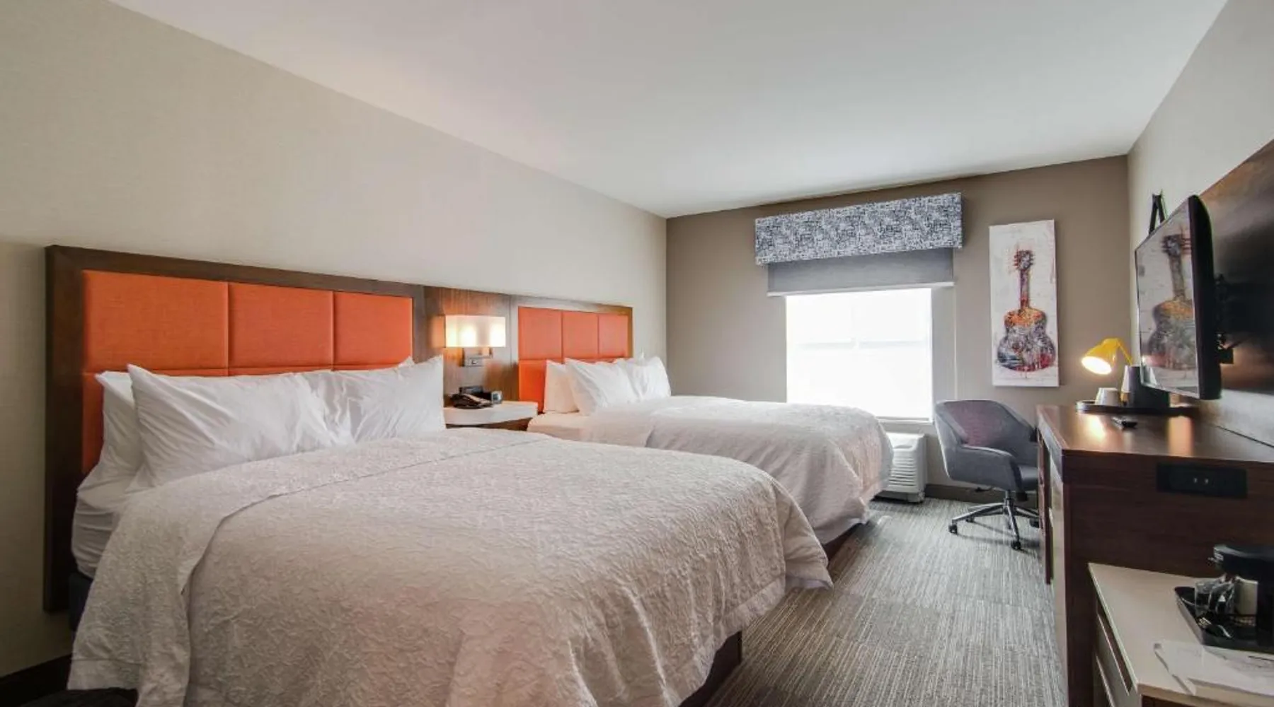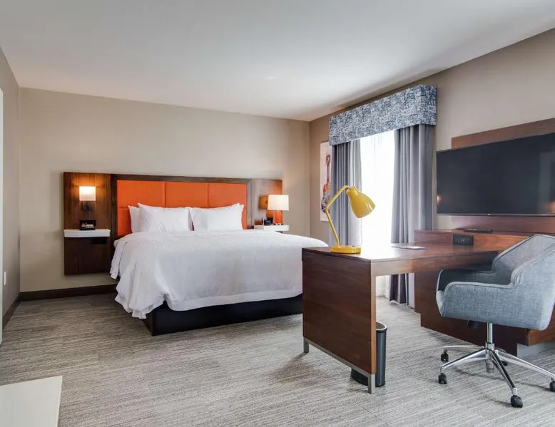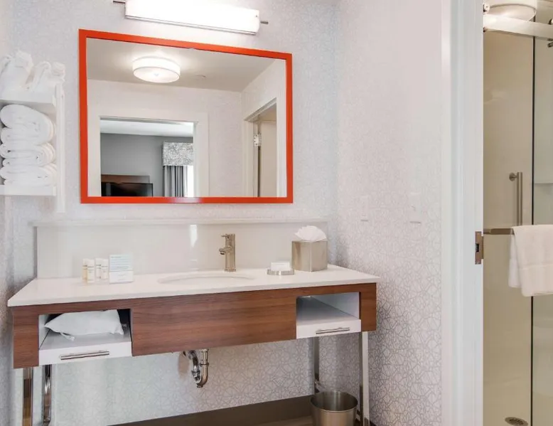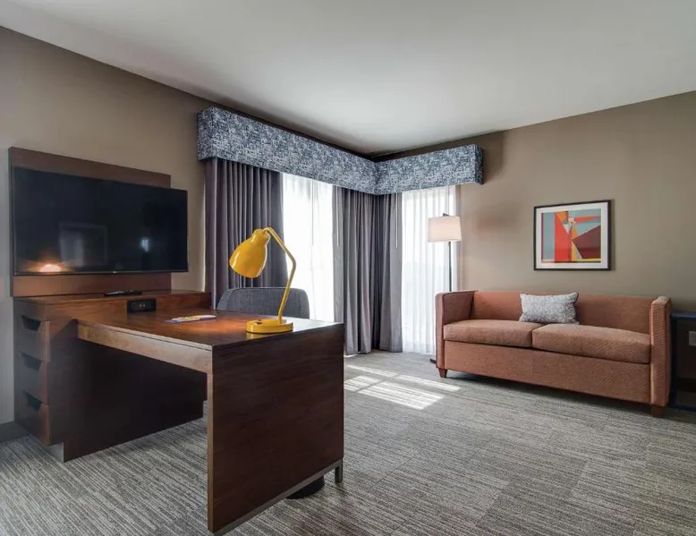 Comfortable Accommodations: Hampton Inn & Suites by Hilton Nashville North Skyline in Nashville offers air-conditioned rooms with free WiFi, tea and coffee makers, and work desks. Each room includes a refrigerator, microwave, and TV. Dining and Leisure: The modern, family-friendly restaurant serves American cuisine with gluten-free options for lunch and dinner. Guests can also enjoy the bar and indoor swimming pool. Additional facilities include a fitness room, outdoor fireplace, and outdoor seating area. Convenient Location: Located 11 mi from Nashville International Airport, the hotel is near attractions such as Fontanel Mansion (5.6 mi) and Grand Ole Opry (7.5 mi). Free on-site parking is available. Highly rated for breakfast and airport shuttle. The studio is furnished with a desk and a seating area and features air conditioning and a tea and coffee maker. The unit has 2 beds.