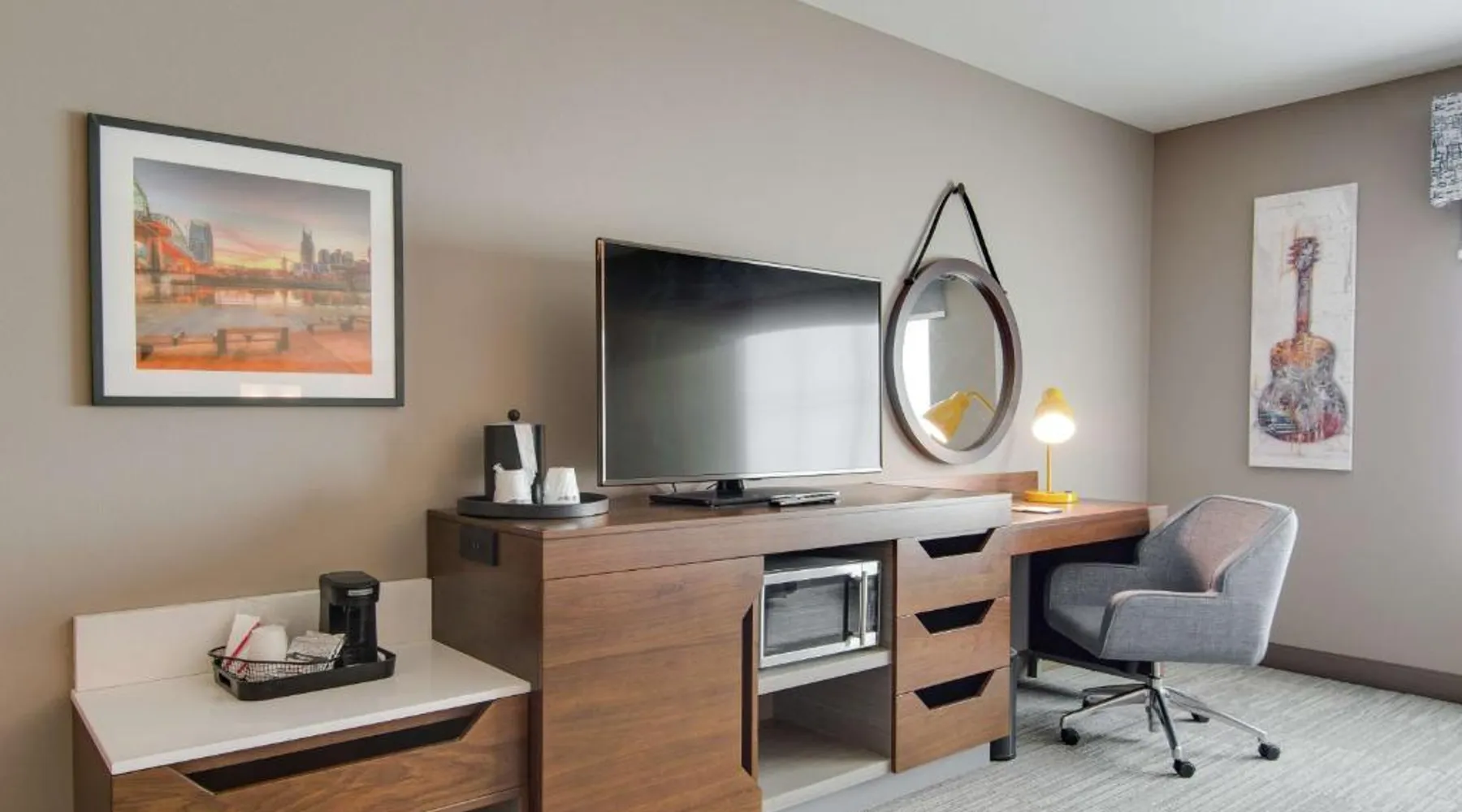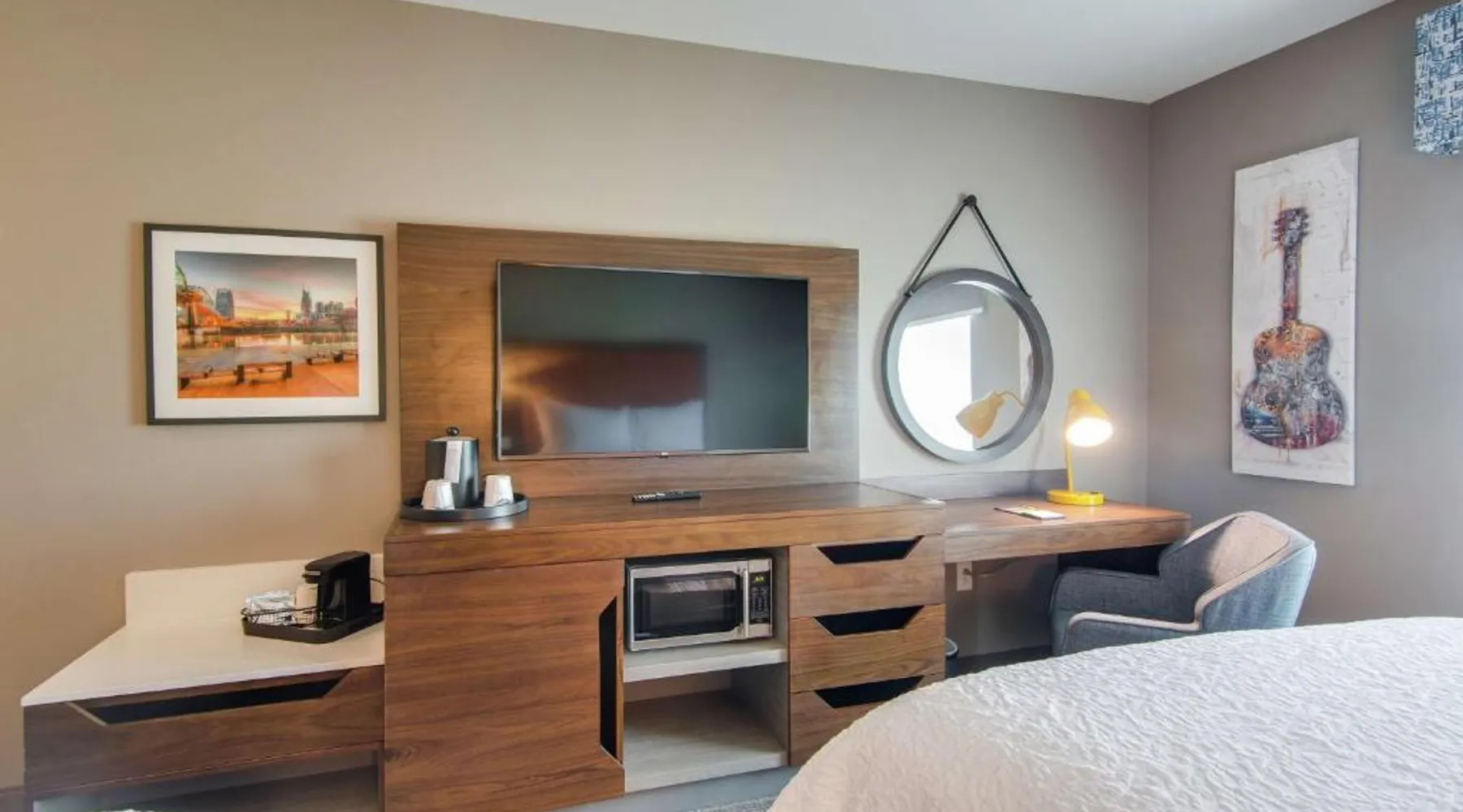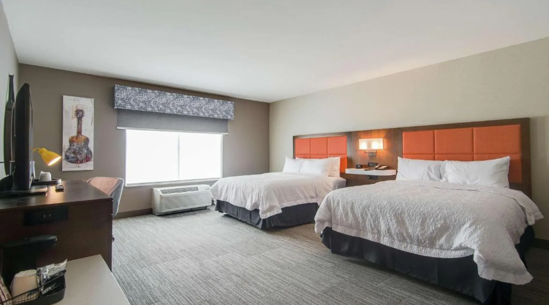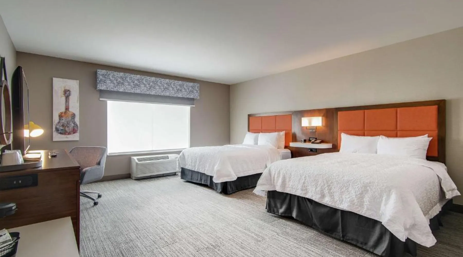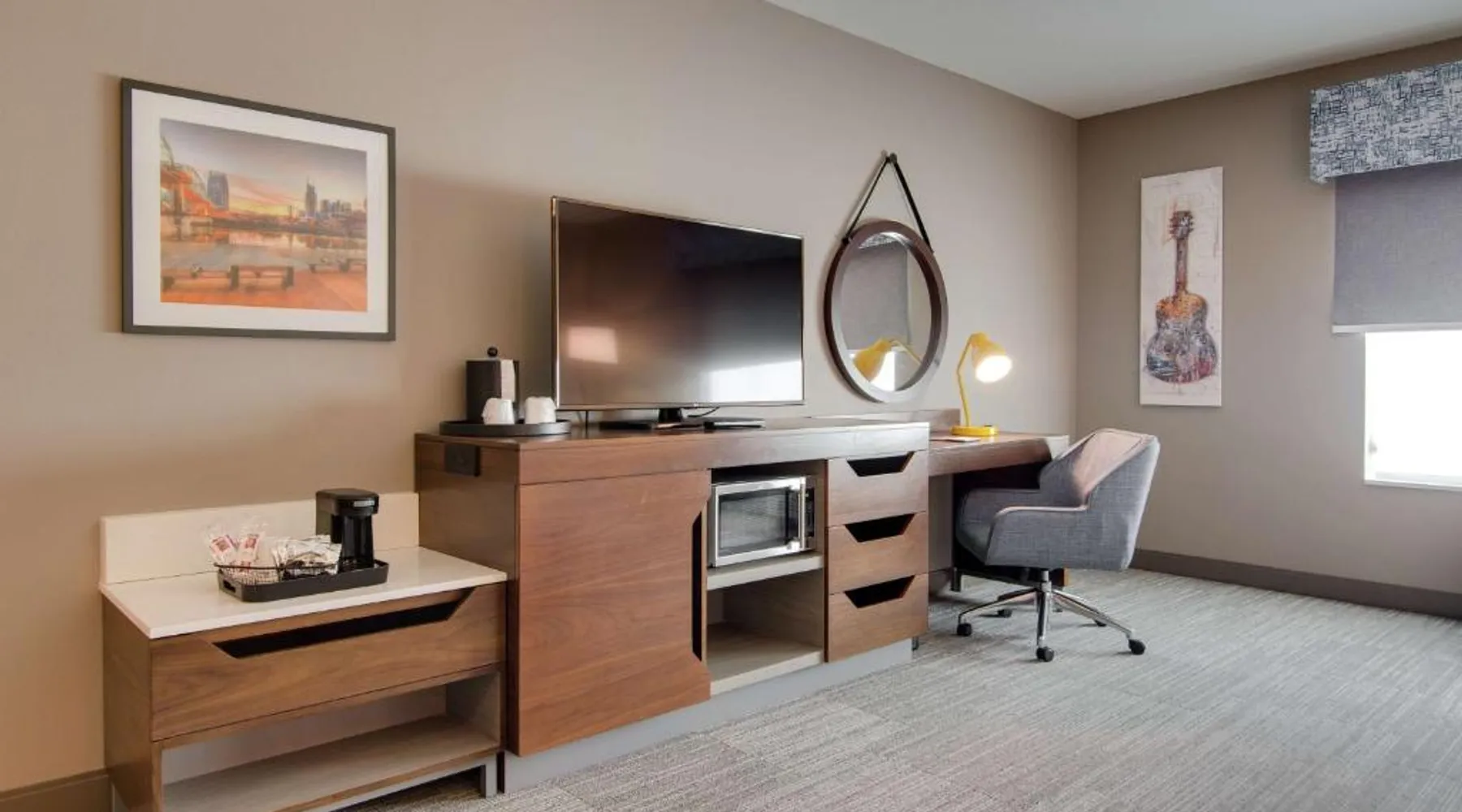 Comfortable Accommodations: Hampton Inn & Suites by Hilton Nashville North Skyline in Nashville offers air-conditioned rooms with free WiFi, tea and coffee makers, and work desks. Each room includes a refrigerator, microwave, and TV. Dining and Leisure: The modern, family-friendly restaurant serves American cuisine with gluten-free options for lunch and dinner. Guests can also enjoy the bar and indoor swimming pool. Additional facilities include a fitness room, outdoor fireplace, and outdoor seating area. Convenient Location: Located 11 mi from Nashville International Airport, the hotel is near attractions such as Fontanel Mansion (5.6 mi) and Grand Ole Opry (7.5 mi). Free on-site parking is available. Highly rated for breakfast and airport shuttle. The studio is furnished with a desk and a seating area and features air conditioning and a tea and coffee maker. The unit has 2 beds.