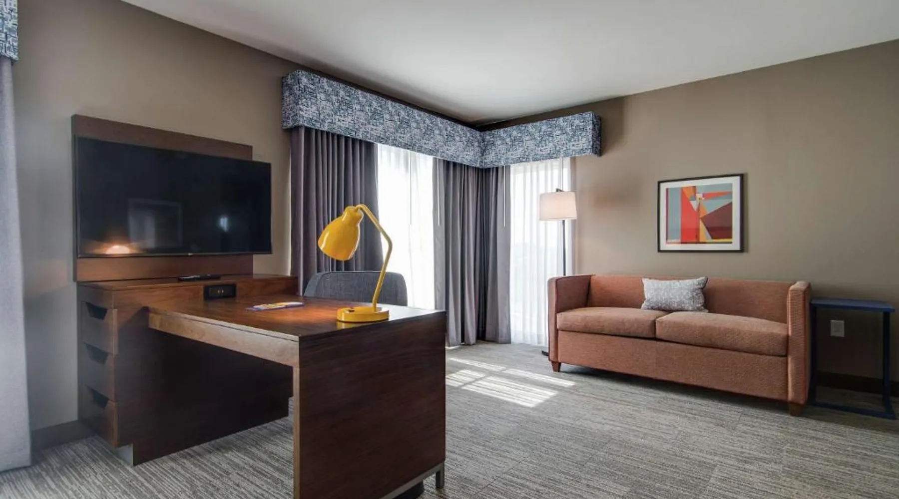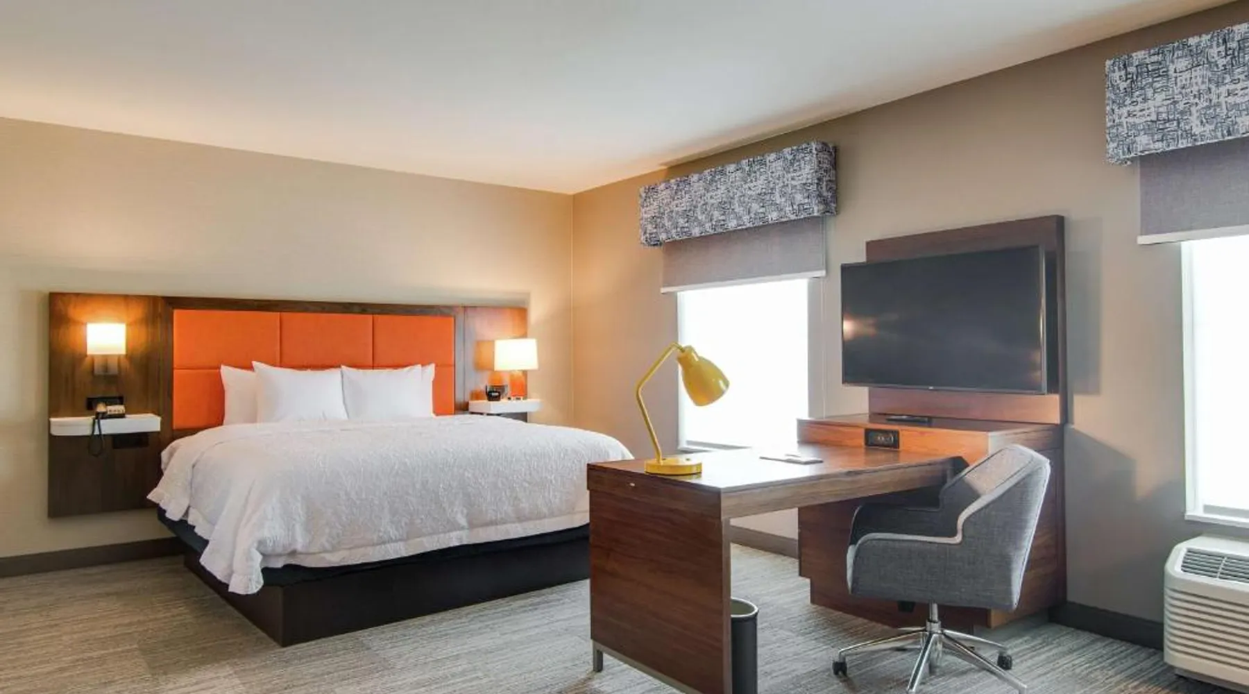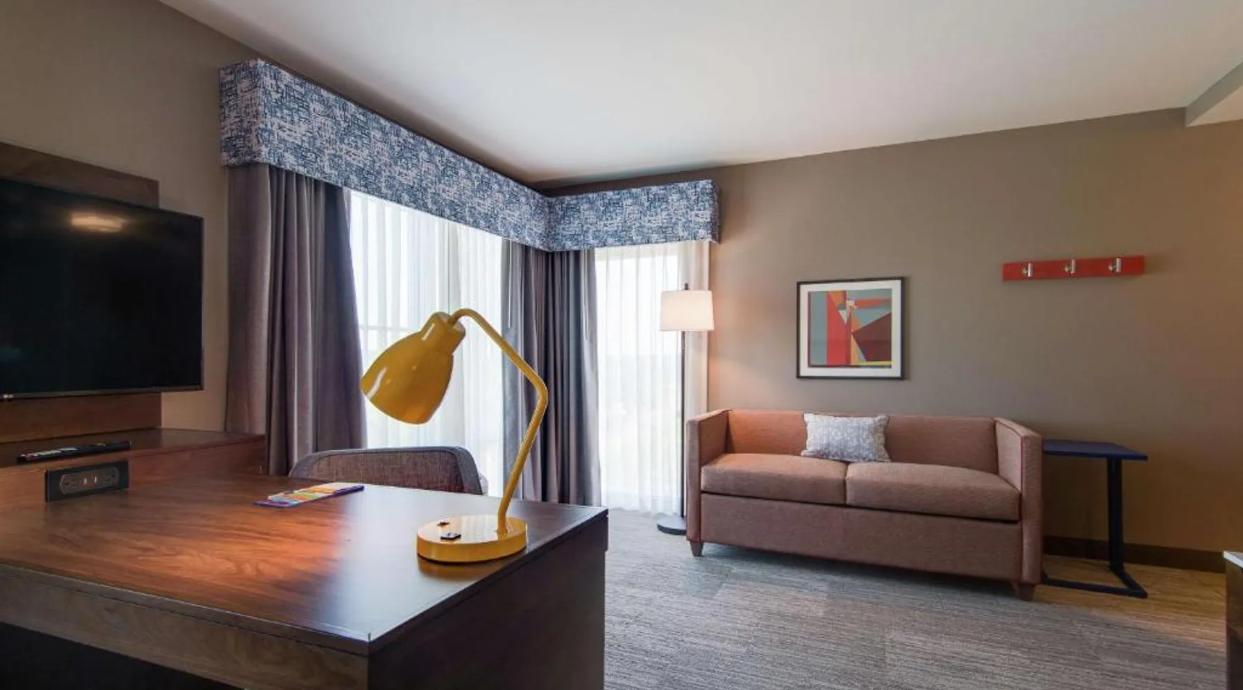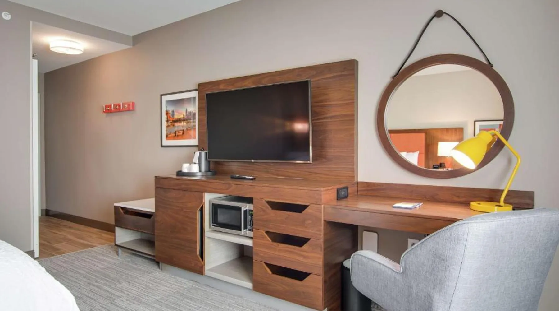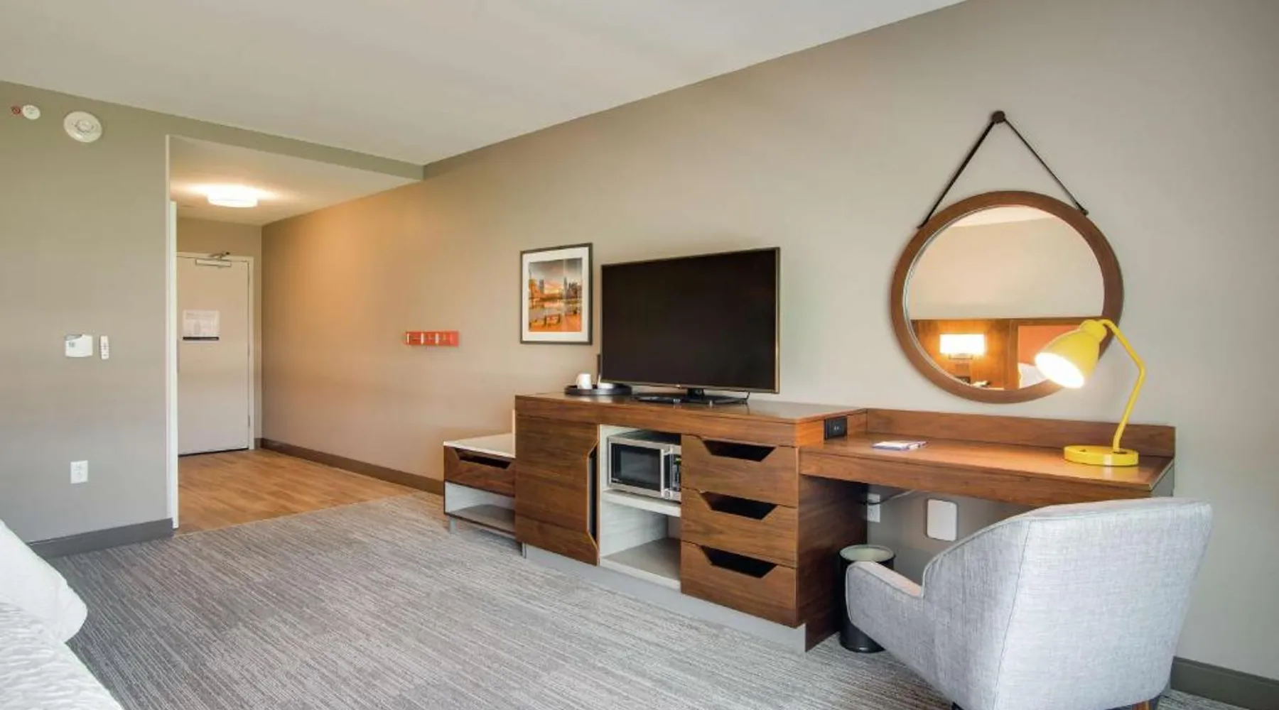 Comfortable Accommodations: Hampton Inn & Suites by Hilton Nashville North Skyline in Nashville offers air-conditioned rooms with free WiFi, tea and coffee makers, and work desks. Each room includes a refrigerator, microwave, and TV. Dining and Leisure: The modern, family-friendly restaurant serves American cuisine with gluten-free options for lunch and dinner. Guests can also enjoy the bar and indoor swimming pool. Additional facilities include a fitness room, outdoor fireplace, and outdoor seating area. Convenient Location: Located 11 mi from Nashville International Airport, the hotel is near attractions such as Fontanel Mansion (5.6 mi) and Grand Ole Opry (7.5 mi). Free on-site parking is available. Highly rated for breakfast and airport shuttle. The studio is furnished with a desk and a seating area and features air conditioning and a tea and coffee maker. The unit has 2 beds.
