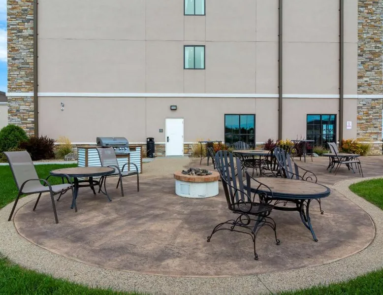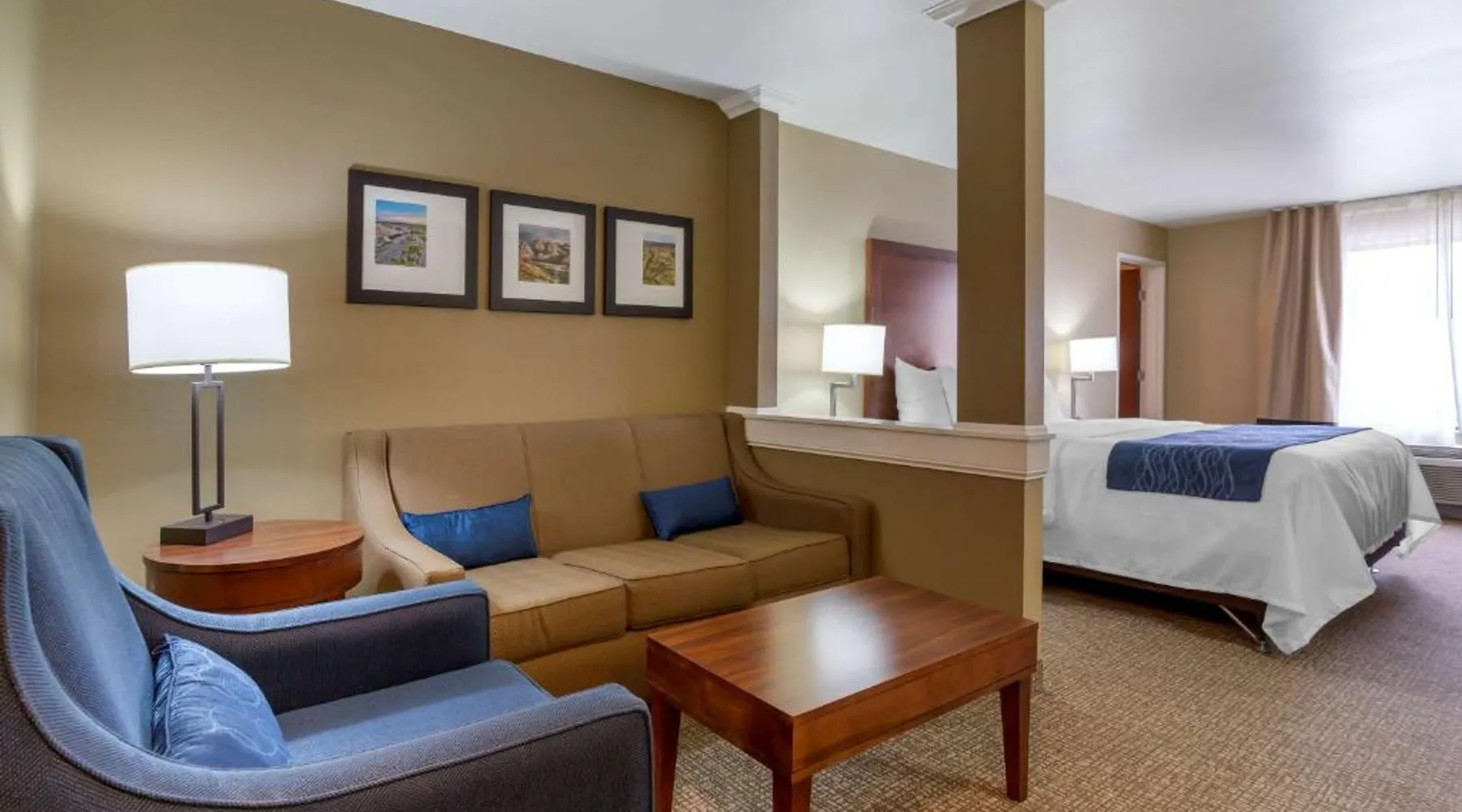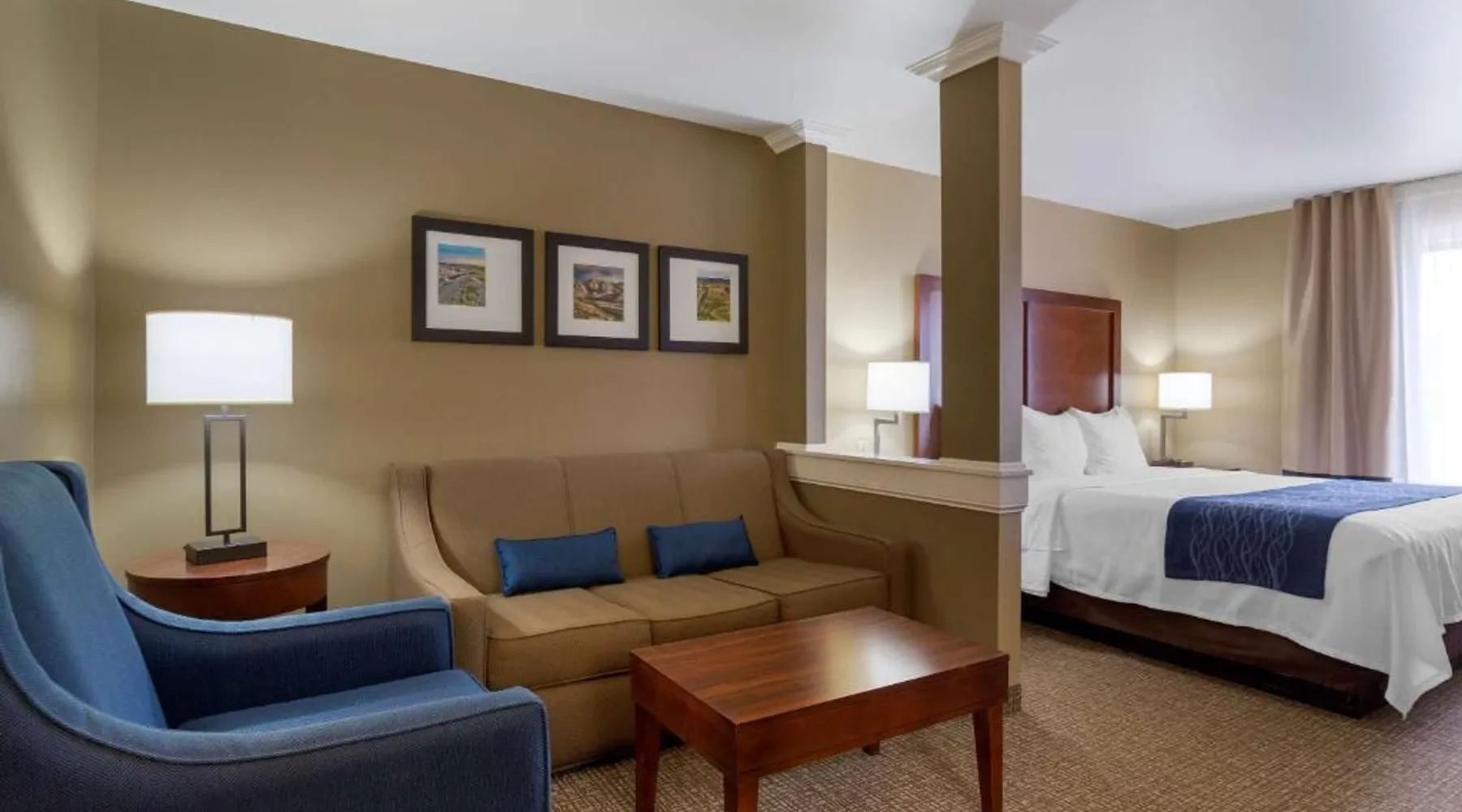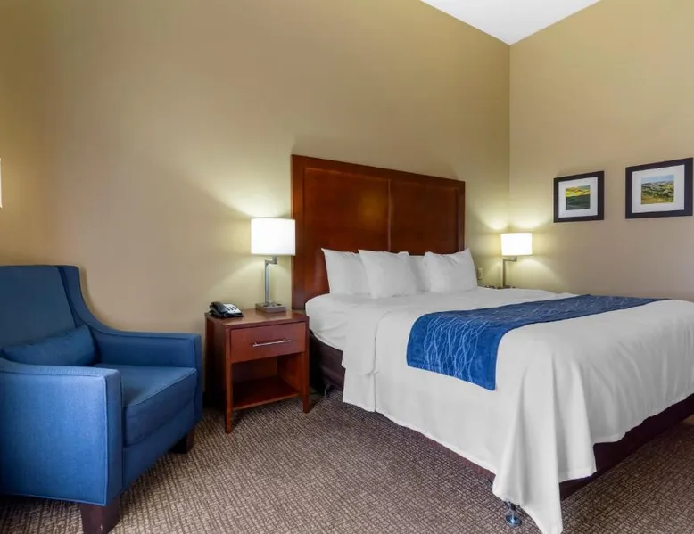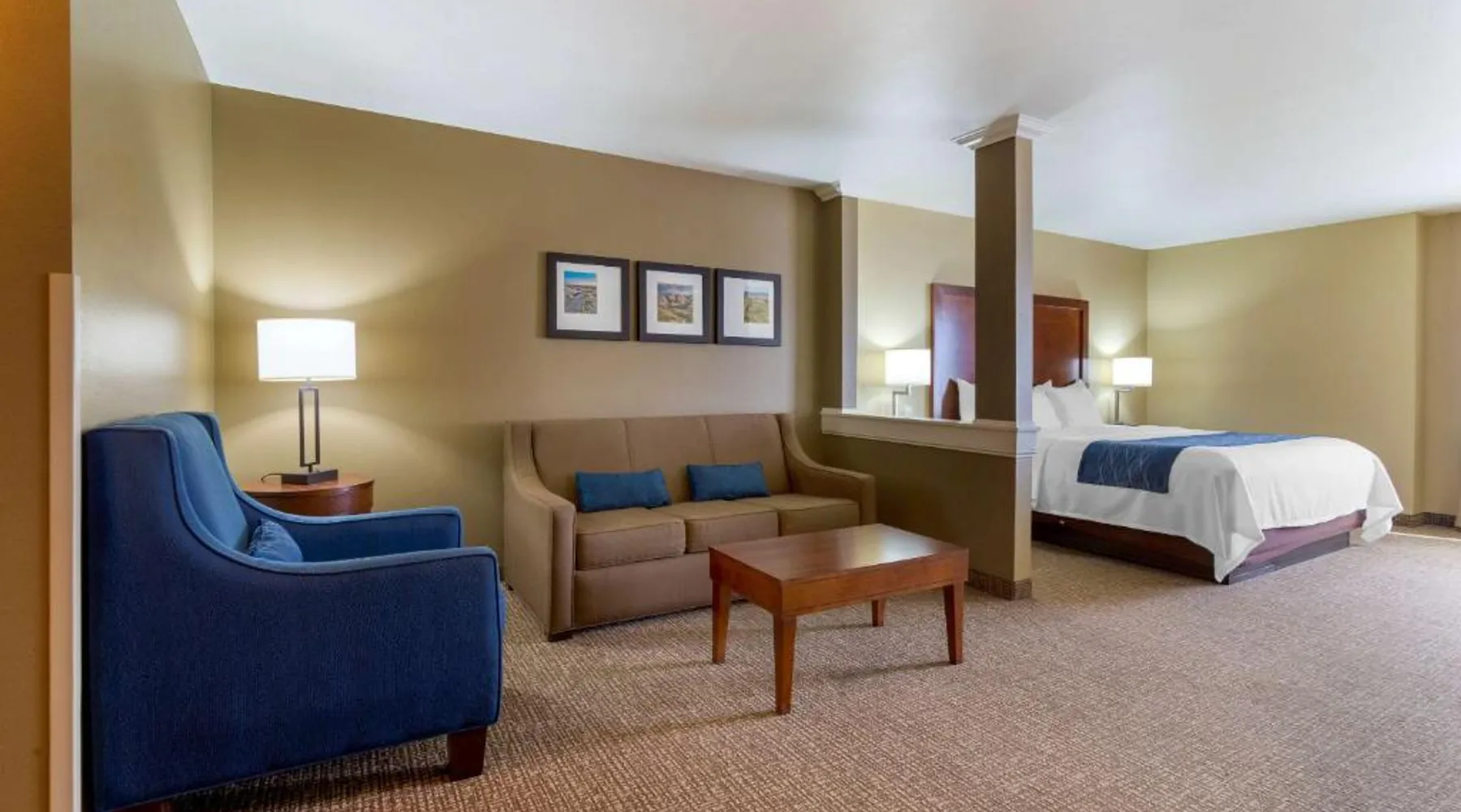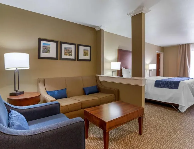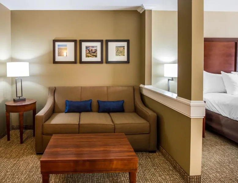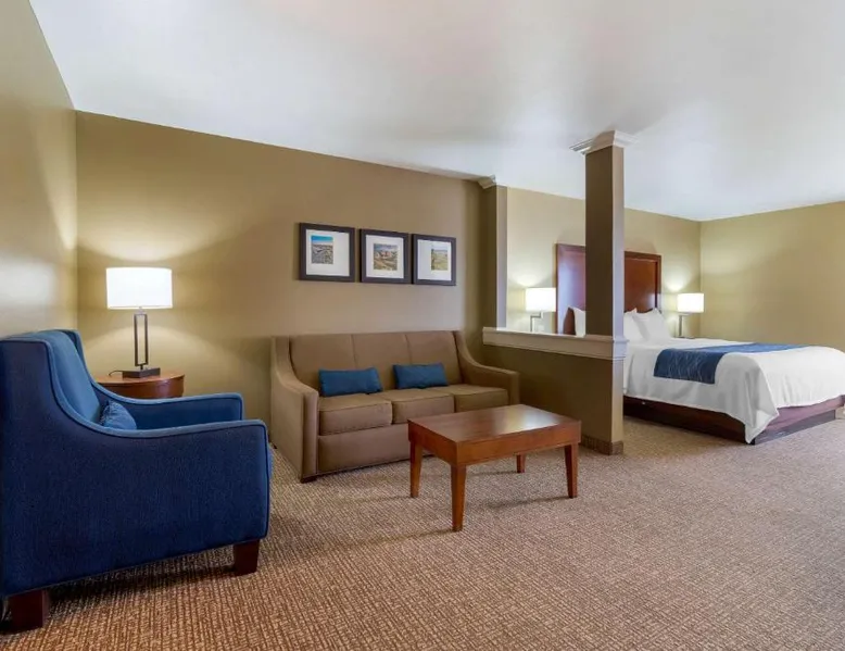 Comfortable Accommodations: Comfort Inn & Suites Mandan in Mandan offers family rooms with air-conditioning, private bathrooms, and modern amenities. Each room includes a work desk, refrigerator, microwave, TV, and free WiFi. Leisure Facilities: Guests can enjoy a fitness center, indoor swimming pool, and hot tub. Additional facilities include a lounge, outdoor fireplace, and outdoor seating area. Dining Options: A complimentary American buffet breakfast is served daily, featuring warm dishes, fresh pastries, fruits, and juice. Convenient Location: Located 9.9 mi from Bismarck Municipal Airport, the hotel is near attractions such as North Dakota State Capitol (8.7 mi), Bismarck State College (6.2 mi), and Dakota Zoo (6.8 mi). Free on-site private parking is available. A seating area with a work desk, a flat-screen cable TV and an private bathroom are featured in this air-conditioned room. A microwave, a small refrigerator and coffee-making facilities are also included.