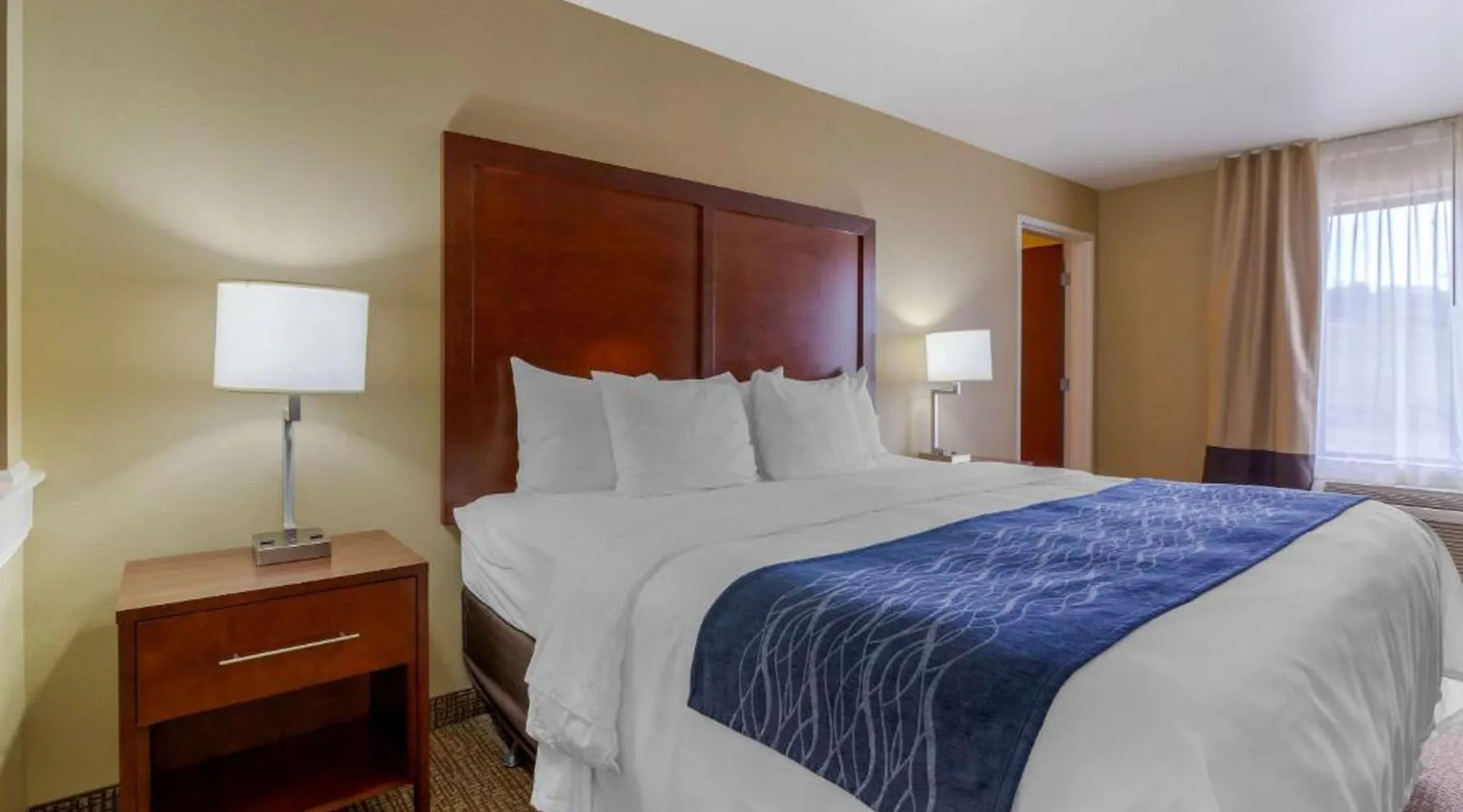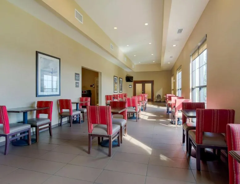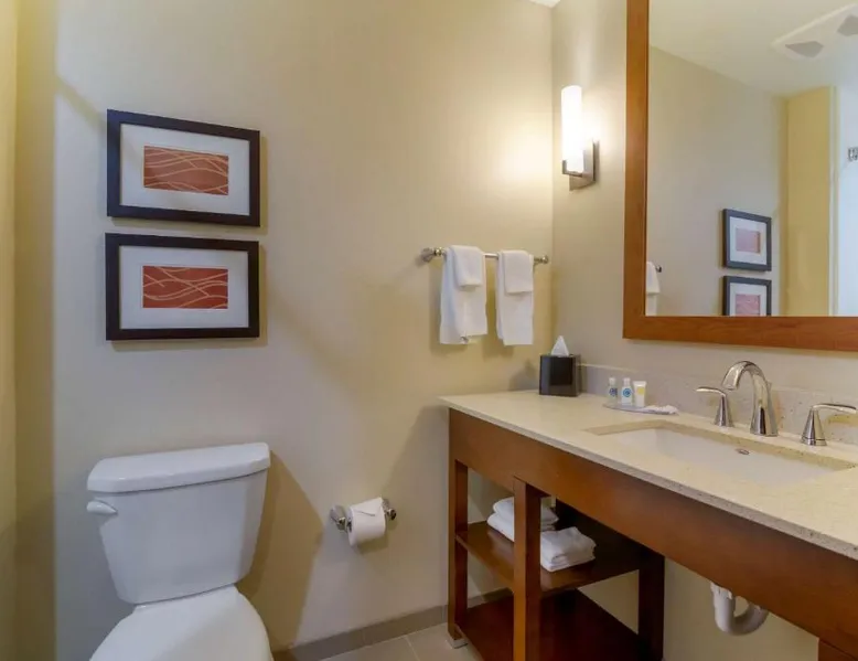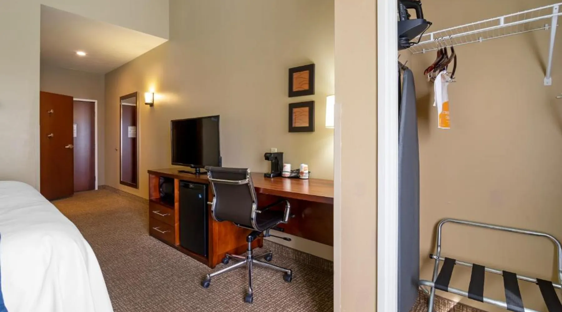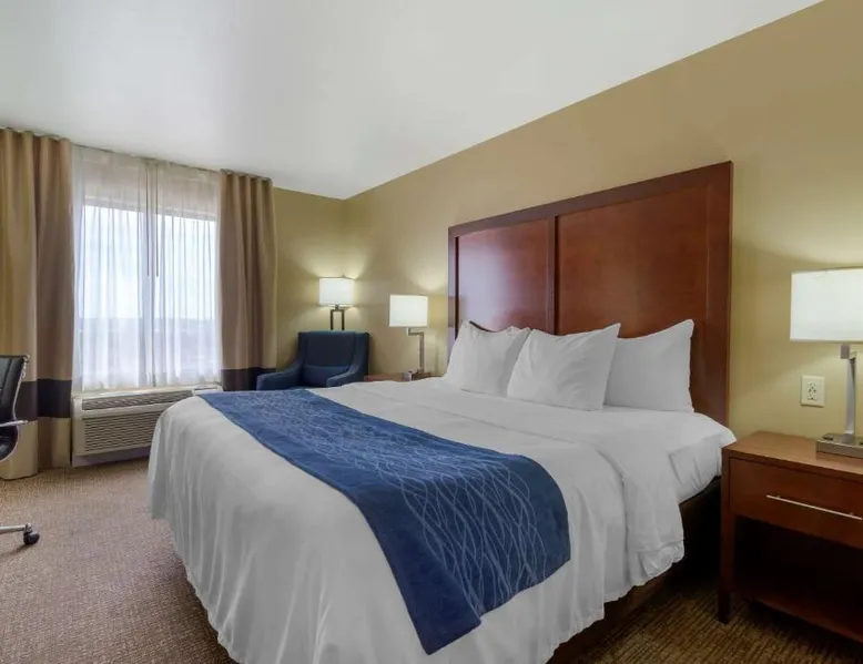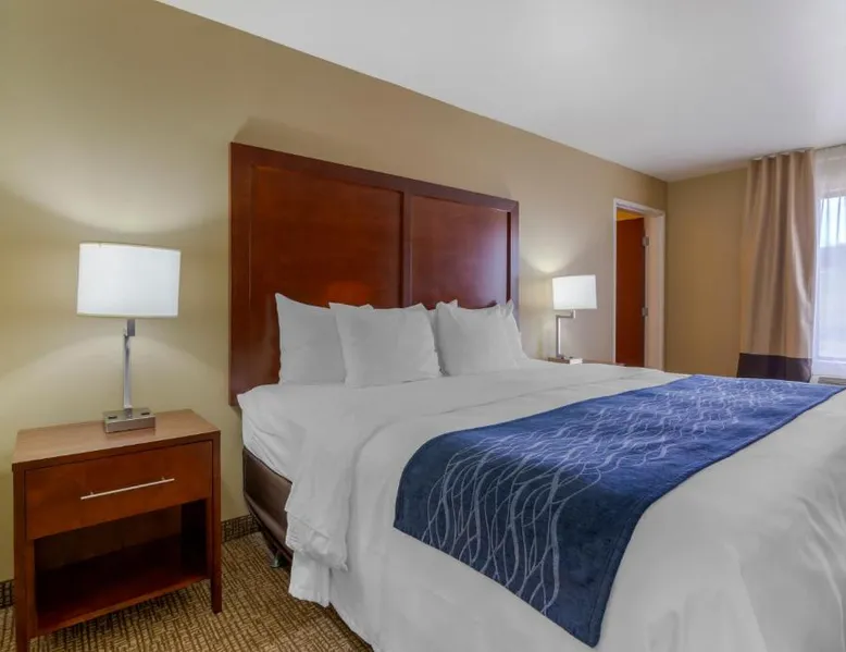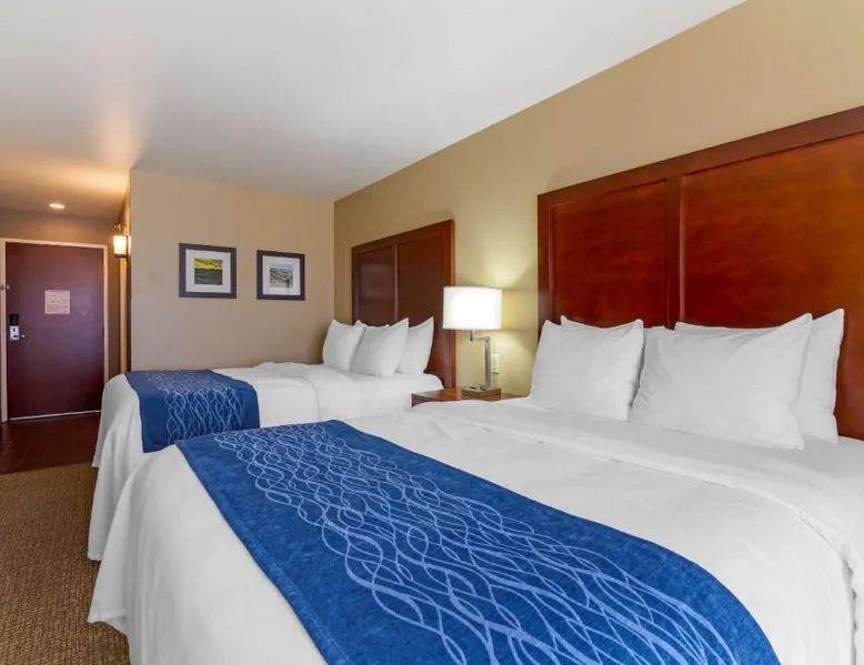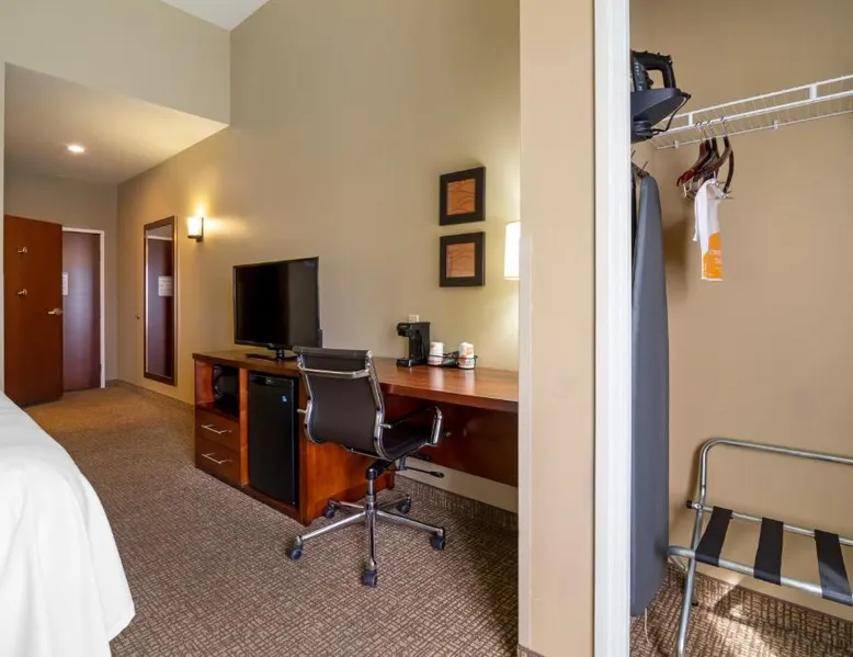 Comfortable Accommodations: Comfort Inn & Suites Mandan in Mandan offers family rooms with air-conditioning, private bathrooms, and modern amenities. Each room includes a work desk, refrigerator, microwave, TV, and free WiFi. Leisure Facilities: Guests can enjoy a fitness center, indoor swimming pool, and hot tub. Additional facilities include a lounge, outdoor fireplace, and outdoor seating area. Dining Options: A complimentary American buffet breakfast is served daily, featuring warm dishes, fresh pastries, fruits, and juice. Convenient Location: Located 9.9 mi from Bismarck Municipal Airport, the hotel is near attractions such as North Dakota State Capitol (8.7 mi), Bismarck State College (6.2 mi), and Dakota Zoo (6.8 mi). Free on-site private parking is available. A seating area with a work desk, a flat-screen cable TV and an private bathroom are featured in this air-conditioned room. A microwave, a small refrigerator and coffee-making facilities are also included.