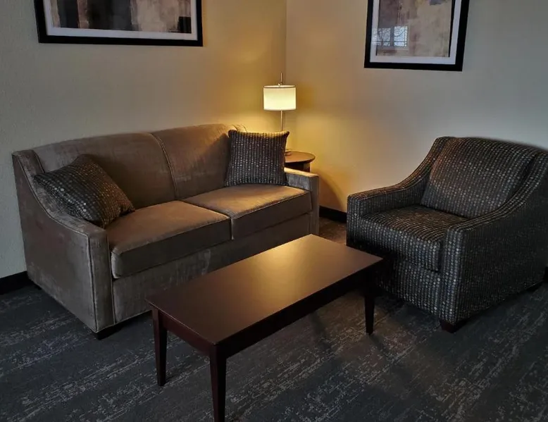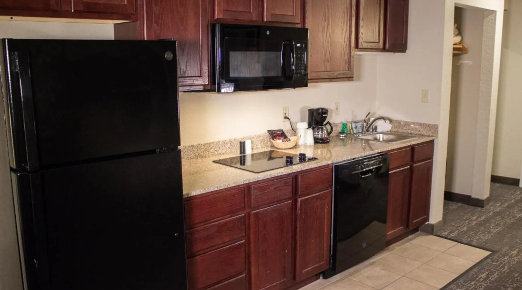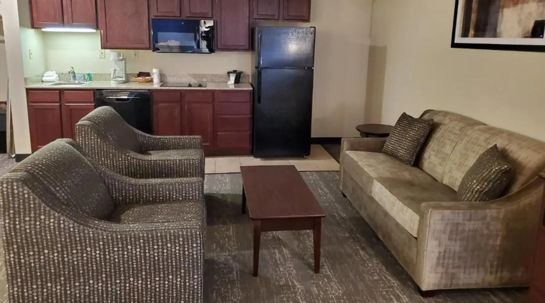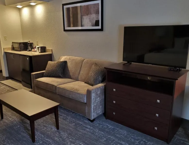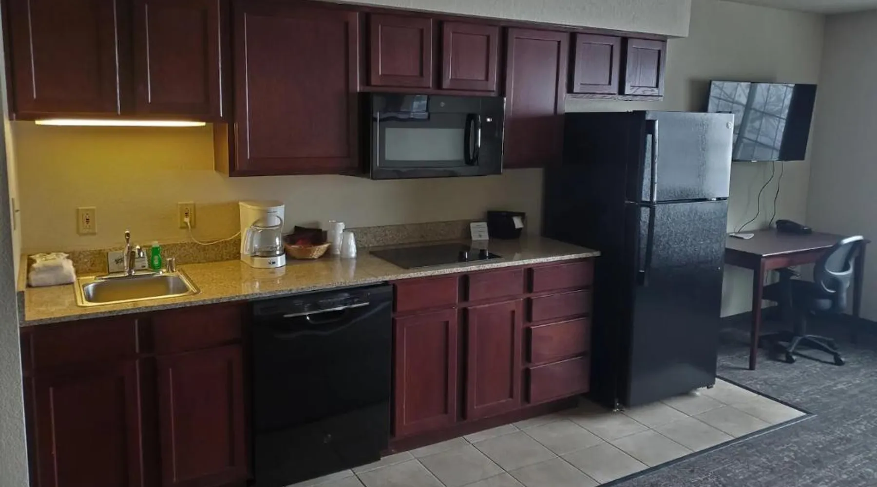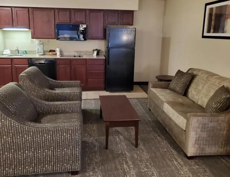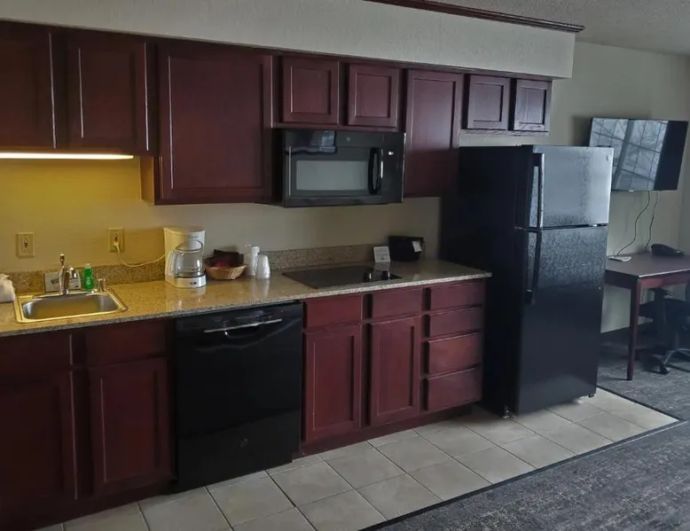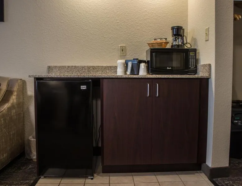 Comfortable Accommodations: Cobblestone Suites - Oshkosh in Oshkosh offers comfortable rooms with air-conditioning, kitchenettes, and free WiFi. Each room includes a tea and coffee maker, refrigerator, microwave, and free toiletries. Facilities and Services: Guests can enjoy a fitness center, bar, and swimming pool. Additional amenities include a elevator, 24-hour front desk, minimarket, business area, outdoor seating, picnic area, and games room. Free on-site private parking is available. Dining Options: A continental buffet breakfast is served daily, featuring warm dishes, fresh pastries, fruits, and juice. Location and Attractions: Located 20 mi from Outagamie County Regional Airport, the hotel is near EAA AirVenture Museum (1.9 mi), University of Wisconsin-Oshkosh (4.3 mi), and Oshkosh Public Museum (5 mi). The well-fitted kitchenette features a stovetop, a refrigerator, a microwave and a tea and coffee maker. The quadruple room offers air conditioning. The unit offers 2 beds.