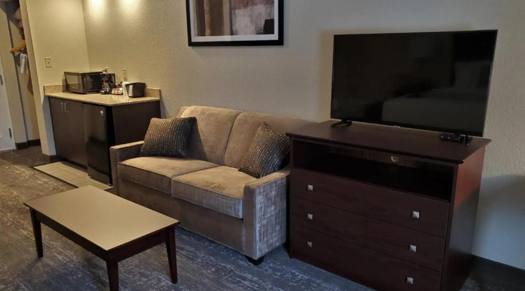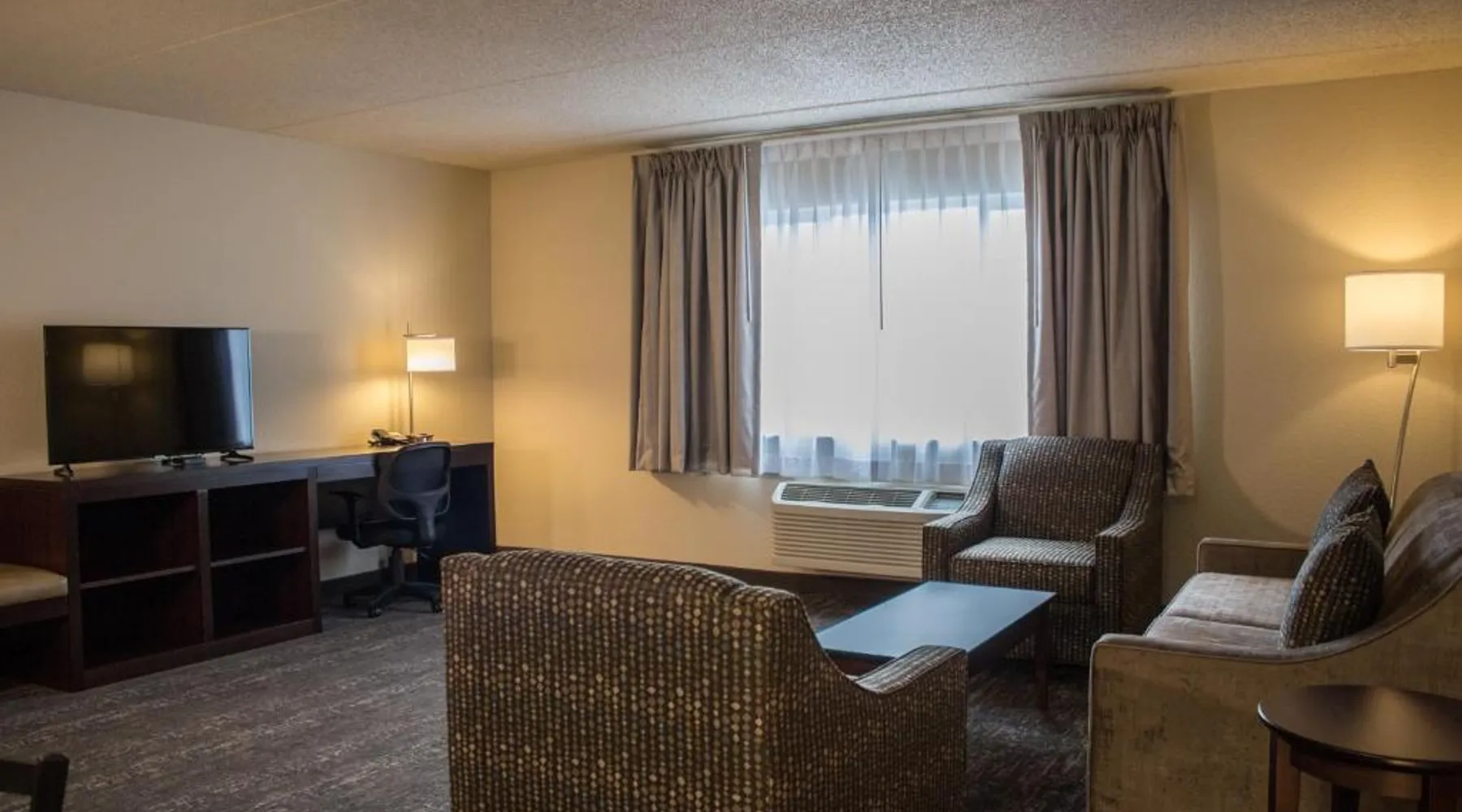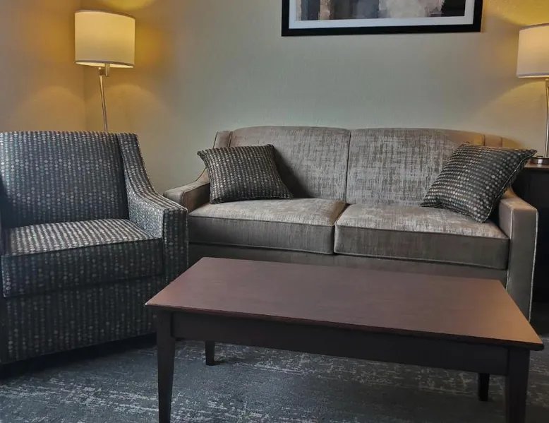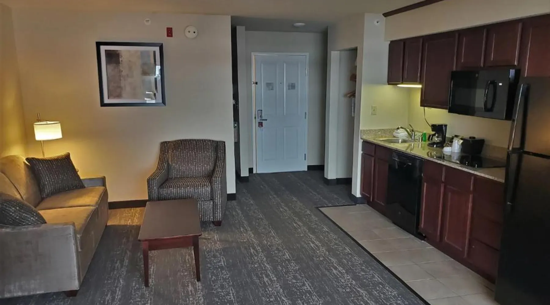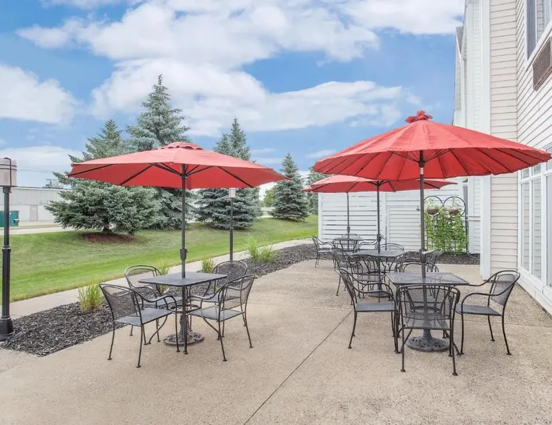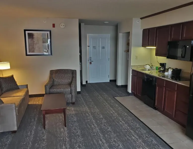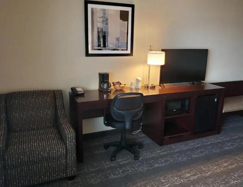 Comfortable Accommodations: Cobblestone Suites - Oshkosh in Oshkosh offers comfortable rooms with air-conditioning, kitchenettes, and free WiFi. Each room includes a tea and coffee maker, refrigerator, microwave, and free toiletries. Facilities and Services: Guests can enjoy a fitness center, bar, and swimming pool. Additional amenities include a elevator, 24-hour front desk, minimarket, business area, outdoor seating, picnic area, and games room. Free on-site private parking is available. Dining Options: A continental buffet breakfast is served daily, featuring warm dishes, fresh pastries, fruits, and juice. Location and Attractions: Located 20 mi from Outagamie County Regional Airport, the hotel is near EAA AirVenture Museum (1.9 mi), University of Wisconsin-Oshkosh (4.3 mi), and Oshkosh Public Museum (5 mi). The well-fitted kitchenette features a stovetop, a refrigerator, a microwave and a tea and coffee maker. The quadruple room offers air conditioning. The unit offers 2 beds.