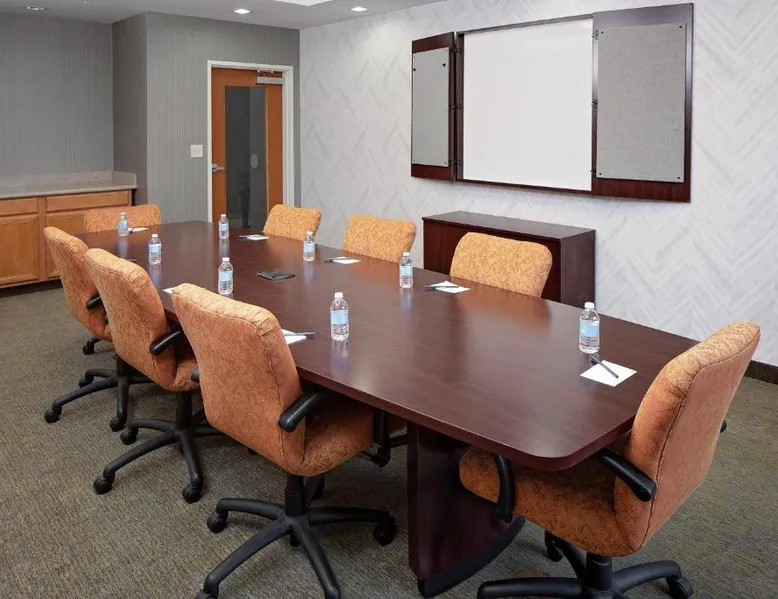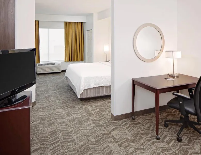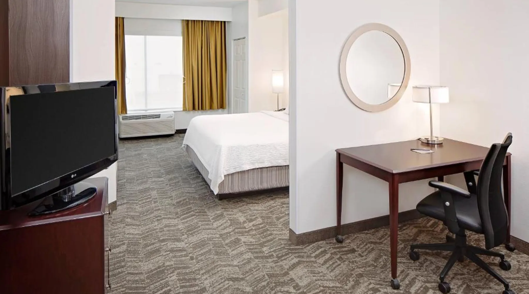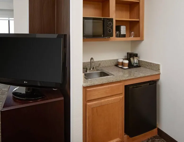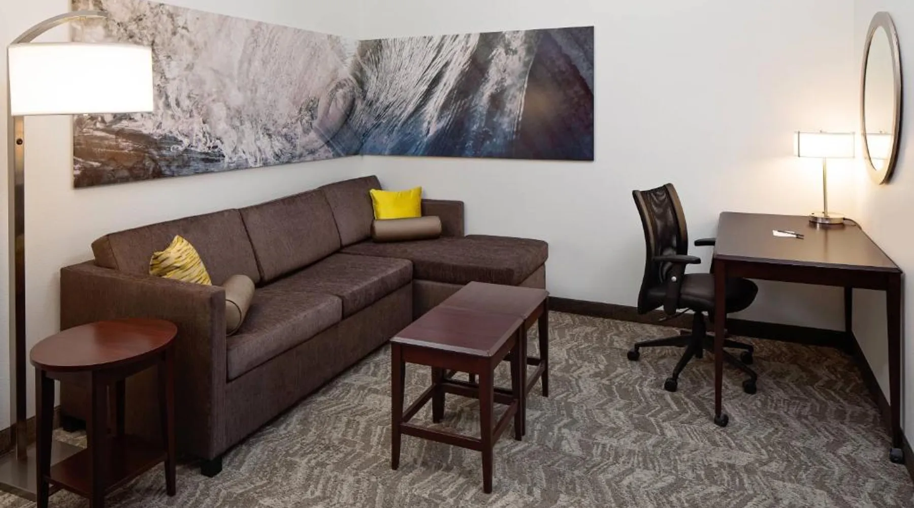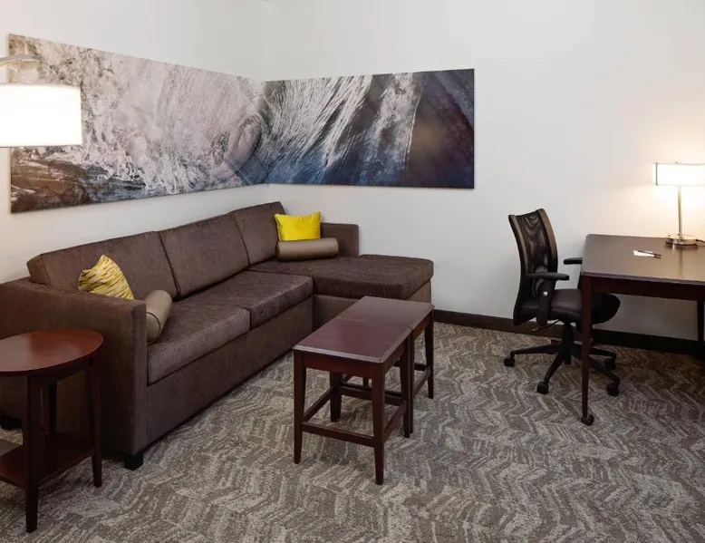 Comfortable Accommodations: SpringHill Suites by Marriott Ardmore in Ardmore offers family rooms with air-conditioning, private bathrooms, and modern amenities. Each room includes a work desk, refrigerator, and TV, ensuring a pleasant stay. Facilities and Services: Guests can enjoy a fitness center, 24-hour front desk, business area, and free on-site parking. The hotel provides a continental breakfast, a dining area, and a mini-bar for added convenience. Guest Satisfaction: Visitors appreciate the room cleanliness, the quality of the breakfast provided by the property, and the attentive staff and service support. A seating area with a flat-screen TV is featured in this room, A dining area, microwave, and refrigerator are provided.