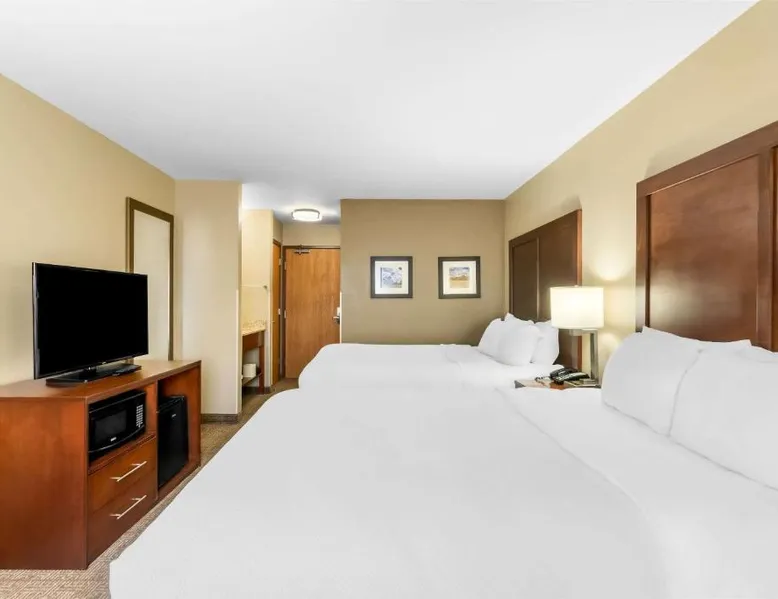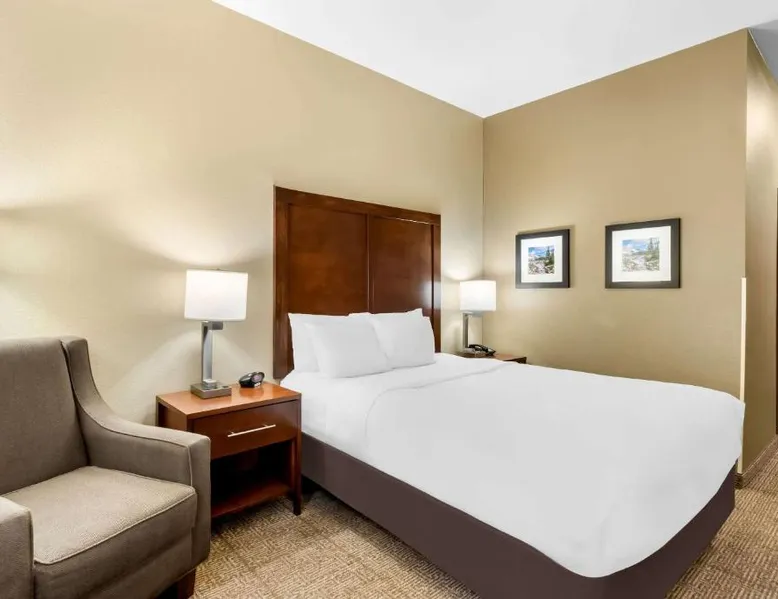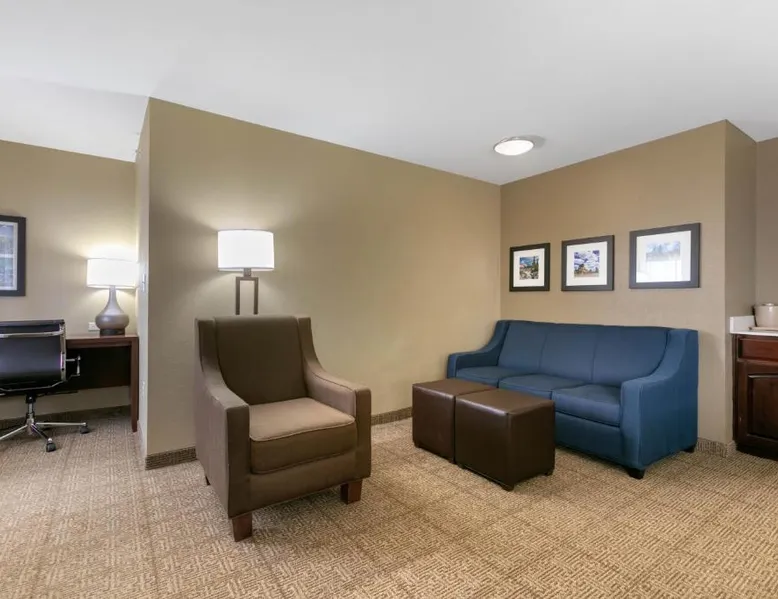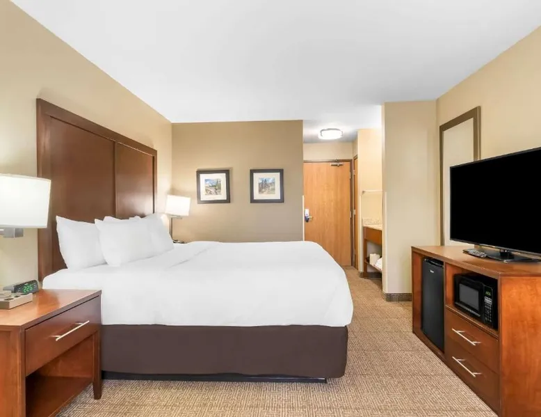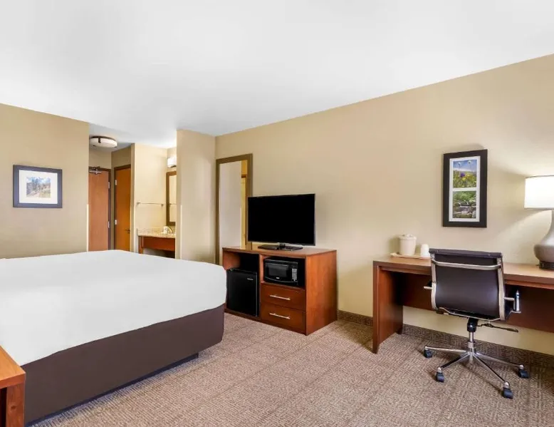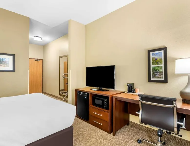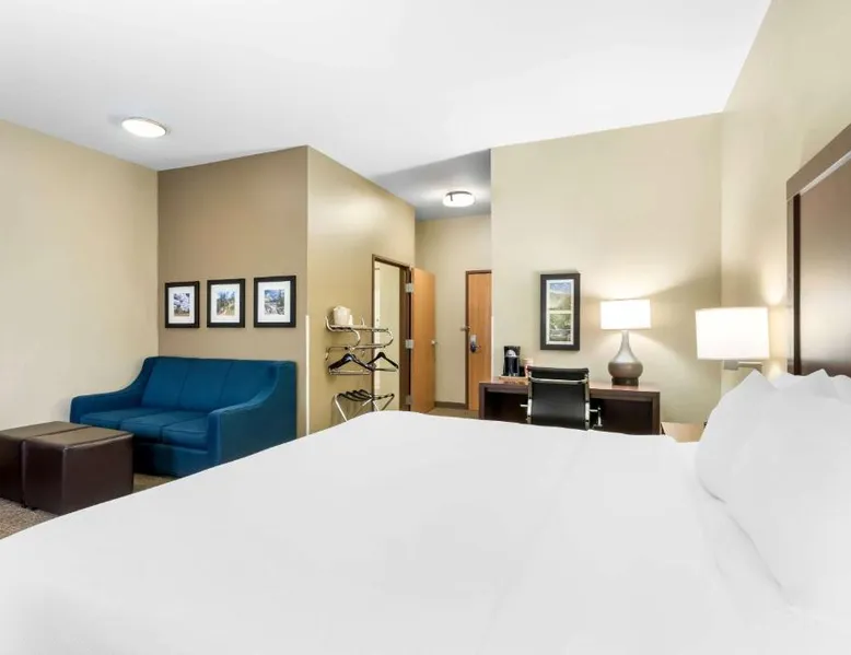 Comfortable Accommodations: Comfort Inn & Suites Near University of Wyoming in Laramie offers comfortable rooms with air-conditioning, private bathrooms, and mountain views. Each room includes a tea and coffee maker, refrigerator, work desk, and free toiletries. Exceptional Facilities: Guests enjoy an indoor swimming pool, hot tub, fitness room, and spa bath. Free WiFi is available throughout the property, ensuring connectivity. Additional amenities include a business area, outdoor seating, and picnic area. Convenient Services: The hotel provides free on-site parking, a 24-hour front desk, daily housekeeping, and express check-in and check-out services. A continental breakfast is served each morning, and the property staff and service support are highly praised by guests. Local Attractions: Located 3.1 mi from Laramie Regional Airport and 4.3 mi from War Memorial Stadium, the hotel offers easy access to local points of interest. Free Wi-Fi, a flat-screen TV, a microwave and small fridge are included in this room.